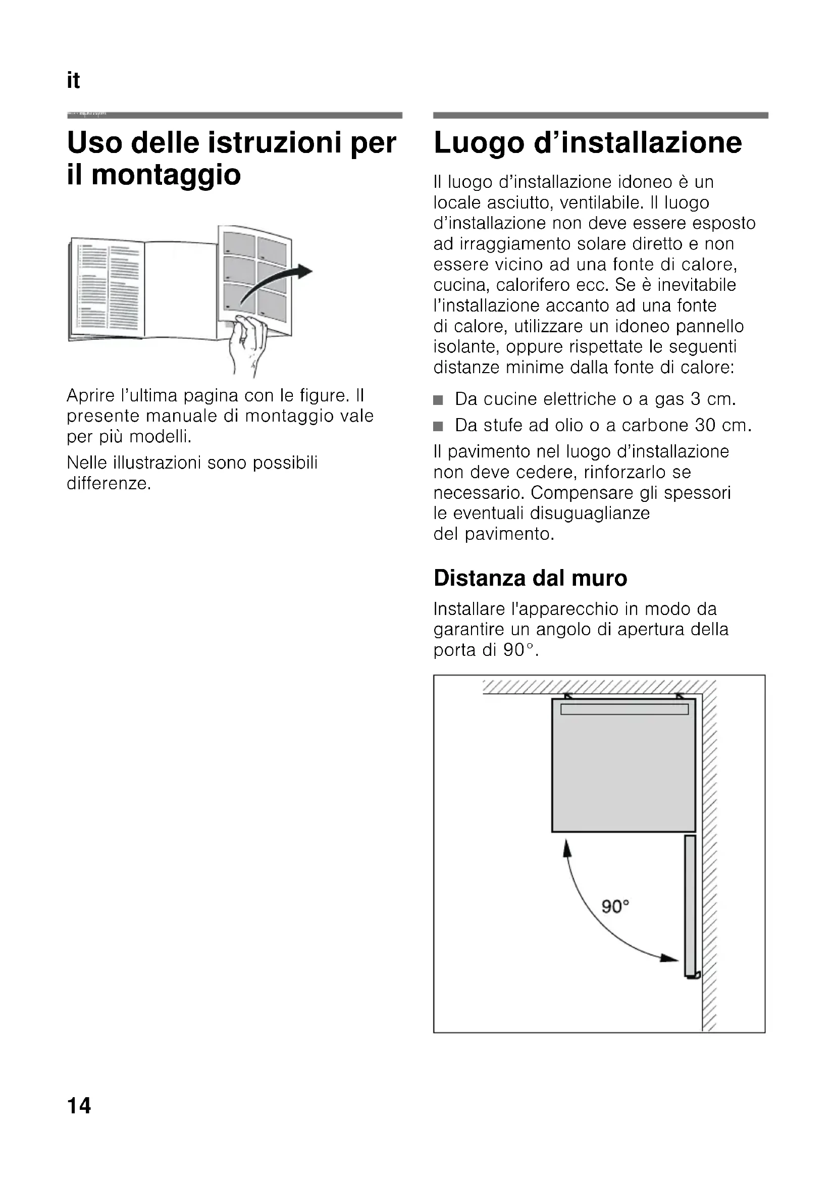 itIndic e itIs truzioni per il montaggio App are cch io ind ipe nd ente Uso delle istruzioni per il montaggio Aprire l’ultima pagina con le figure. Il presente manuale di montaggio vale per più modelli. Nelle illustrazioni sono possibili differenze. Luogo d’installazione Il luogo d’installazione idoneo è un locale asciutto, ventilabile. Il luogo d’installazione non deve essere esposto ad irraggiamento solare diretto e non essere vicino ad una fonte di calore, cucina, calorifero ecc. Se è inevitabile l’installazione accanto ad una fonte di calore, utilizzare un idoneo pannello isolante, oppure rispettate le seguenti distanze minime dalla fonte di calore: ■ Da cucine elettriche o a gas 3 cm. ■ Da stufe ad olio o a carbone 30 cm. Il pavimento nel luogo d’installazione non deve cedere, rinforzarlo se necessario. Compensare gli spessori le eventuali disuguaglianze del pavimento. Distanza dal muro Installare l'apparecchio in modo da garantire un angolo di apertura della porta di 90°.it