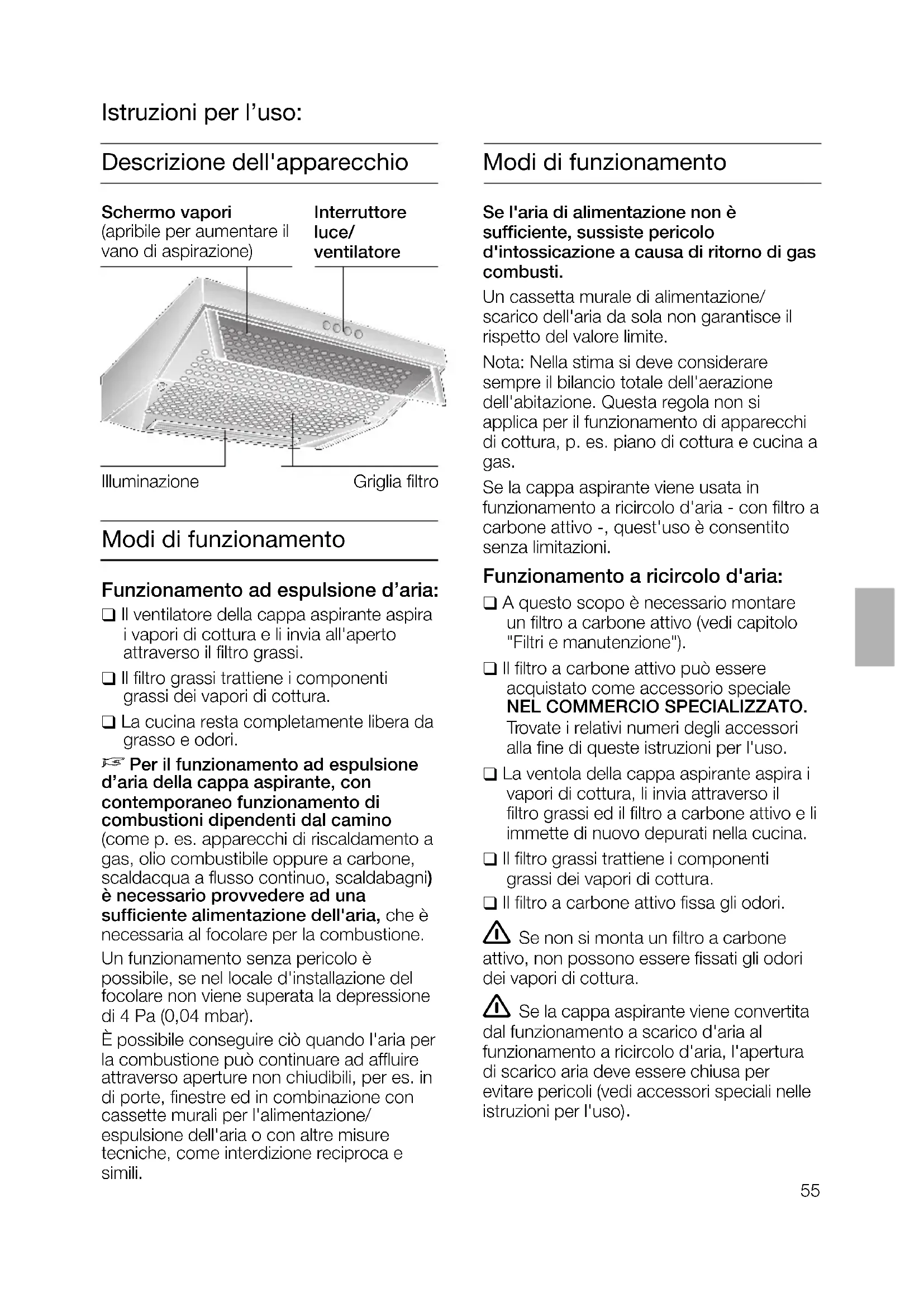 Gewicht in kg: AfvoerluchtBreedte Circulatie- lucht 50 cm 60 cm 1 motor 60 cm 2 motoren 7,0 8,0 10,0 8,0 9,0 11,0 90 cm Constructiewijzigingen in het kader van de technische ontwikkeling voorbehouden 13,0 14,055 Modi di funzionamento Se l'aria di alimentazione non è sufficiente, sussiste pericolo d'intossicazione a causa di ritorno di gascombusti.Un cassetta murale di alimentazione/scarico dell'aria da sola non garantisce ilrispetto del valore limite.Nota: Nella stima si deve considerare sempre il bilancio totale dell'aerazione dell'abitazione. Questa regola non si applica per il funzionamento di apparecchidi cottura, p. es. piano di cottura e cucina a gas. Se la cappa aspirante viene usata infunzionamento a ricircolo d'aria - con filtro acarbone attivo -, quest'uso è consentitosenza limitazioni. Funzionamento a ricircolo d'aria: ❑ A questo scopo è necessario montareun filtro a carbone attivo (vedi capitolo"Filtri e manutenzione").❑ Il filtro a carbone attivo può essere acquistato come accessorio speciale NEL COMMERCIO SPECIALIZZATO.Trovate i relativi numeri degli accessori alla fine di queste istruzioni per l'uso.❑ La ventola della cappa aspirante aspira ivapori di cottura, li invia attraverso il filtro grassi ed il filtro a carbone attivo e liimmette di nuovo depurati nella cucina.❑ Il filtro grassi trattiene i componenti grassi dei vapori di cottura.❑ Il filtro a carbone attivo fissa gli odori. Se non si monta un filtro a carbone attivo, non possono essere fissati gli odoridei vapori di cottura. Se la cappa aspirante viene convertita dal funzionamento a scarico d'aria al funzionamento a ricircolo d'aria, l'aperturadi scarico aria deve essere chiusa per evitare pericoli (vedi accessori speciali nelleistruzioni per l'uso) IlluminazioneInterruttoreluce/ventilatoreGriglia filtroSchermo vapori (apribile per aumentare ilvano di aspirazione) Descrizione dell'apparecchio Istruzioni per l’uso: Modi di funzionamento Funzionamento ad espulsione d’aria: ❑ Il ventilatore della cappa aspirante aspirai vapori di cottura e li invia all'apertoattraverso il filtro grassi.❑ Il filtro grassi trattiene i componenti grassi dei vapori di cottura.❑ La cucina resta completamente libera dagrasso e odori. Per il funzionamento ad espulsioned’aria della cappa aspirante, con contemporaneo funzionamento di combustioni dipendenti dal camino(come p. es. apparecchi di riscaldamento agas, olio combustibile oppure a carbone, scaldacqua a flusso continuo, scaldabagni)è necessario provvedere ad una sufficiente alimentazione dell'aria, che ènecessaria al focolare per la combustione.Un funzionamento senza pericolo è possibile, se nel locale d'installazione delfocolare non viene superata la depressionedi 4 Pa (0,04 mbar).È possibile conseguire ciò quando l'aria perla combustione può continuare ad affluireattraverso aperture non chiudibili, per es. indi porte, finestre ed in combinazione concassette murali per l'alimentazione/espulsione dell'aria o con altre misure tecniche, come interdizione reciproca esimili.56 Precede la prima utilizzazione Primo impiego: ❑ Questo libretto di istruzioni per l'usoèprevisto per più versioni dell'apparecchio. É possibile che sianodescritti singoli particolari della dotazio-ne, che non riguardano il Vostro appa-recchio.❑ Questa cappa aspirante è conforme allepertinenti norme di sicurezza.Le riparazioni devono essere eseguitesolo da personale specializzato.Le riparazioni non eseguite a regola d'arte possono causare pericoli graviper l'utilizzatore. Non fiammeggiare pietanze sotto la cappa aspirante.Pericolo d'incendio del filtro grassi ! se raggiunto delle fiamme. I fornelli devono essere sempre coperti con pentole. É consentito solo limitatamente (vedi capitolo "Istruzioni per il montaggio") l'usodella cappa aspirante su focolari per combustibili solidi (carbone, legna e simili).Piani di cottura a gas / Fornelli a gas Non usare tutti i fornelli contemporaneamente al massimo caricotermico per un periodo prolungato (max. 15 minuti), altrimenti sussiste il pericolo di scottature, se si tocca la superficie dell’involucro o pericolo di dannialla cappa aspirante. Nell’uso della cappaaspirante sopra un piano di cottura a gas, incaso d’utilizzazione contemporanea di tre opiù fornelli a gas, la cappa aspirante devefunzionare alla massima potenza d’aspirazione.❑ Prima di usare il nuovo apparecchio, leg-gete attentamente le istruzioni per l'uso.Esse contengono informazioni importantiper la Vostra sicurezza, e anche per l'usoe la manutenzione dell'apparecchio.❑ Conservate bene il libretto delle istruzioniper l'uso e il montaggio, per un eventualesuccessivo proprietario. Se l'apparecchio è danneggiato, non dovete metterlo in funzione. L'allacciamento e la messa in funzione devono essere eseguiti solo da un tecnico. Se il cavo di alimentazione di questo apparecchio viene danneggiato, per evitarepericoli deve essere sostituito dalla casaproduttrice, dal suo servizio assistenza clienti, oppure da una persona specializzata. Smaltire il materiale d'imballaggio secondo le norme (vedi capitolo "Istruzioniper il montaggio"). Questa cappa aspirante è destinata solo all’uso domestico. Usare la cappa aspirante solo con le lampadine avvitate. Le lampadine fulminate dovrebbero essere sostituite subito, per evitare unsovraccarico sulle altre lampadine. Non usare mai la cappa aspirante senza filtro grassi.. Grassi e olio surriscaldati possono infiammarsi facilmente.Cucinare perciò pietanze con grassi oppurecon olio, p. es. le patatine fritte, solo sottocontrollo.57 Uso della cappa aspirante Per eliminare nel modo più efficace i vapori di cottura:
