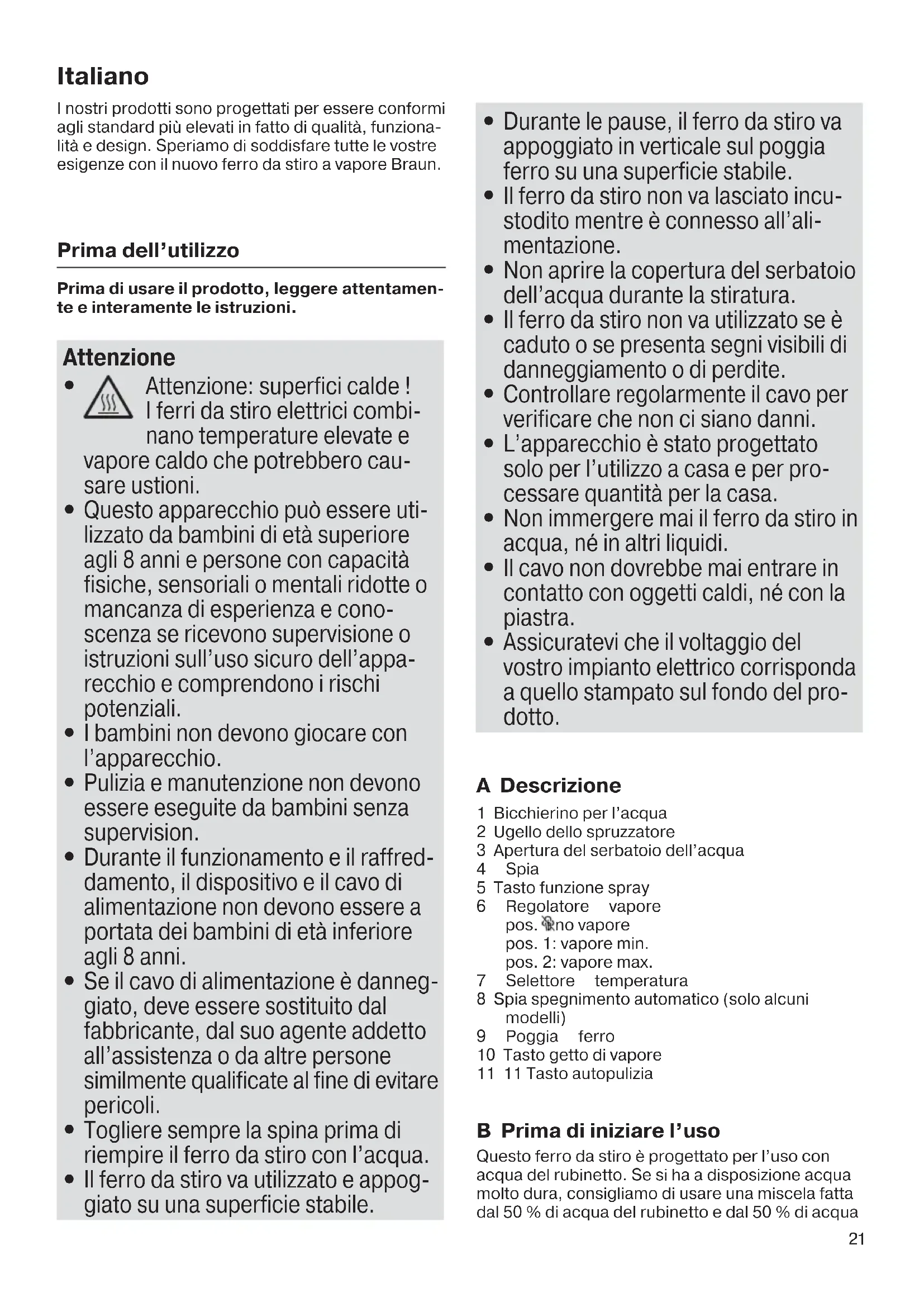 Attenzione: superfici calde ! I ferri da stiro elettrici combi- nano temperature elevate e vapore caldo che potrebbero cau- sare ustioni.