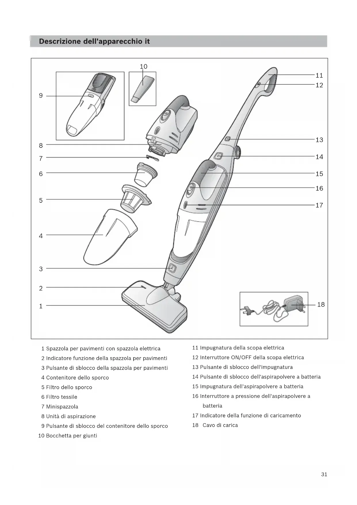 1 Spazzola per pavimenti con spazzola elettrica 2 Indicatore funzione della spazzola per pavimenti 3 Pulsante di sblocco della spazzola per pavimenti 4 Contenitore dello sporco 5 Filtro dello sporco 6 Filtro tessile 7 Minispazzola 8 Unità di aspirazione 9 Pulsante di sblocco del contenitore dello sporco 10 Bocchetta per giunti 11 Impugnatura della scopa elettrica 12 Interruttore ON/OFF della scopa elettrica 13 Pulsante di sblocco dell'impugnatura 14 Pulsante di sblocco dell'aspirapolvere a batteria 15 Impugnatura dell'aspirapolvere a batteria 16 Interruttore a pressione dell'aspirapolvere a batteria 17 Indicatore della funzione di caricamento 18 Stazione di carica 19 Supporto a pavimento della stazione di carica Descrizione dell'apparecchio it Cavo di carica32