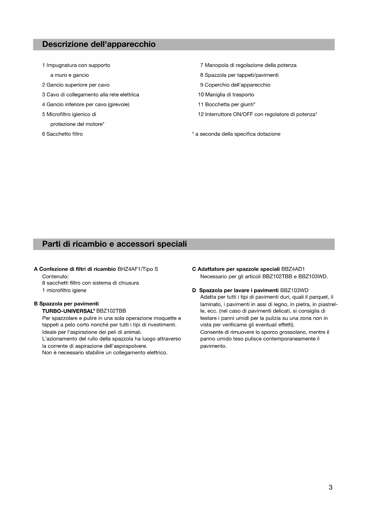 BBZ4AD13 Descrizione dell'apparecchio Parti di ricambio e accessori speciali 1 Impugnatura con supporto a muro e gancio 2 Gancio superiore per cavo 3 Cavo di collegamento alla rete elettrica 4 Gancio inferiore per cavo (girevole) 5 Microfiltro igienico di protezione del motore* 6 Sacchetto filtro 7 Manopola di regolazione della potenza 8 Spazzola per tappeti/pavimenti 9 Coperchio dell'apparecchio 10 Maniglia di trasporto 11 Bocchetta per giunti* 12 Interruttore ON/OFF con regolatore di potenza*