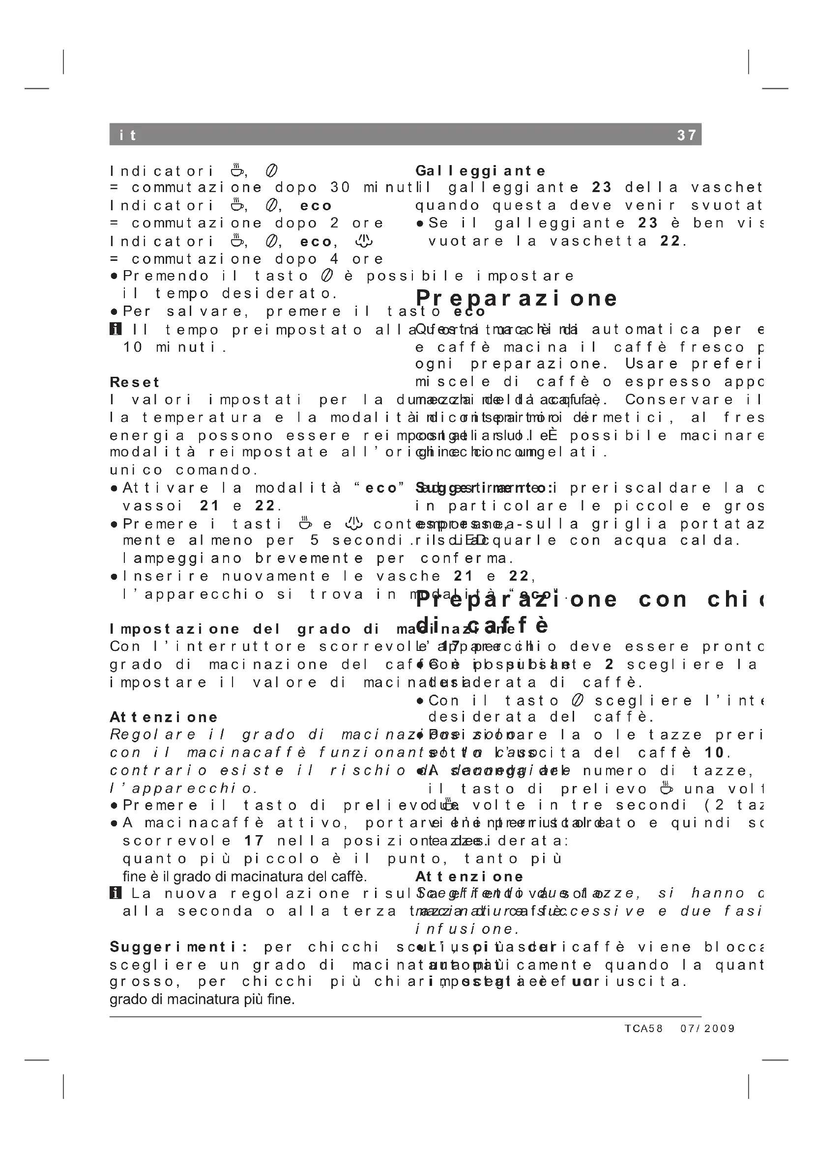 Guasto Causa Rimedio 555Lampeggiano,anche seilcontenitoredeichicchi dicaffèèpieno. Ilmacinacaffènonèancora completamentepieno. Premereancoraunavoltail tastodiprelievo4. Prelievoacquacaldao vaporeimpossibile. Iltubodelgettodi schiumatura9èotturato. Pulireiltubodelgettodi schiumatura9. Troppopocaschiumao schiumatroppoliquida. Iltubodelgettodi schiumatura9èsporco. Pulireiltubodelgettodi schiumatura9. Valvolina9gotturata oppuremanopola9° otturata. Eliminaretuttiipossibili residuidilattedallesingole parti. Lattenonadatto. Usarelattefreddoconuna percentualedigrassidel 1,5%. Ilcaffèfuoriesceagocce. Gradodimacinaturatroppo fine. Caffèinpolveretroppofine. Aumentareilgradodi macinatura.Usarecaffè macinatopiùgrosso. Se non è possibile rimediare ai guasti, chiamare il numero verde. Soluzione di piccoli guasti43 TCA5807/2009