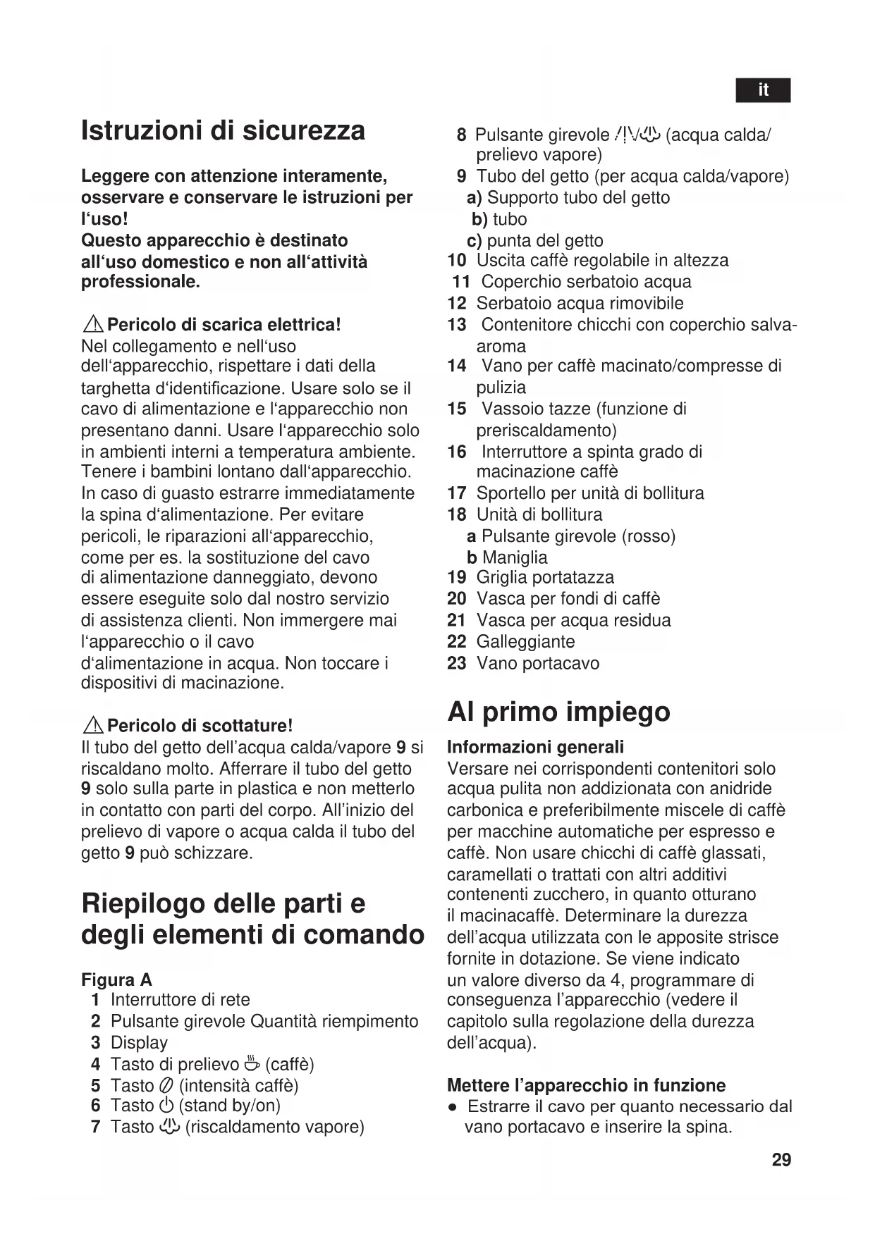 ! Pericolo di scottature! Il tubo del getto dell’acqua calda/vapore 9 si riscaldano molto. Afferrare il tubo del getto 9 solo sulla parte in plastica e non metterlo in contatto con parti del corpo. All’inizio del prelievo di vapore o acqua calda il tubo del getto 9 può schizzare. Riepilogo delle parti e degli elementi di comando Figura A 1 Interruttore di rete 2 Pulsante girevole Quantità riempimento 3 Display 4 Tasto di prelievo 4 (caffè) 5 Tasto 5 (intensità caffè) 6 Tasto a (stand by/on) 7 Tasto h (riscaldamento vapore) 8 Pulsante girevole g/h (acqua calda/ prelievo vapore) 9 Tubo del getto (per acqua calda/vapore) a) Supporto tubo del getto b) tubo c) punta del getto 10 Uscita caffè regolabile in altezza 11 Coperchio serbatoio acqua 12 Serbatoio acqua rimovibile 13 Contenitore chicchi con coperchio salva- aroma 14 Vano per caffè macinato/compresse di pulizia 15 Vassoio tazze (funzione di preriscaldamento) 16 Interruttore a spinta grado di macinazione caffè 17 Sportello per unità di bollitura 18 Unità di bollitura a Pulsante girevole (rosso) b Maniglia 19 Griglia portatazza 20 Vasca per fondi di caffè 21 Vasca per acqua residua 22 Galleggiante 23 Vano portacavo Al primo impiego Informazioni generali Versare nei corrispondenti contenitori solo acqua pulita non addizionata con anidride carbonica e preferibilmente miscele di caffè per macchine automatiche per espresso e caffè. Non usare chicchi di caffè glassati, caramellati o trattati con altri additivi contenenti zucchero, in quanto otturano il macinacaffè. Determinare la durezza dell’acqua utilizzata con le apposite strisce fornite in dotazione. Se viene indicato un valore diverso da 4, programmare di conseguenza l’apparecchio (vedere il capitolo sulla regolazione della durezza dell’acqua). Mettere l’apparecchio in funzione ●Estrarreilcavoperquantonecessariodal vano portacavo e inserire la spina.30 ●Togliereilserbatoioperl’acqua12, sciacquarlo e riempirlo con acqua pulita fredda. Non superare il livello indicato come “max“. ●Posizionareilserbatoiodell’acqua12 diritto e spingerlo completamente verso il basso. ●Riempirel’appositocontenitoreconi chicchi di caffè. ●Posizionarel’interruttoredirete1 su I. Il tasto a di ”stand by” emette una leggera luce rossa. ●Assicurarsicheilpulsante8 sia posizionato su ”O“. ●Premereiltastoa. Su display lampeggia 8. Al primo utilizzo è necessario riempire il sistema di conduzione dell’acqua dell’apparecchio. ●Posizionareunatazzasottoiltubodel getto 9 . ●Posizionareilpulsantegirevole8 su g/h, un po’ di acqua scorre nella tazza. Riportare il pulsante girevole 8 su O . ●Orailtastoa lampeggia, l’apparecchio esegue il risciacquo ed il riscaldamento. L’apparecchioèpronto per l’uso, quando tutti i quattro tasti 4, 5, a, h e la spia Intensità caffè (chicchi) si accendono sul display. i L’apparecchioèpreprogrammato con impostazioni standard per un funzionamento ottimale. Nota: al primo utilizzo e quando l’apparecchio resta inutilizzato per un periodo più lungo, la prima tazza non ha un aroma pieno e non conviene berla. Elementi di comando 1 Interruttore di rete L’interruttoredirete1 sul retro dell’appa- recchio attiva o disattiva l’alimentazione di corrente. Dopo l’accensione dell’interruttore di rete, il tasto a si accende debolmente in rosso. L’apparecchioèinmodalitàdi“standby“. Attenzione Durante l’esercizio non toccare l’interruttore di rete, ma spegnere l’apparecchio solo quando si trova in modalità di “stand by“. 2 Pulsante girevole per la regolazione della quantità di riempimento Questo pulsante consente di impostare gradualmente la quantità di riempimento, da una piccola tazza Enoadunagrande tazza F. 3 Display Il display visualizza tramite simboli le impostazioni e i messaggi dell’apparecchio 6 Prelievo caffè 2 tazze 7 lampeggiano Il coperchio del vano 14 per caffè macinato è aperto 7 acceso Caffè macinato/Pulizia 5 acceso Intensità caffè delicato 55 accesi Intensità caffè normale 555 accesi Intensità caffè forte 555 lampeggiano Recipiente chicchi di caffè vuoto S acceso Assistenza: richiesta decalcicazione/pulizia S lamp. Programma di assistenza in funzione 9 acceso Riemp. serb. acqua 12, + 8 lamp. Tenere la tazza sotto il getto 9 e poi girare il pulsante 8 su g/h. 8 lamp. Posizionare pulsante 8 su g/h. 8 acceso Posizionare pulsante 8 su O. D acceso Vuotare vasche D lamp. Vuotare vasche it31 4 Tasto di prelievo 4 caffè Con questo tasto è possibile prelevare il caffè: premere 1x per una tazza, il caffè viene macinato, preriscaldato e versato nella tazza. Il tasto 4 lampeggia durante il prelievo. Premere 2x nell’arco di 3 secondi per due tazze, il caffè viene macinato, preriscaldato e versato nelle tazze, il processo di macinazione e riscaldamento viene ripetuto. Il tasto 4 lampeggia e sul display lampeggia il simbolo 6 (2 tazze) durante il prelievo. i Premendo nuovamente il tasto di prelievo 4 è possibile terminare in anticipo il prelievo del caffè. 5 Tasto 5 Intensità caffè Premendo il tasto 5 è possibile regolare l’intensità del caffè da 5 medio 55 normale 555 forte. Il valore impostato si può vedere sul display. 6 Tasta a “Stand by“ Con il tasto a si accende l’apparecchio o lo mette in modalità di “stand by“. Dopo aver attivato il tasto a, l’apparecchio inizia il riscaldamento, durante questo processo il tasto alampeggia.Inneviene eseguito il risciacquo. Quando sul display si accendono i tasti 4, 5, a, h e a seconda dell’impostazione compaiono uno, due o tre chicchi, l’apparecchio è pronto per l’uso, L’apparecchioesegueilrisciacquoquando: – è ancora caldo all’accensione – non è avvenuto alcun prelievo di caffè prima del passaggio alla modalità di “stand by- – è stato prelevato vapore poco prima della disattivazione. 7 Tasto di prelievo h Riscaldamento vapore Premendo il tasto h all’interno dell’apparecchio viene pr