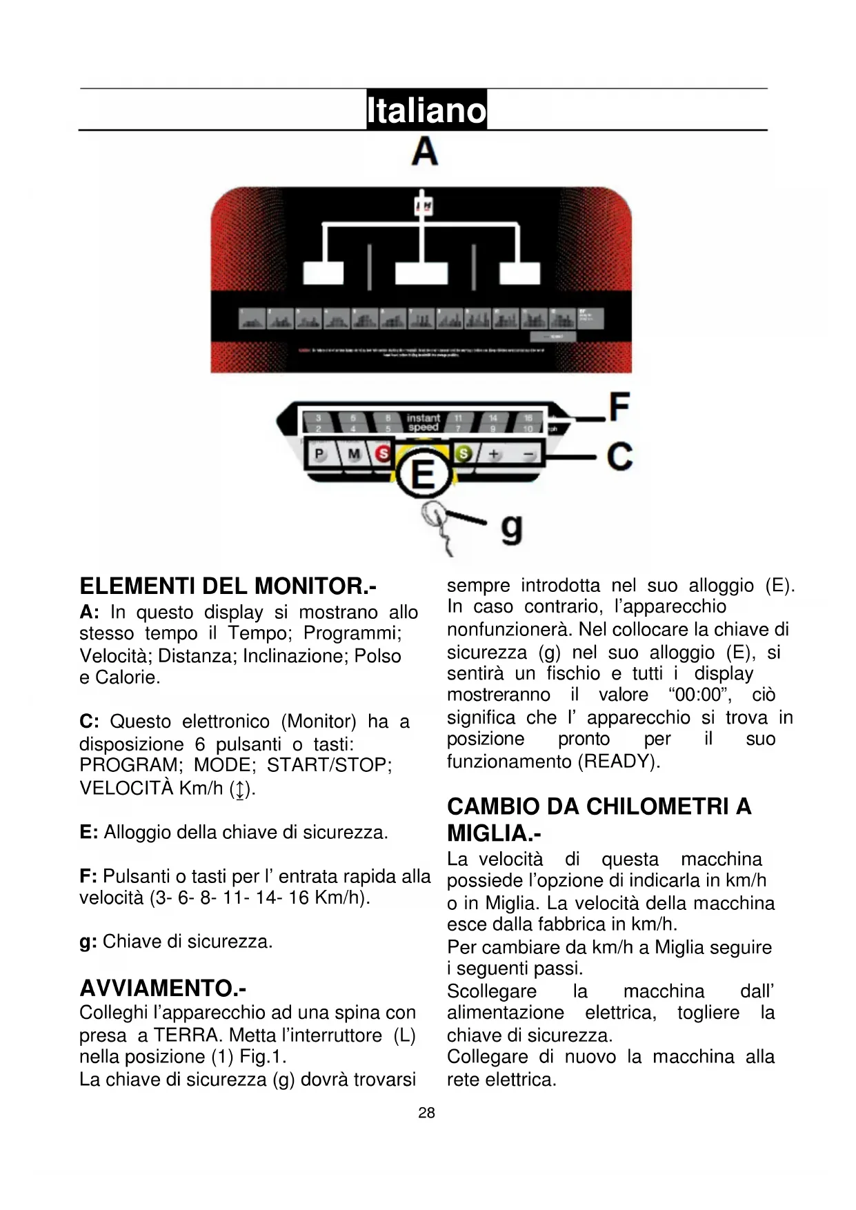 C: Questo elettronico (Monitor) ha a disposizione 6 pulsanti o tasti: PROGRAM; MODE; START/STOP; VELOCITA Km/h () .