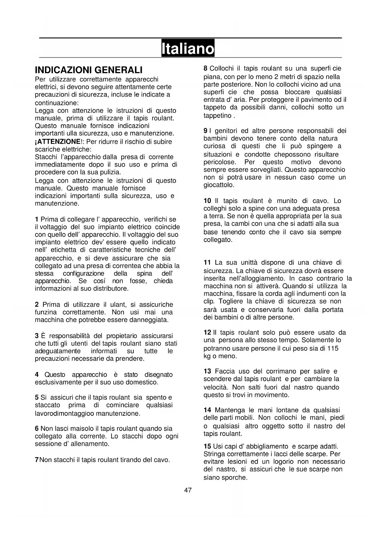 Legga conattenzione le istruzioni di questo manuale, prima diutilizzare il tapis roulant. Questo manuale fornisceindicazioni importantiulla sicurezza,uso e manutenzione.