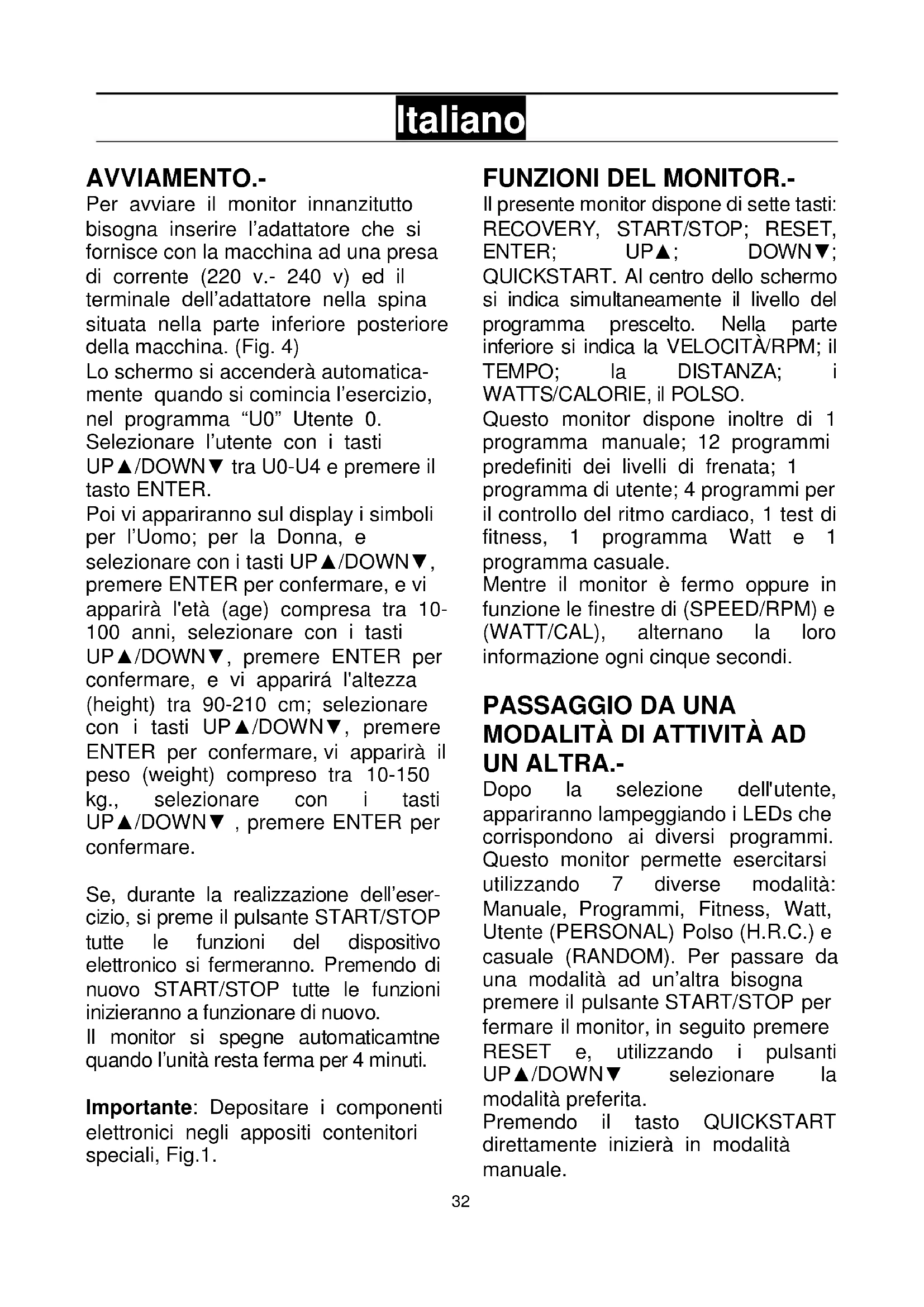 Il presente monitor dispone di sette tasti: RECOVERY, START/STOP; RESET, ENTER; UP▲; DOWN▼; QUICKSTART. Al centro dello schermo si indica simultaneamente il livello del programma prescelto. Nella parte inferiore si indica la VELOCITÀ/RPM; il TEMPO; la DISTANZA; i WATTS/CALORIE, il POLSO.