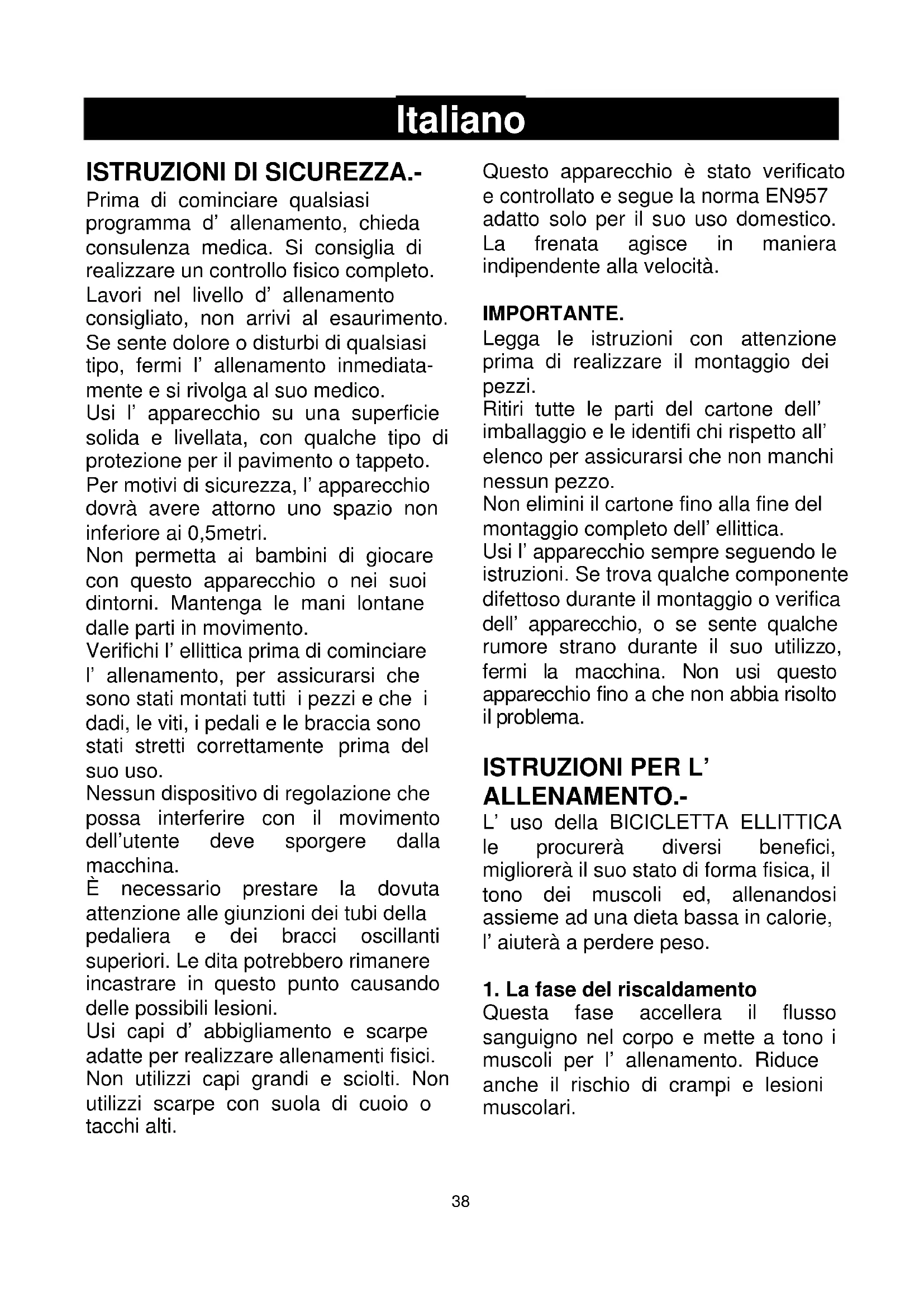 Legga conattenzione le istruzioni di questo manuale. Questo le fornisceindicazioni importanti sul montaggio, sicurezza edutilizzo della macchina.1 Questo appearecchio è stato disegnare per il suo utilizzo in casa. Il peso dell'utente non debe andre othere i 120kg