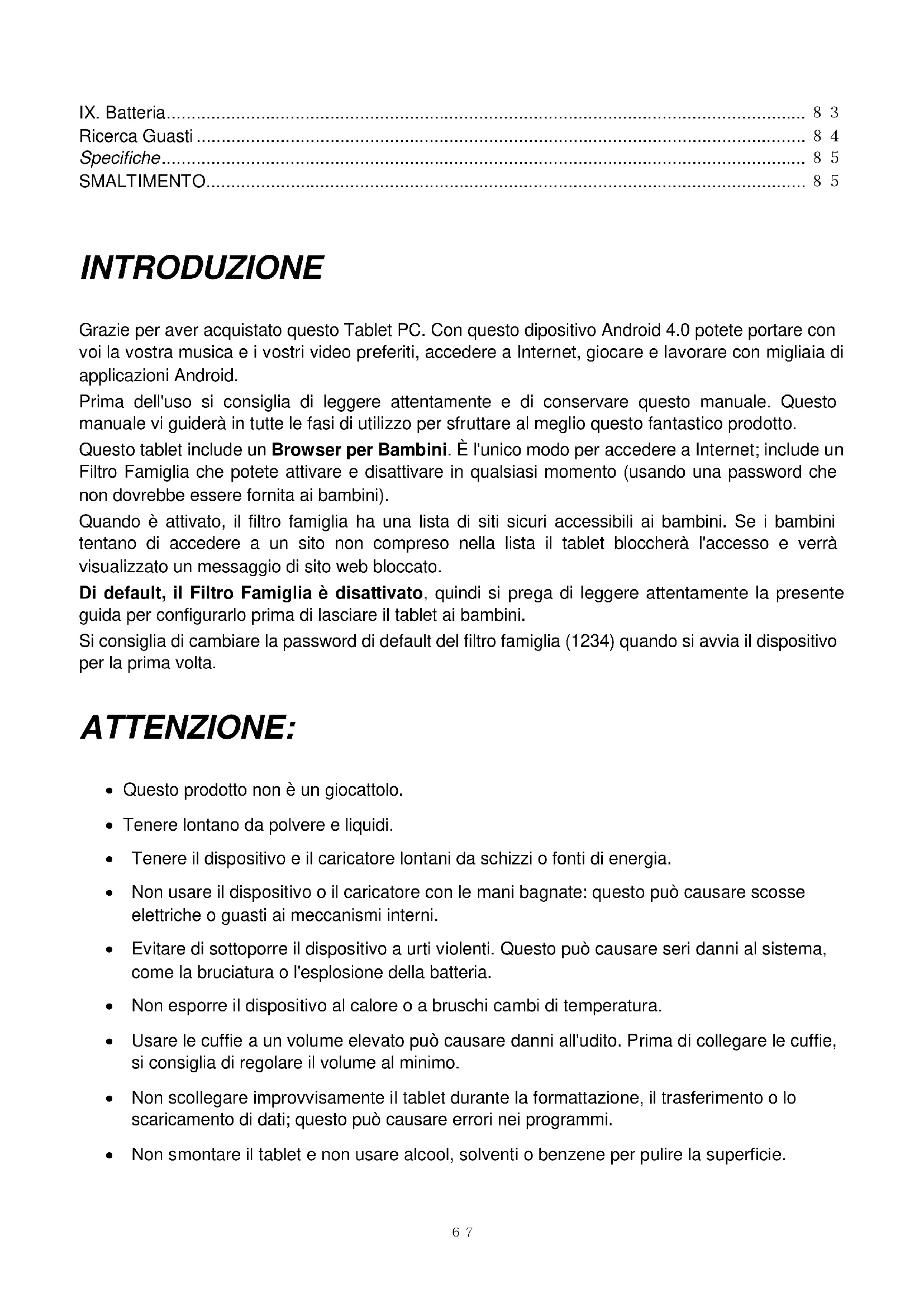 IX. Batteria ................................................................................................................................. 83 Ricerca Guasti ........................................................................................................................... 84 Specifiche .................................................................................................................................. 85 SMALTIMENTO ......................................................................................................................... 85 INTRODUZIONE Grazie per aver acquistato questo Tablet PC. Con questo dipositivo Android 4.0 potete portare con voi la vostra musica e i vostri video preferiti, accedere a Internet, giocare e lavorare con migliaia di applicazioni Android. Prima dell'uso si consiglia di leggere attentamente e di conservare questo manuale. Questo manuale vi guiderà in tutte le fasi di utilizzo per sfruttare al meglio questo fantastico prodotto. Questo tablet include un Browser per Bambini. È l'unico modo per accedere a Internet; include un Filtro Famiglia che potete attivare e disattivare in qualsiasi momento (usando una password che non dovrebbe essere fornita ai bambini). Quando è attivato, il filtro famiglia ha una lista di siti sicuri accessibili ai bambini. Se i bambini tentano di accedere a un sito non compreso nella lista il tablet bloccherà l'accesso e verrà visualizzato un messaggio di sito web bloccato. Di default, il Filtro Famiglia è disattivato, quindi si prega di leggere attentamente la presente guida per configurarlo prima di lasciare il tablet ai bambini. Si consiglia di cambiare la password di default del filtro famiglia (1234) quando si avvia il dispositivo per la prima volta. ATTENZIONE: