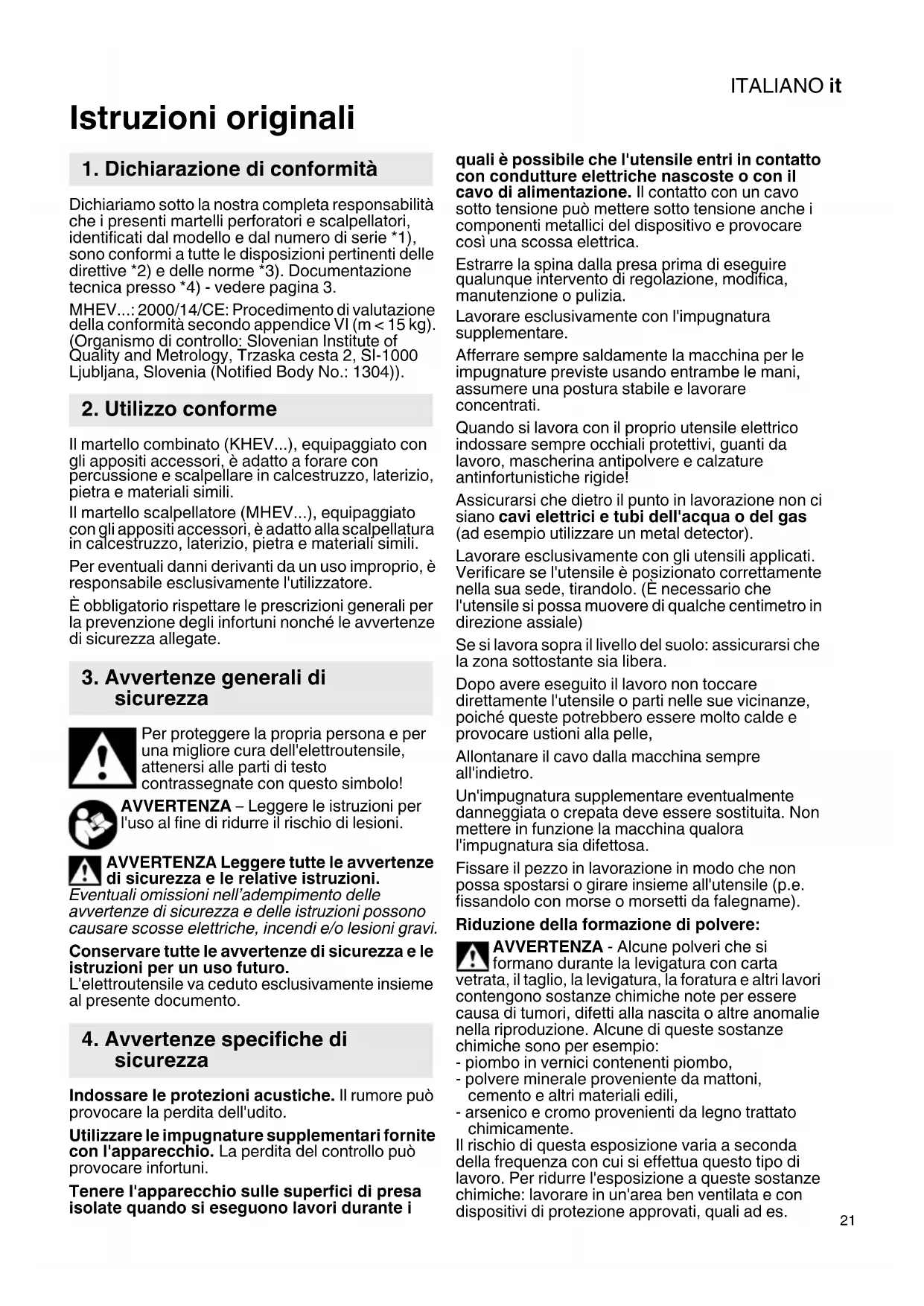 Istruzioni originali Dichiariamo sotto la nostra completa responsabilità che i presenti martelli perforatori e scalpellatori, identificati dal modello e dal numero di serie *1), sono conformi a tutte le disposizioni pertinenti delle direttive *2) e delle norme *3). Documentazione tecnica presso *4) - vedere pagina 3. MHEV...: 2000/14/CE: Procedimento di valutazione della conformità secondo appendice VI (m < 15 kg). (Organismo di controllo: Slovenian Institute of Quality and Metrology, Trzaska cesta 2, SI-1000 Ljubljana, Slovenia (Notified Body No.: 1304)). Il martello combinato (KHEV...), equipaggiato con gli appositi accessori, è adatto a forare con percussione e scalpellare in calcestruzzo, laterizio, pietra e materiali simili. Il martello scalpellatore (MHEV...), equipaggiato con gli appositi accessori, è adatto alla scalpellatura in calcestruzzo, laterizio, pietra e materiali simili. Per eventuali danni derivanti da un uso improprio, è responsabile esclusivamente l'utilizzatore. È obbligatorio rispettare le prescrizioni generali per la prevenzione degli infortuni nonché le avvertenze di sicurezza allegate. Per proteggere la propria persona e per una migliore cura dell'elettroutensile, attenersi alle parti di testo contrassegnate con questo simbolo! AVVERTENZA – Leggere le istruzioni per l'uso al fine di ridurre il rischio di lesioni. AVVERTENZA Leggere tutte le avvertenze di sicurezza e le relative istruzioni. Eventuali omissioni nell’adempimento delle avvertenze di sicurezza e delle istruzioni possono causare scosse elettriche, incendi e/o lesioni gravi. Conservare tutte le avvertenze di sicurezza e le istruzioni per un uso futuro. L'elettroutensile va ceduto esclusivamente insieme al presente documento. Indossare le protezioni acustiche. Il rumore può provocare la perdita dell'udito. Utilizzare le impugnature supplementari fornite con l'apparecchio. La perdita del controllo può provocare infortuni. Tenere l'apparecchio sulle superfici di presa isolate quando si eseguono lavori durante i quali è possibile che l'utensile entri in contatto con condutture elettriche nascoste o con il cavo di alimentazione. Il contatto con un cavo sotto tensione può mettere sotto tensione anche i componenti metallici del dispositivo e provocare così una scossa elettrica. Estrarre la spina dalla presa prima di eseguire qualunque intervento di regolazione, modifica, manutenzione o pulizia. Lavorare esclusivamente con l'impugnatura supplementare. Afferrare sempre saldamente la macchina per le impugnature previste usando entrambe le mani, assumere una postura stabile e lavorare concentrati. Quando si lavora con il proprio utensile elettrico indossare sempre occhiali protettivi, guanti da lavoro, mascherina antipolvere e calzature antinfortunistiche rigide! Assicurarsi che dietro il punto in lavorazione non ci siano cavi elettrici e tubi dell'acqua o del gas (ad esempio utilizzare un metal detector). Lavorare esclusivamente con gli utensili applicati. Verificare se l'utensile è posizionato correttamente nella sua sede, tirandolo. (È necessario che l'utensile si possa muovere di qualche centimetro in direzione assiale) Se si lavora sopra il livello del suolo: assicurarsi che la zona sottostante sia libera. Dopo avere eseguito il lavoro non toccare direttamente l'utensile o parti nelle sue vicinanze, poiché queste potrebbero essere molto calde e provocare ustioni alla pelle, Allontanare il cavo dalla macchina sempre all'indietro. Un'impugnatura supplementare eventualmente danneggiata o crepata deve essere sostituita. Non mettere in funzione la macchina qualora l'impugnatura sia difettosa. Fissare il pezzo in lavorazione in modo che non possa spostarsi o girare insieme all'utensile (p.e. fissandolo con morse o morsetti da falegname). Riduzione della formazione di polvere: AVVERTENZA - Alcune polveri che si formano durante la levigatura con carta vetrata, il taglio, la levigatura, la foratura e altri lavori contengono sostanze chimiche note per essere causa di tumori, difetti alla nascita o altre anomalie nella riproduzione. Alcune di queste sostanze chimiche sono per esempio: - piombo in vernici contenenti piombo, - polvere minerale proveniente da mattoni, cemento e altri materiali edili, - arsenico e cromo provenienti da legno trattato chimicamente. Il rischio di questa esposizione varia a seconda della frequenza con cui si effettua questo tipo di lavoro. Per ridurre l'esposizione a queste sostanze chimiche: lavorare in un'area ben ventilata e con dispositivi di protezione approvati, quali ad es.