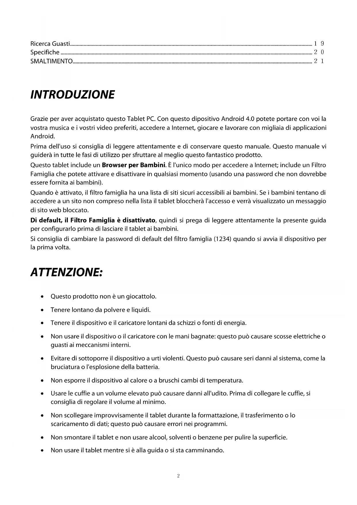 Ricerca Guasti ................................................................................................................................................................................... 19 Specifiche .......................................................................................................................................................................................... 20 SMALTIMENTO................................................................................................................................................................................. 21 INTRODUZIONE Grazie per aver acquistato questo Tablet PC. Con questo dipositivo Android 4.0 potete portare con voi la vostra musica e i vostri video preferiti, accedere a Internet, giocare e lavorare con migliaia di applicazioni Android. Prima dell'uso si consiglia di leggere attentamente e di conservare questo manuale. Questo manuale vi guiderà in tutte le fasi di utilizzo per sfruttare al meglio questo fantastico prodotto. Questo tablet include un Browser per Bambini. È l'unico modo per accedere a Internet; include un Filtro Famiglia che potete attivare e disattivare in qualsiasi momento (usando una password che non dovrebbe essere fornita ai bambini). Quando è attivato, il filtro famiglia ha una lista di siti sicuri accessibili ai bambini. Se i bambini tentano di accedere a un sito non compreso nella lista il tablet bloccherà l'accesso e verrà visualizzato un messaggio di sito web bloccato. Di default, il Filtro Famiglia è disattivato, quindi si prega di leggere attentamente la presente guida per configurarlo prima di lasciare il tablet ai bambini. Si consiglia di cambiare la password di default del filtro famiglia (1234) quando si avvia il dispositivo per la prima volta. ATTENZIONE: