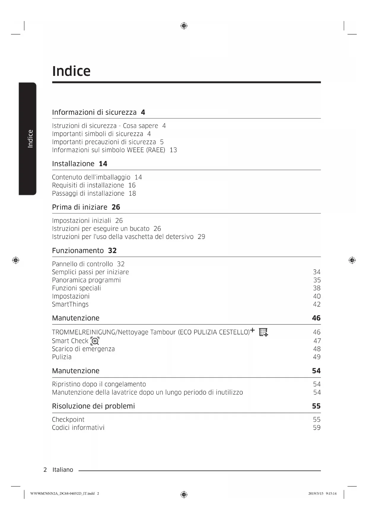 - Ai primi segni di ruggine sulla supercie del cestello, applicare un prodotto per la pulizia (neutro) e pulire con una spugna. Non utilizzare in nessun caso una spazzola metallica. WW90M76NN2A_DC68-04052D_IT.indd 11 2019/3/15 9:15:1512 Italiano Informazioni di sicurezza Informazioni di sicurezza Non utilizzare direttamente un detersivo per la pulizia a secco e non lavare, sciacquare o centrifugare capi contaminati da detersivo per la pulizia a secco.
