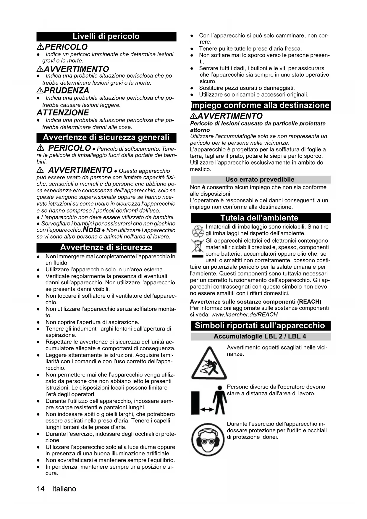 • Dichiarazione di conformità UE Italiano Livelli di pericolo PERICOLO ● Indica un pericolo imminente che determina lesioni gravi o la morte. 몇 AVVERTIMENTO ● Indica una probabile situazione pericolosa che po- trebbe determinare lesioni gravi o la morte. 몇 PRUDENZA ● Indica una probabile situazione pericolosa che po- trebbe causare lesioni leggere. ATTENZIONE ● Indica una probabile situazione pericolosa che po- trebbe determinare danni alle cose. Avvertenze di sicurezza generali PERICOLO ● Pericolo di soffocamento. Tene- re le pellicole di imballaggio fuori dalla portata dei bam- bini. 몇 AVVERTIMENTO ● Questo apparecchio può essere usato da persone con limitate capacità fisi- che, sensoriali o mentali e da persone che abbiano po- ca esperienza e/o conoscenza dell’apparecchio, solo se queste vengono supervisionate oppure se hanno rice- vuto istruzioni su come usare in sicurezza l’apparecchio e se hanno compreso i pericoli derivanti dall’uso. ● L'apparecchio non deve essere utilizzato da bambini. ● Sorvegliare i bambini per assicurarsi che non giochino con l'apparecchio. Nota ● Non utilizzare l'apparecchio se vi sono altre persone o animali nell'area di lavoro. Avvertenze di sicurezza ● Non immergere mai completamente l'apparecchio in un fluido. ● Utilizzare l'apparecchio solo in un'area esterna. ● Verificate regolarmente la presenza di eventuali danni sull'apparecchio. Non utilizzare l'apparecchio se presenta danni visibili. ● Non toccare il soffiatore o il ventilatore dell'apparec- chio. ● Non utilizzare l’apparecchio senza soffiatore monta- to. ● Non coprire l'apertura di aspirazione. ● Tenere gli indumenti larghi lontani dall'apertura di aspirazione. ● Rispettare le avvertenze di sicurezza dell'unità ac- cumulatore allegate e comportarsi di conseguenza. ● Leggere attentamente le istruzioni. Acquisire fami- liarità con i comandi e con l'uso corretto dell'appa- recchio. ● Non permettere mai che l’apparecchio venga utiliz- zato da persone che non abbiano letto le presenti istruzioni. Le disposizioni locali possono limitare l’età degli operatori. ● Durante l’utilizzo dell’apparecchio, indossare sem- pre scarpe resistenti e pantaloni lunghi. ● Non indossare abiti o gioielli larghi, che potrebbero essere aspirati nella presa d’aria. Tenere i capelli lunghi lontani dalle prese d’aria. ● Durante l’esercizio, indossare degli occhiali di prote- zione. ● Utilizzare l’apparecchio solo alla luce diurna oppure in presenza di una buona illuminazione artificiale. ● Non sovraffaticarsi e mantenere sempre l’equilibrio. ● In pendenza, mantenere sempre una posizione si- cura. ● Con l’apparecchio si può solo camminare, non cor- rere. ● Tenere pulite tutte le prese d’aria fresca. ● Non soffiare mai lo sporco verso le persone presen- ti. ● Serrare tutti i dadi, i bulloni e le viti per assicurarsi che l’apparecchio sia sempre in uno stato operativo sicuro. ● Sostituire pezzi usurati o danneggiati. ● Utilizzare solo ricambi e accessori originali. Impiego conforme alla destinazione 몇 AVVERTIMENTO Pericolo di lesioni causato da particelle proiettate attorno Utilizzare l'accumulafoglie solo se non rappresenta un pericolo per le persone nelle vicinanze. L'apparecchio è progettato per la soffiatura di foglie a terra, tagliare il prato, potare le siepi e per lo sporco. Utilizzare l’apparecchio esclusivamente in ambito do- mestico. Uso errato prevedibile Non è consentito alcun impiego che non sia conforme alle disposizioni. L'operatore è responsabile dei danni conseguenti a un impiego non conforme alla destinazione. Tutela dell'ambiente I materiali di imballaggio sono riciclabili. Smaltire gli imballaggi nel rispetto dell’ambiente. Gli apparecchi elettrici ed elettronici contengono materiali riciclabili preziosi e, spesso, componenti come batterie, accumulatori oppure olio che, se usati o smaltiti non correttamente, possono costi- tuire un potenziale pericolo per la salute umana e per l'ambiente. Questi componenti sono tuttavia necessari per un corretto funzionamento dell'apparecchio. Gli ap- parecchi contrassegnati con questo simbolo non devo- no essere smaltiti con i rifiuti domestici. Avvertenze sulle sostanze componenti (REACH) Per informazioni aggiornate sulle sostanze componenti si veda: www.kaercher.de/REACH Simboli riportati sull’apparecchio Accumulafoglie LBL 2 / LBL 4 Avvertimento oggetti scagliati nelle vici- nanze. Persone diverse dall'operatore devono stare a distanza dall'area di lavoro. Durante l'esercizio dell'apparecchio in- dossare protezione per l'udito e occhiali di protezione idonei.Italiano 15 Accessori e ricambi Utilizzando solamente accessori e ricambi originali, si garantisce un funzionamento sicuro e privo di disturbi dell'apparecchio. Si possono trovare informazioni riguardo ad accessori e ricambi su www.kaercher.com. Volume di fornitura Il volume di fornitura dell’apparecchio è riportato sulla confezione. Disimballare la confezione e controllare che il contenuto sia completo. In caso di accessori mancanti o danni dovuti al trasporto si prega di contattare il riven- ditore. Descrizione dell’apparecchio Figura A 1 Ugello piatto con bordo raschiatore integrato 2 Parte inferiore soffiatore 3 Parte superiore soffiatore 4 Uscita dell'aria 5 Interruttore dell'apparecchio p. 1614