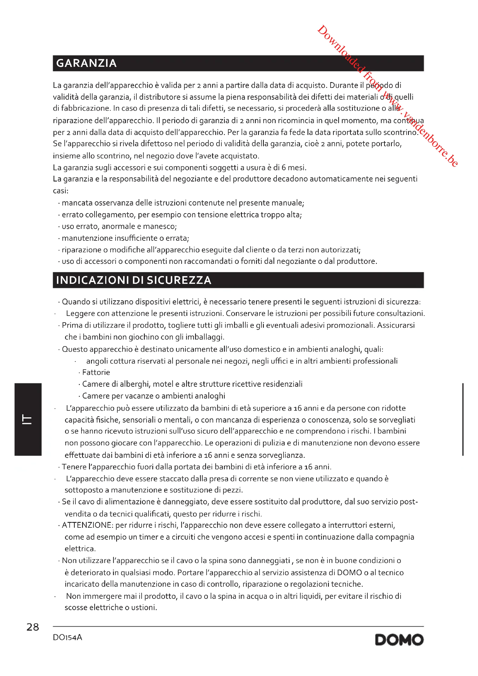 - Non immergere mai il prodotto, il cavo o la spina in acqua o in altri liquidi, per evitare il rischio di scosse elettriche o ustioni. Downloaded from www.vandenborre.be29 DO154Awww.domo-elektro.be