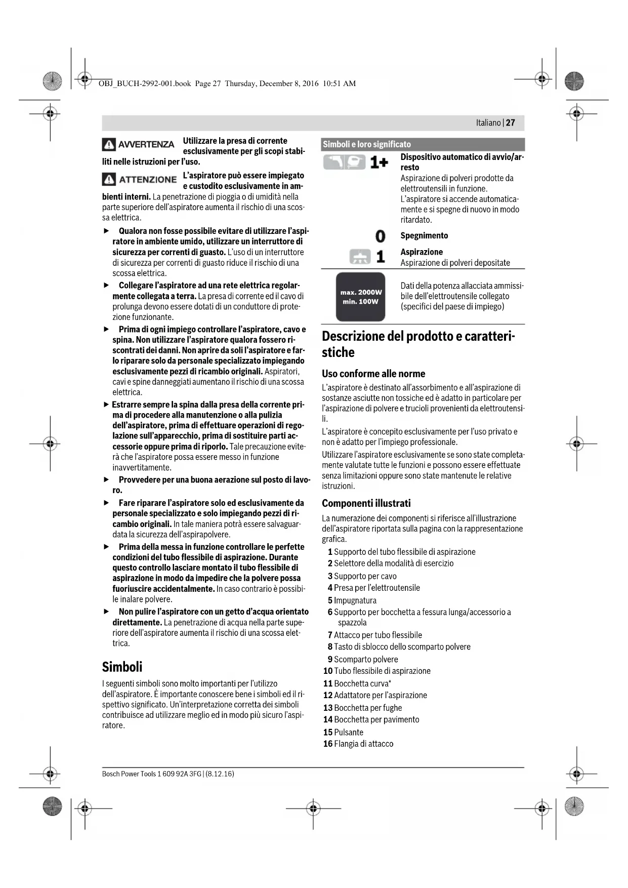 – Lave o filtro permanente 24 sob água corrente e depois deixe-o secar. – Volte a colocar o filtro limpo e certifique-se do assento cor- reto e seguro. Volte a fechar a tampa de saída de ar. Avarias Se a potência de aspiração for insuficiente deverá controlar: – O sistema de mangueira está obstruído? – Os filtros estão tapados com pó? – A câmara de recolha de pó 9 está cheia? – Para ligar o aspirador, coloque o seletor do modo de operação 2 no símbolo “Aspirar”. – Para desligar o aspirador, coloque o seletor do modo de operação 2 no símbolo “Desli- gar”. – Para a colocação em funcionamen- to do sistema start/stop automáti- co do aspirador, coloque o seletor do modo de operação 2 no símbolo “sis- tema start/stop automático”. – Para desligar o aspirador, coloque o seletor do modo de operação 2 no símbolo “Desli- gar”. OBJ_BUCH-2992-001.book Page 25 Thursday, December 8, 2016 10:51 AM26 | Italiano 1 609 92A 3FG | (8.12.16) Bosch Power Tools– O saco de pó 18 está cheio?Em caso de sobreaquecimento, o aspirador desliga-se. Pro-ceda da seguinte forma:– Deixe o aspirador arrefecer 60 min.– Retire e volte a ligar a ficha de rede da tomada. – Certifique-se de que o recipiente 9 e o saco do pó 18 estão vazios e a mangueira de aspiração 10, o filtro 21/22 e o fil- tro permanente 24 não estão entupidos.Um esvaziamento em intervalos regulares assegura uma po-tência de aspiração ideal.Se em seguida a potência de aspiração não for alcançada, o aspirador deverá ser levado ao serviço pós-venda.Arrecadação (veja figura G)– Abra as fitas elásticas do suporte da mangueira de aspira- ção 1 e coloque a mangueira de aspiração 10 à volta do as- pirador.Volte a colocar as fitas elásticas.– Introduza o acessório de aspiração no respetivo suporte 6 no aspirador.– Enrolar o cabo de rede elétrica em volta do suporte do ca-bo 3.– O aspirador só deve ser transportado pelo punho de trans-porte 5. Serviço pós-venda e consultoria de aplicação O serviço pós-venda responde às suas perguntas a respeito de serviços de reparação e de manutenção do seu produto, assim como das peças sobressalentes. Desenhos explodidos e informações sobre peças sobressalentes encontram-se em:www.bosch-pt.comA nossa equipa de consultoria de aplicação Bosch esclarece com prazer todas as suas dúvidas a respeito da compra, apli-cação e ajuste dos produtos e acessórios.Indique para todas as questões e encomendas de peças so-bressalentes a referência de 10 dígitos de acordo com a placa de caraterísticas do produto.PortugalRobert Bosch LDAAvenida Infante D. HenriqueLotes 2E – 3E1800 LisboaPara efetuar o seu pedido online de peças entre na página www.ferramentasbosch.com.Tel.: 21 8500000Fax: 21 8511096BrasilRobert Bosch Ltda.Caixa postal 119513065-900 CampinasTel.: (0800) 7045446www.bosch.com.br/contacto Eliminação Aspiradores, acessórios e embalagens devem ser enviados a uma reciclagem ecológica de matéria-prima.Não deitar o aspirador no lixo doméstico!Apenas países da União Europeia:De acordo com a diretiva europeia 2012/19/UE para aparelhos elétricos e ele-trónicos velhos, e com as respetivas realiza-ções nas leis nacionais, os aspiradores que não servem mais para a utilização, devem ser enviados separadamente a uma recicla-gem ecológica.Sob reserva de alterações. Italiano Norme di sicurezza Leggere tutte le avvertenze di pericolo e le istruzioni operative. In caso di mancato rispet-to delle avvertenze di pericolo e delle istruzioni operative si potrà creare il pericolo di scosse elettriche, incendi e/o incidenti gravi.Custodire accuratamente le presenti istruzioni. Il presente aspiratore non è previ- sto per l’utilizzo da parte di bambi- ni e di persone con limitate capaci- tà fisiche, sensoriali o mentali né di persone con scarsa conoscenza ed esperienza. In caso contrario sussi- ste il pericolo di un impiego errato e di infortuni. Sorvegliare i bambini. In questo mo- do è possibile evitare che i bambini giochino con l’aspiratore. Non aspirare sostanze dannose per la salute, p. es. polvere di legno di faggio, di quercia, polvere minerale, amianto. Queste so-stanze sono considerate cancerogene.InformateVi relativamente alle norme/leggi in vigore nel Vostro paese riguardanti il trattamento di polveri nocive per la salute.Utilizzare l’aspiratore esclusiva-mente se è possibile valutare com-pletamente tutte le funzioni e le stesse possono essere ef-fettuate senza limitazioni oppure sono state rispettate le relative istruzioni. Un’istruzione accurata riduce usi errati e lesioni.L’aspiratore è esclusivamente de-stinato all’aspirazione di materiali solidi. L’infiltrazione di liquidi aumenta il rischio di folgorazio- ne. AVVERTENZA AVVERTENZA AVVERTENZA OBJ_BUCH-2992-001.book Page 26 Thursday, December 8, 2016 10:51 AMItaliano | 27 Bosch Power Tools 1 609 92A 3FG | (8.12.16) Utilizzare la presa di corrente esclusivamente per gli scopi stabi- liti nelle istruzioni per l’uso. L’aspiratore può essere impiegato e custodito esclusivamente in am- bienti interni. La penetrazione di pioggia o di umidità nella parte superiore dell’aspiratore aumenta il rischio di una scos- sa elettrica. Qualora non fosse possibile evitare di utilizzare l’aspi- ratore in ambiente umido, utilizzare un interruttore di sicurezza per correnti di guasto. L’uso di un interruttore di sicurezza per correnti di guasto riduce il rischio di una scossa elettrica. Collegare l’aspiratore ad una rete elettrica regolar- mente collegata a terra. La presa di corrente ed il cavo di prolunga devono essere dotati di un conduttore di prote- zione funzionante. Prima di ogni impiego controllare l’aspiratore, cavo e spina. Non utilizzare l’aspiratore qualora fossero ri- scontrati dei danni. Non aprire da soli l’aspiratore e far- lo riparare solo da personale specializzato impiegando esclusivamente pezzi di ric