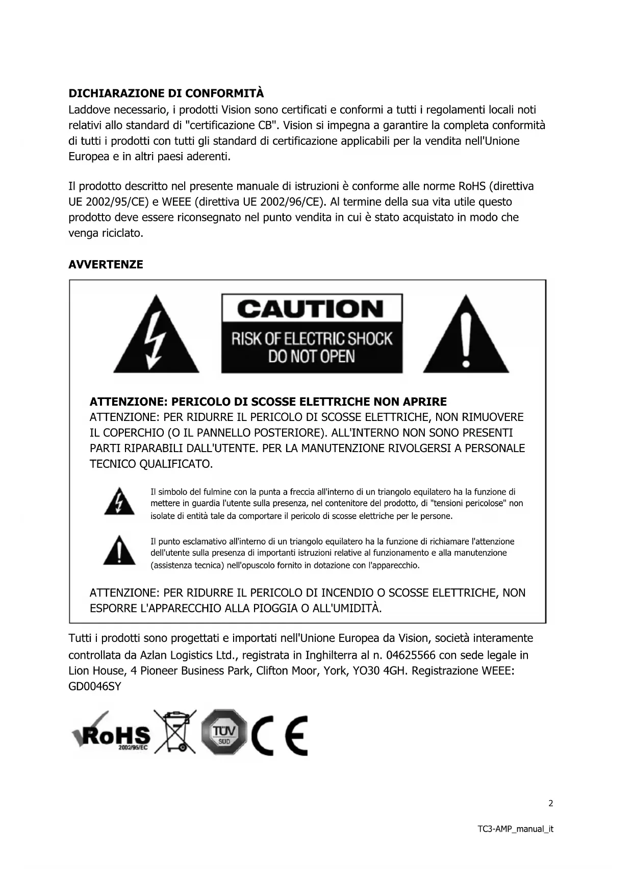 Tutti i prodotti sono progettati e importati nell'Unione Europea da Vision, società interamente controllata da Azlan Logistics Ltd., registrata in Inghilterra al n. 04625566 con sede legale in Lion House, 4 Pioneer Business Park, Clifton Moor, York, YO30 4GH. Registrazione WEEE: GD0046SY