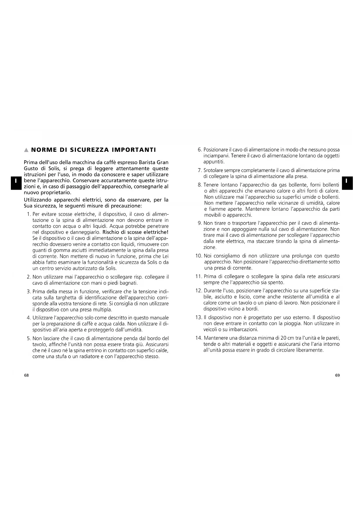 Prima dell’uso della macchina da caffè espresso Barista Gran Gusto di Solis, si prega di leggere attentamente queste istruzioni per l’uso, in modo da conoscere e saper utilizzare bene l’apparecchio. Conservare accuratamente queste istru- zioni e, in caso di passaggio dell’apparecchio, consegnarle al nuovo proprietario. Utilizzando apparecchi elettrici, sono da osservare, per la Sua sicurezza, le seguenti misure di precauzione: