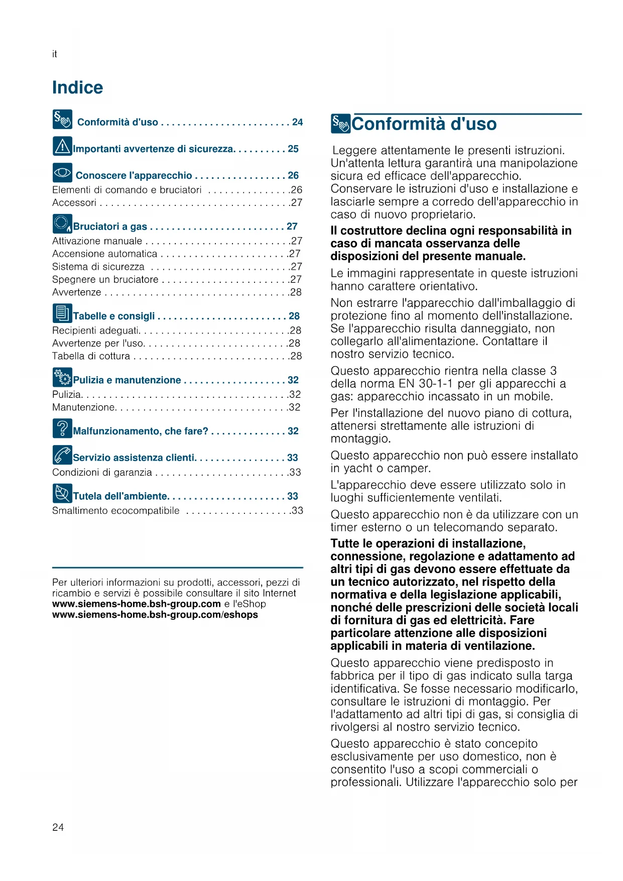 - Conoscere l'apparecchio . . . . . . . . . . . . . . . . . 26 Elementi di comando e bruciatori . . . . . . . . . . . . . . .26 Accessori . . . . . . . . . . . . . . . . . . . . . . . . . . . . . . . . . .27 Ä Bruciatori a gas . . . . . . . . . . . . . . . . . . . . . . . . . 27 Attivazione manuale . . . . . . . . . . . . . . . . . . . . . . . . . .27 Accensione automatica . . . . . . . . . . . . . . . . . . . . . . .27 Sistema di sicurezza . . . . . . . . . . . . . . . . . . . . . . . . .27 Spegnere un bruciatore . . . . . . . . . . . . . . . . . . . . . . .27 Avvertenze . . . . . . . . . . . . . . . . . . . . . . . . . . . . . . . . .28 J Tabelle e consigli . . . . . . . . . . . . . . . . . . . . . . . . 28 Recipienti adeguati. . . . . . . . . . . . . . . . . . . . . . . . . . .28 Avvertenze per l'uso. . . . . . . . . . . . . . . . . . . . . . . . . .28 Tabella di cottura . . . . . . . . . . . . . . . . . . . . . . . . . . . .28 2 Pulizia e manutenzione . . . . . . . . . . . . . . . . . . . 32 Pulizia. . . . . . . . . . . . . . . . . . . . . . . . . . . . . . . . . . . . .32 Manutenzione. . . . . . . . . . . . . . . . . . . . . . . . . . . . . . .32 3 Malfunzionamento, che fare? . . . . . . . . . . . . . . 32 4 Servizio assistenza clienti. . . . . . . . . . . . . . . . . 33 Condizioni di garanzia . . . . . . . . . . . . . . . . . . . . . . . .33 7 Tutela dell'ambiente. . . . . . . . . . . . . . . . . . . . . . 33 Smaltimento ecocompatibile . . . . . . . . . . . . . . . . . . .33 Produktinfo Per ulteriori informazioni su prodotti, accessori, pezzi di ricambio e servizi è possibile consultare il sito Internet www.siemens-home.bsh-group.com e l'eShop www.siemens-home.bsh-group.com/eshops 8Conformità d'uso Co n f o r mità d' uso Leggere attentamente le presenti istruzioni. Un'attenta lettura garantirà una manipolazione sicura ed efficace dell'apparecchio. Conservare le istruzioni d'uso e installazione e lasciarle sempre a corredo dell'apparecchio in caso di nuovo proprietario. Il costruttore declina ogni responsabilità in caso di mancata osservanza delle disposizioni del presente manuale. Le immagini rappresentate in queste istruzioni hanno carattere orientativo. Non estrarre l'apparecchio dall'imballaggio di protezione fino al momento dell'installazione. Se l'apparecchio risulta danneggiato, non collegarlo all'alimentazione. Contattare il nostro servizio tecnico. Questo apparecchio rientra nella classe 3 della norma EN 30-1-1 per gli apparecchi a gas: apparecchio incassato in un mobile. Per l'installazione del nuovo piano di cottura, attenersi strettamente alle istruzioni di montaggio. Questo apparecchio non può essere installato in yacht o camper. L'apparecchio deve essere utilizzato solo in luoghi sufficientemente ventilati. Questo apparecchio non è da utilizzare con un timer esterno o un telecomando separato. Tutte le operazioni di installazione, connessione, regolazione e adattamento ad altri tipi di gas devono essere effettuate da un tecnico autorizzato, nel rispetto della normativa e della legislazione applicabili, nonché delle prescrizioni delle società locali di fornitura di gas ed elettricità. Fare particolare attenzione alle disposizioni applicabili in materia di ventilazione. Questo apparecchio viene predisposto in fabbrica per il tipo di gas indicato sulla targa identificativa. Se fosse necessario modificarlo, consultare le istruzioni di montaggio. Per l'adattamento ad altri tipi di gas, si consiglia di rivolgersi al nostro servizio tecnico. Questo apparecchio è stato concepito esclusivamente per uso domestico, non è consentito l'uso a scopi commerciali o professionali. Utilizzare l'apparecchio solo perImportanti avvertenze di sicurezza it