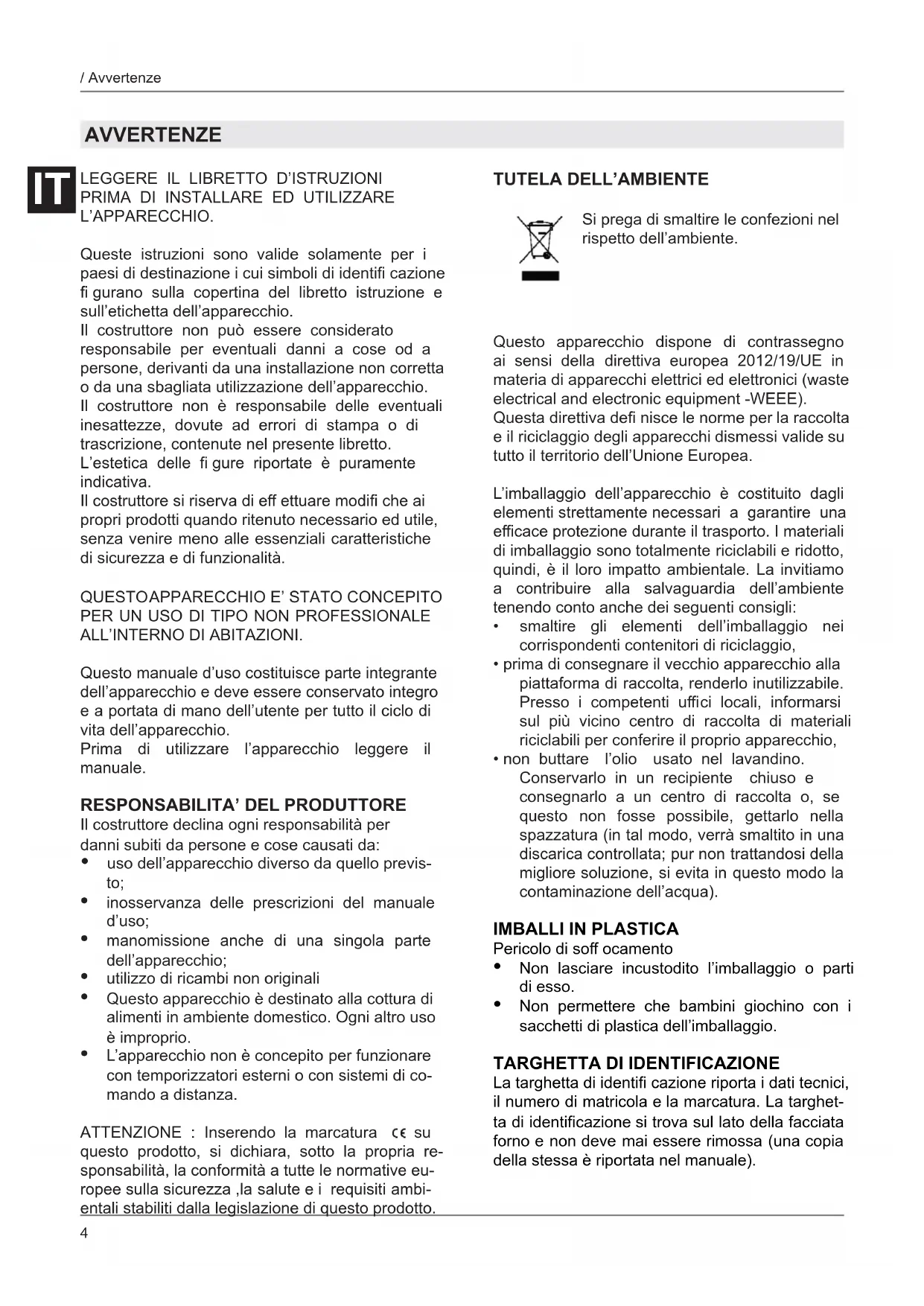 PER UN USO DI TIPO NON PROFESSIONALE ALL’INTERNO DI ABITAZIONI. Questo manuale d’uso costituisce parte integrante dell’apparecchio e deve essere conservato integro e a portata di mano dell’utente per tutto il ciclo di vita dell’apparecchio. Prima di utilizzare l’apparecchio leggere il manuale.