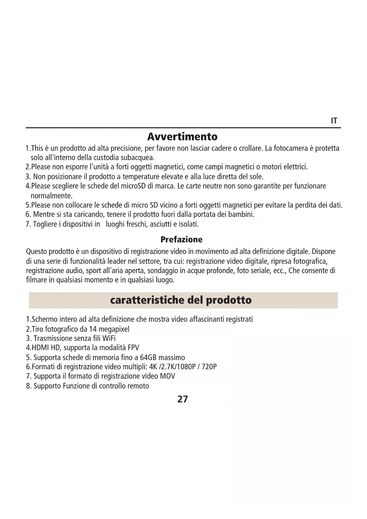 Avvertimento Prefazione 1.This è un prodotto ad alta precisione, per favore non lasciar cadere o crollare. La fotocamera è protetta solo all'interno della custodia subacquea. 2.Please non esporre l'unità a forti oggetti magnetici, come campi magnetici o motori elettrici.