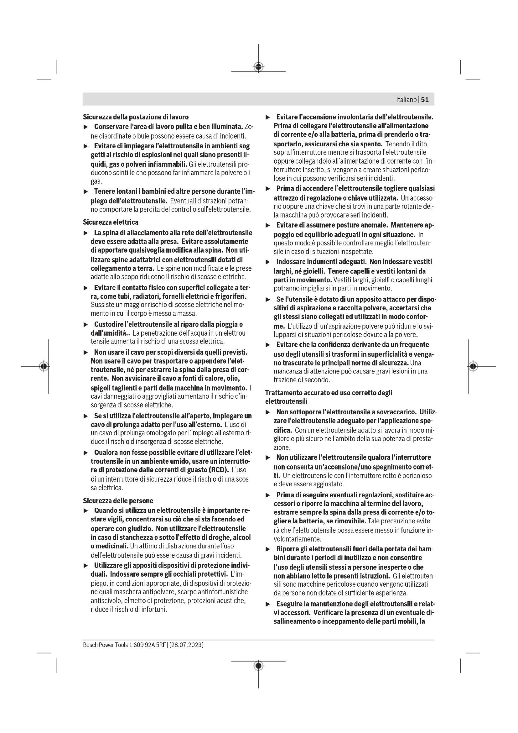 Il livello di vibrazione ed il valore di emissione acustica indi- cati nelle presenti istruzioni sono stati rilevati conformemen- te ad una procedura di misurazione unificata e sono utilizza- bili per confrontare gli elettroutensili. Le stesse procedure Bosch Power Tools 1 609 92A 5RF | (28.07.2023)56 | Italiano sono idonee anche per una valutazione temporanea del livel- lo di vibrazione e dell’emissione acustica. Il livello di vibrazione ed il valore di emissione acustica sono riferiti agli impieghi principali dell’elettroutensile; qualora, tuttavia, l’elettroutensile venisse utilizzato per altre applica- zioni, oppure con accessori differenti o in caso di insufficien- te manutenzione, il livello di vibrazione ed il valore di emis- sione acustica potrebbero variare. Ciò potrebbe aumentare sensibilmente l’emissione di vibrazioni e l’emissione acustica sull’intero periodo di funzionamento. Per valutare con precisione i valori di vibrazione e di emissio- ne acustica, andranno considerati anche i periodi nei quali l’utensile sia spento, oppure acceso, ma non utilizzato. Ciò potrebbe ridurre sensibilmente l’emissione di vibrazioni e l’emissione acustica sull’intero periodo di funzionamento. Adottare misure di sicurezza supplementari per proteggere l’operatore dall’effetto delle vibrazioni: ad esempio, sottopo- nendo a manutenzione l’elettroutensile e gli utensili accesso- ri, mantenendo calde le mani e organizzando i vari processi di lavoro. Batteria Bosch vende elettroutensili a batteria anche senza batteria. Per sapere se nella dotazione dell’elettroutensile è compresa una batteria, leggere quanto riportato sulla confezione. Ricarica della batteria u Utilizzare esclusivamente i caricabatterie indicati nei dati tecnici. Soltanto questi caricabatterie sono adatti al- le batterie al litio utilizzate nell’elettroutensile. Avvertenza: a causa delle norme internazionali per il tra- sporto, le batterie al litio vengono fornite parzialmente cari- che. Per assicurare la piena potenza della batteria, ricaricar- la completamente prima dell’impiego iniziale. Introduzione della batteria Spingere la batteria carica nell’apposito alloggiamento, sino a farlo scattare udibilmente in posizione. Rimozione della batteria Per rimuovere la batteria, premere i tasti di sbloccaggio ed estrarla. Durante tale operazione, non esercitare forza. Indicatore del livello di carica della batteria I 3 LED verdi dell’apposito indicatore indicano il livello di ca- rica della batteria. L’indicatore del livello di carica si illumina per soli 3s dopo l’accensione. LED Capacità Luce fissa, 3 LED verdi 60–100% Luce fissa, 2 LED verdi 30–60% Luce fissa, 1 LED verde 5–30% Luce lampeggiante, 1 LED verde 0–5% Protezione contro il sovraccarico in funzione della temperatura Se impiegato in modo conforme, l’elettroutensile non può subire sovraccarichi. In caso di carico eccessivo, o qualora venga utilizzato oltre il campo di temperatura consentito per la batteria, il numero di giri viene ridotto oppure l’elettrou- tensile si disattiva. In caso di numero di giri ridotto, l’elet- troutensile entra in funzione solamente al raggiungimento della temperatura consentita per la batteria o, in caso di cari- co ridotto, nuovamente con il massimo numero di giri. In ca- so di disinserimento automatico, spegnere l’elettroutensile, lasciar raffreddare la batteria e riaccendere l’elettroutensile. Indicatore per controllo della temperatura/protezione contro il sovraccarico L’indicatore a LED rosso contribuisce a proteggere la batte- ria dal surriscaldamento e il motore dal sovraccarico. Se l’indicatore a LED è acceso con luce rossa fissa, la tem- peratura della batteria è troppo elevata e l’elettroutensile si disattiva automaticamente. – Spegnere l’elettroutensile. – Lasciar raffreddare la batteria prima di proseguire a lavo- rare. Se l’indicatore a LED lampeggia con luce rossa, l’elettrou- tensile è bloccato e si disattiva automaticamente. Estrarre l’elettroutensile dal pezzo in lavorazione. Non appena il blocco sarà stato eliminato, l’elettroutensile ri- prenderà il normale funzionamento. Avvertenze per l’impiego ottimale della batteria Proteggere la batteria ricaricabile da umidità ed acqua. Conservare la batteria esclusivamente nel campo di tempe- ratura fra −20 °C e 50°C. Non lasciare la batteria all’interno dell’auto, ad es. nel periodo estivo. Una sensibile riduzione della durata del funzionamento dopo l’operazione di ricarica sta ad indicare che la batteria ricari- cabile dovrà essere sostituita. Attenersi alle indicazioni relative allo smaltimento. Montaggio Montaggio del dispositivo di sicurezza u Prima di qualsiasi intervento sull’elettroutensile (ad es. interventi di manutenzione, sostituzione dell’ac- cessorio ecc.), prelevare la batteria, anche nel caso in cui occorra trasportarlo o conservarlo. In caso di azio- namento accidentale dell’interruttore di avvio/arresto sussiste pericolo di lesioni. Avvertenza: dopo una rottura della mola abrasiva durante il funzionamento, oppure in caso di danni ai dispositivi di al- loggiamento sulla cuffia di protezione/sull’elettroutensile, l’elettroutensile andrà immediatamente inviato al Servizio Clienti post-vendita. Per gli indirizzi, vedere il paragrafo «Servizio di assistenza e consulenza tecnica». Cuffia di protezione per levigatura u Durante la levigatura, utilizzare sempre l’apposita cuf- fia di protezione(7). 1 609 92A 5RF | (28.07.2023) Bosch Power ToolsItaliano | 57 Cuffia di protezione per taglio u Durante il taglio, utilizzare sempre l’apposita cuffia di protezione(10). u Per il taglio nella pietra, provvedere ad un’adeguata aspirazione della polvere. Montaggio della cuffia di protezione (vedere Fig. A) Innestare la cuffia di protezione per taglio (10) su quella per levigatura (7), sino a far scattare saldamente in posizione quest’ultima. Regolazione della cuffia di prot