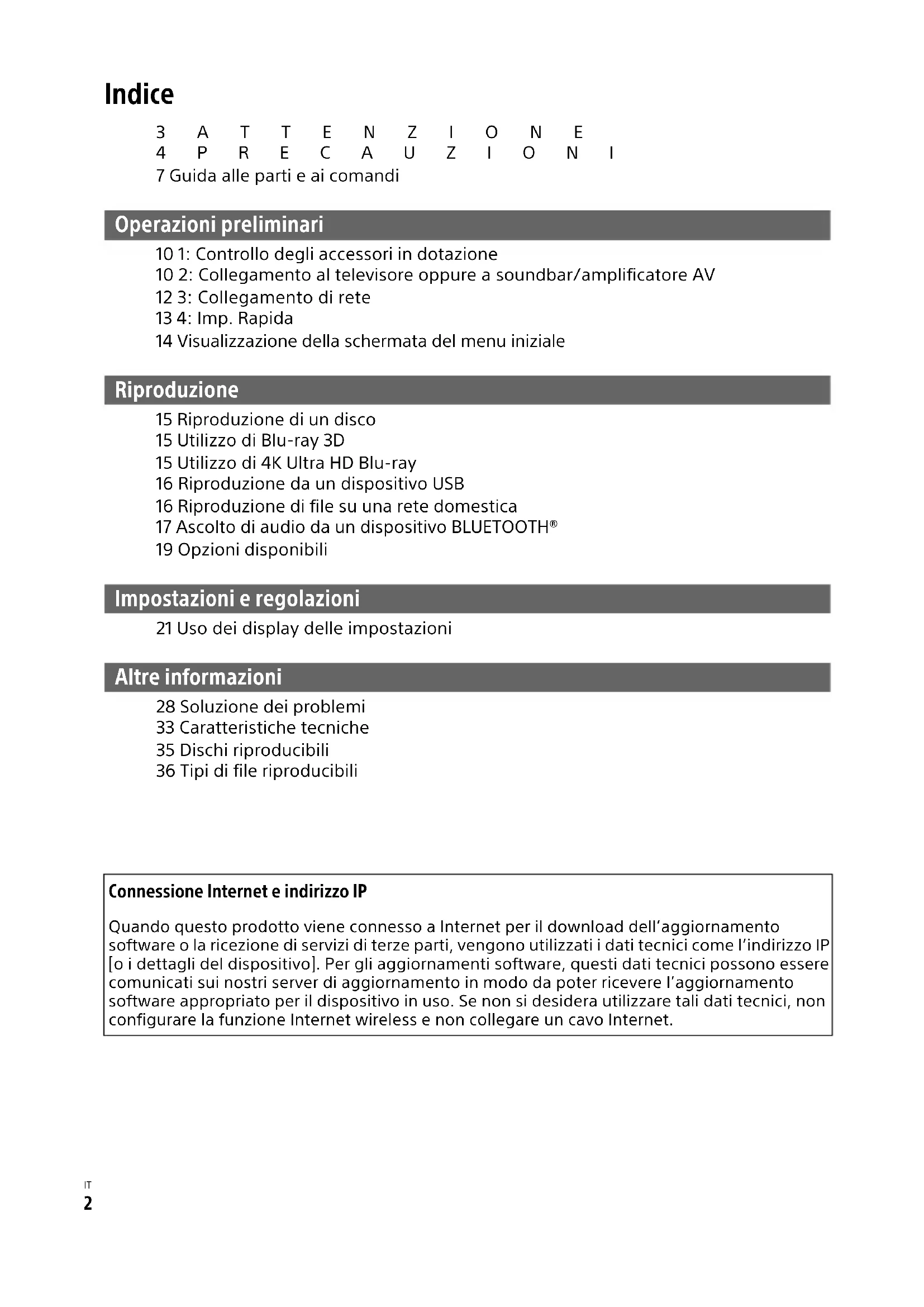 Indice 3ATTENZIONE 4PRECAUZIONI 7 Guida alle parti e ai comandi Operazioni preliminari 10 1: Controllo degli accessori in dotazione 10 2: Collegamento al televisore oppure a soundbar/amplificatore AV 12 3: Collegamento di rete 13 4: Imp. Rapida 14 Visualizzazione della schermata del menu iniziale Riproduzione 15 Riproduzione di un disco 15 Utilizzo di Blu-ray 3D 15 Utilizzo di 4K Ultra HD Blu-ray 16 Riproduzione da un dispositivo USB 16 Riproduzione di file su una rete domestica 17 Ascolto di audio da un dispositivo BLUETOOTH® 19 Opzioni disponibili Impostazioni e regolazioni 21 Uso dei display delle impostazioni Altre informazioni 28 Soluzione dei problemi 33 Caratteristiche tecniche 35 Dischi riproducibili 36 Tipi di file riproducibili Connessione Internet e indirizzo IP Quando questo prodotto viene connesso a Internet per il download dell’aggiornamento software o la ricezione di servizi di terze parti, vengono utilizzati i dati tecnici come l’indirizzo IP [o i dettagli del dispositivo]. Per gli aggiornamenti software, questi dati tecnici possono essere comunicati sui nostri server di aggiornamento in modo da poter ricevere l’aggiornamento software appropriato per il dispositivo in uso. Se non si desidera utilizzare tali dati tecnici, non configurare la funzione Internet wireless e non collegare un cavo Internet.3