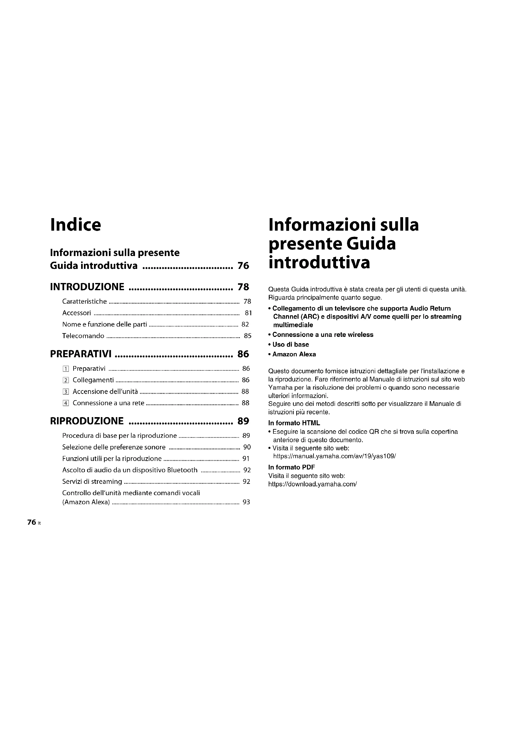 - Amazon Alexa Questo documento fornisce istruzioni dettagliate per l'installazione e la riproduzione. Fare riferimento al Manuale di istruzioni sul sito web Yamaha per la risoluzione dei problemi o quando sono necessarie ulteriori informazioni. Seguire uno dei metodi descritti sotto per visualizzare il Manuale di istruzioni più recente. In formato HTML