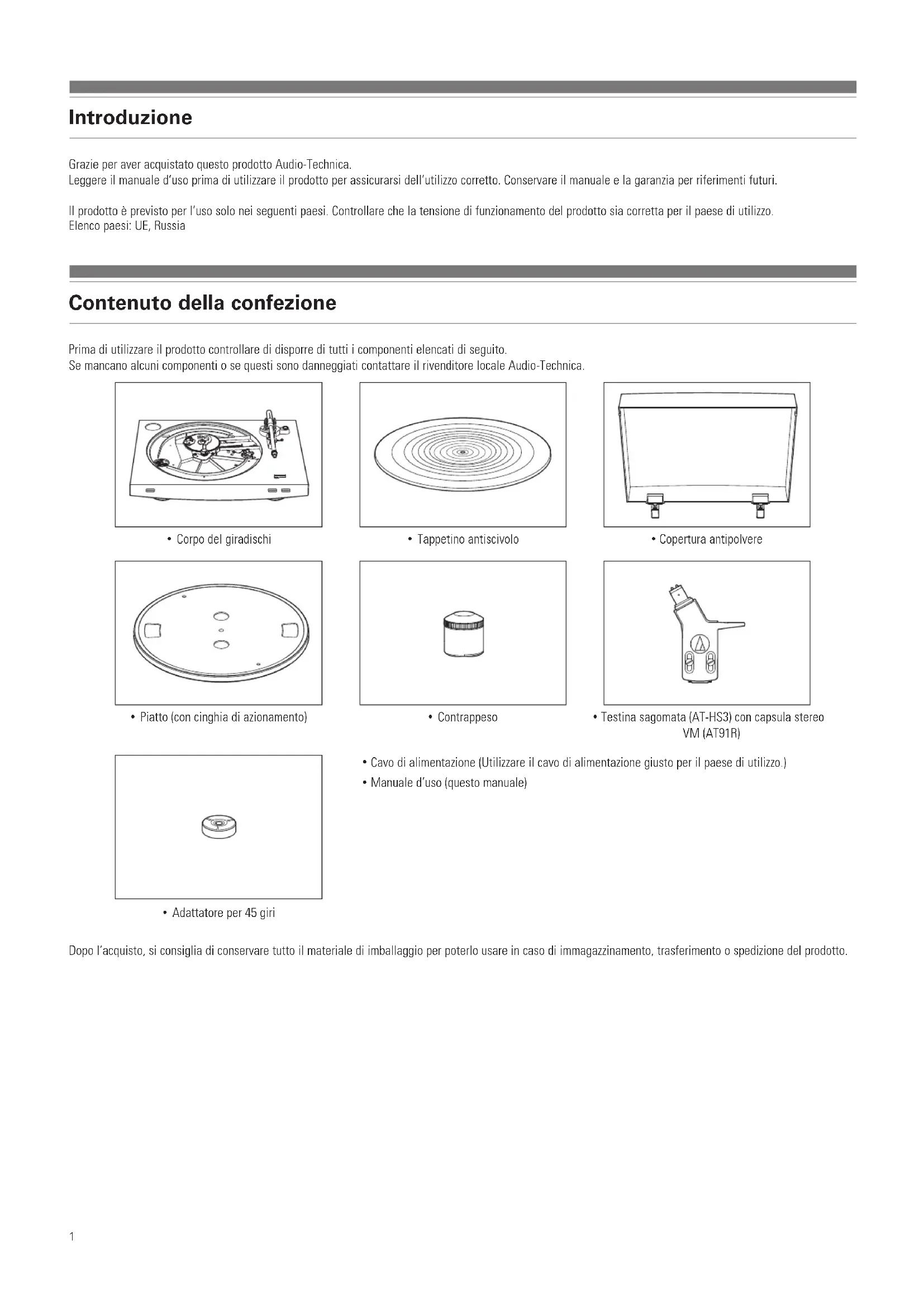 Adattatore per 45 giri Dopo l’acquisto, si consiglia di conservare tutto il materiale di imballaggio per poterlo usare in caso di immagazzinamento, trasferimento o spedizione del prodotto.2