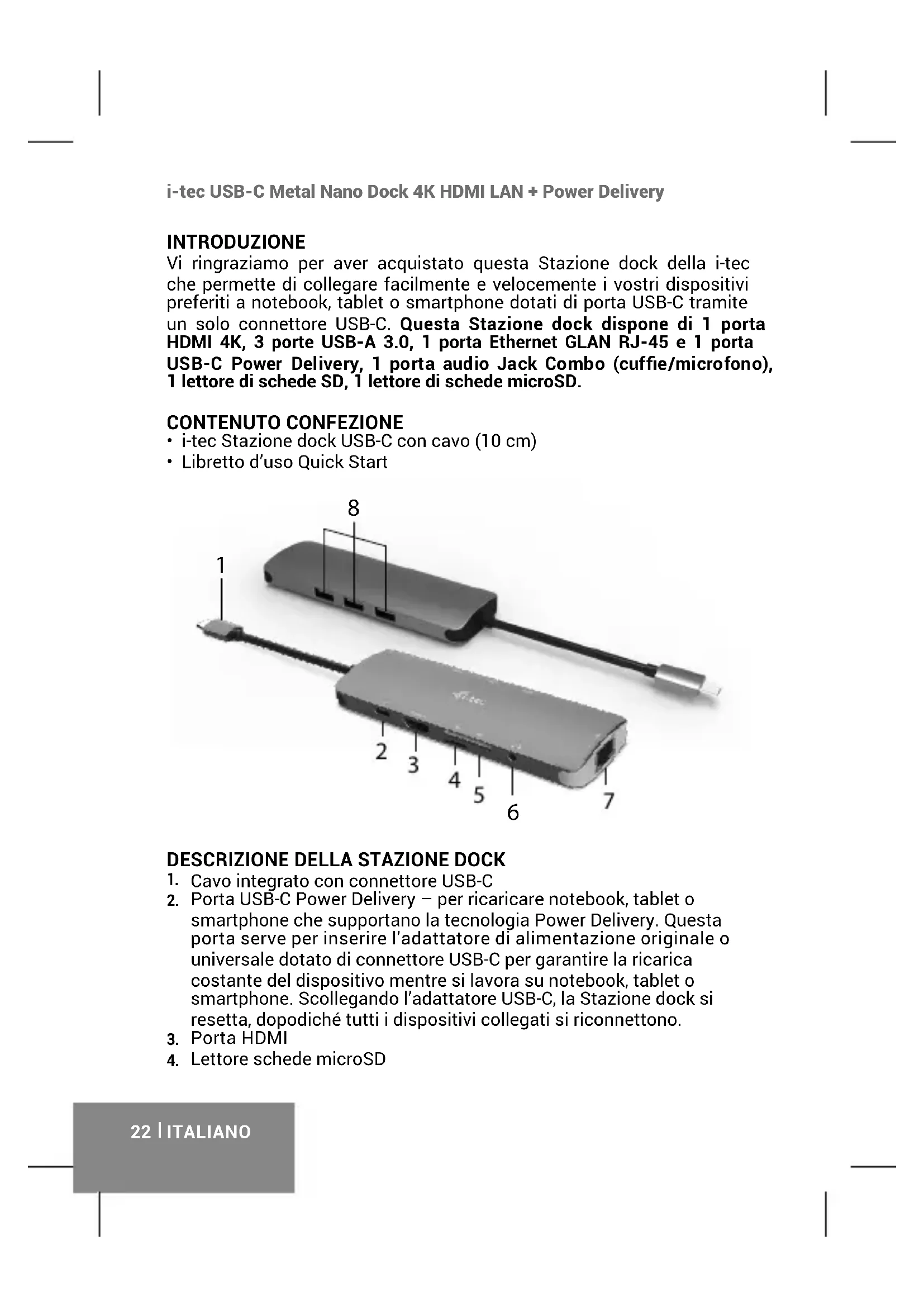 i-tec USB-C Metal Nano Dock 4K HDMI LAN + Power Delivery INTRODUZIONE Vi ringraziamo per aver acquistato questa Stazione dock della i-tec che permette di collegare facilmente e velocemente i vostri dispositivi preferiti a notebook, tablet o smartphone dotati di porta USB-C tramite un solo connettore USB-C. Questa Stazione dock dispone di 1 porta HDMI 4K, 3 porte USB-A 3.0, 1 porta Ethernet GLAN RJ-45 e 1 porta USB-C Power Delivery, 1 porta audio Jack Combo (cufe/microfono), 1 lettore di schede SD, 1 lettore di schede microSD. CONTENUTO CONFEZIONE