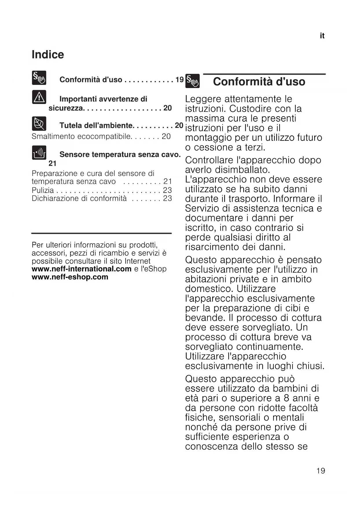 Preparazione e cura del sensore di temperatura senza cavo . . . . . . . . . 21 Pulizia . . . . . . . . . . . . . . . . . . . . . . . . 23 Dichiarazione di conformità . . . . . . . 23 Produktinfo Per ulteriori informazioni su prodotti, accessori, pezzi di ricambio e servizi è possibile consultare il sito Internet www.neff-international.com e l'eShop www.neff-eshop.com 8 Conformità d'uso Conformità d'uso Leggere attentamente le istruzioni. Custodire con la massima cura le presenti istruzioni per l'uso e il montaggio per un utilizzo futuro o cessione a terzi. Controllare l'apparecchio dopo averlo disimballato. L'apparecchio non deve essere utilizzato se ha subito danni durante il trasporto. Informare il Servizio di assistenza tecnica e documentare i danni per iscritto, in caso contrario si perde qualsiasi diritto al risarcimento dei danni. Questo apparecchio è pensato esclusivamente per l'utilizzo in abitazioni private e in ambito domestico. Utilizzare l'apparecchio esclusivamente per la preparazione di cibi e bevande. Il processo di cottura deve essere sorvegliato. Un processo di cottura breve va sorvegliato continuamente. Utilizzare l'apparecchio esclusivamente in luoghi chiusi. Questo apparecchio può essere utilizzato da bambini di età pari o superiore a 8 anni e da persone con ridotte facoltà fisiche, sensoriali o mentali nonché da persone prive di sufficiente esperienza o conoscenza dello stesso seit