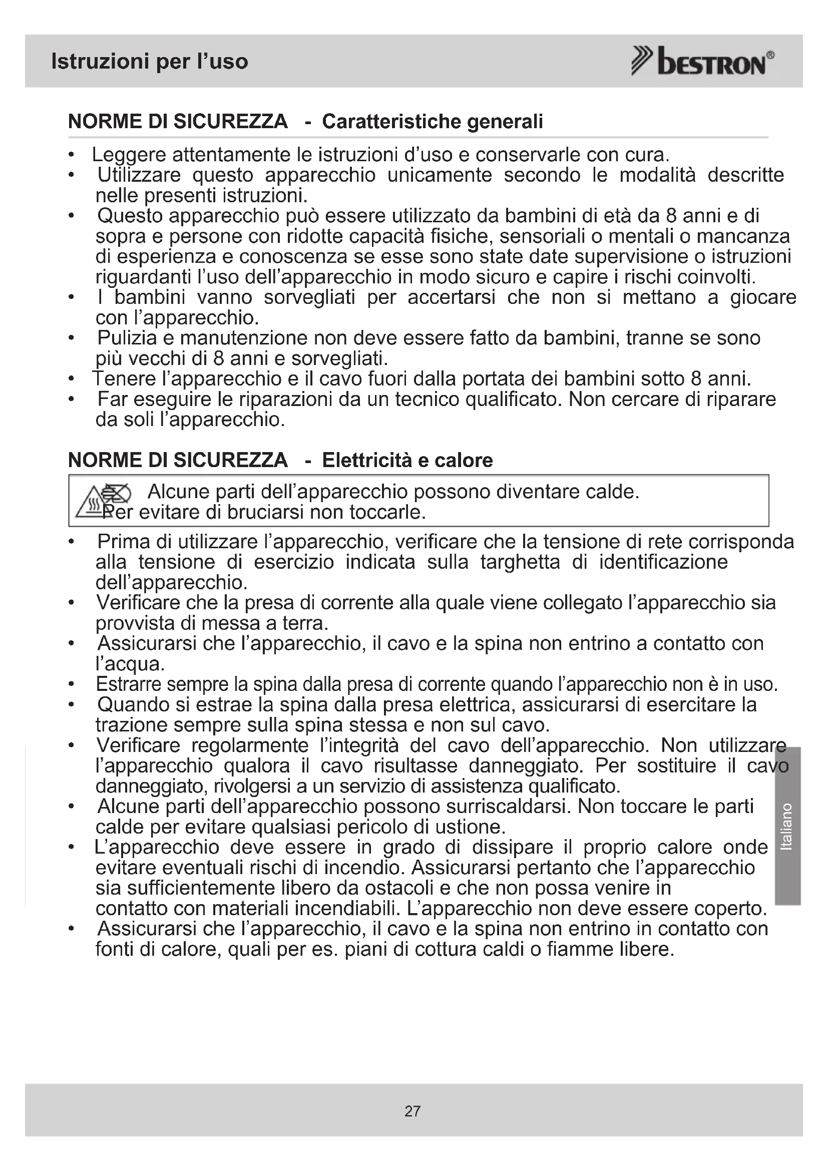 - Far eseguire le riparazioni da un tecnico qualificato. Non cercare di riparare da soli l’apparecchio. NORME DI SICUREZZA - Elettricità e calore
