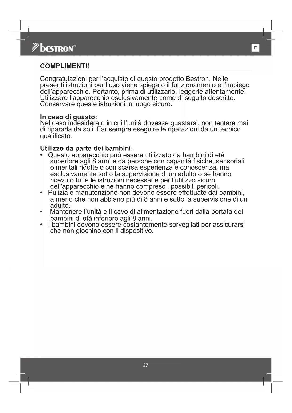 Congratulations per l'acquisto di quello prodotto Bestron. Nelle presenti istruzioni per l'uso viene spiegato il funzionamento e l'impiego dell'apparecchio. Pertanto, prima di utilizzato, leggerle attendamente.