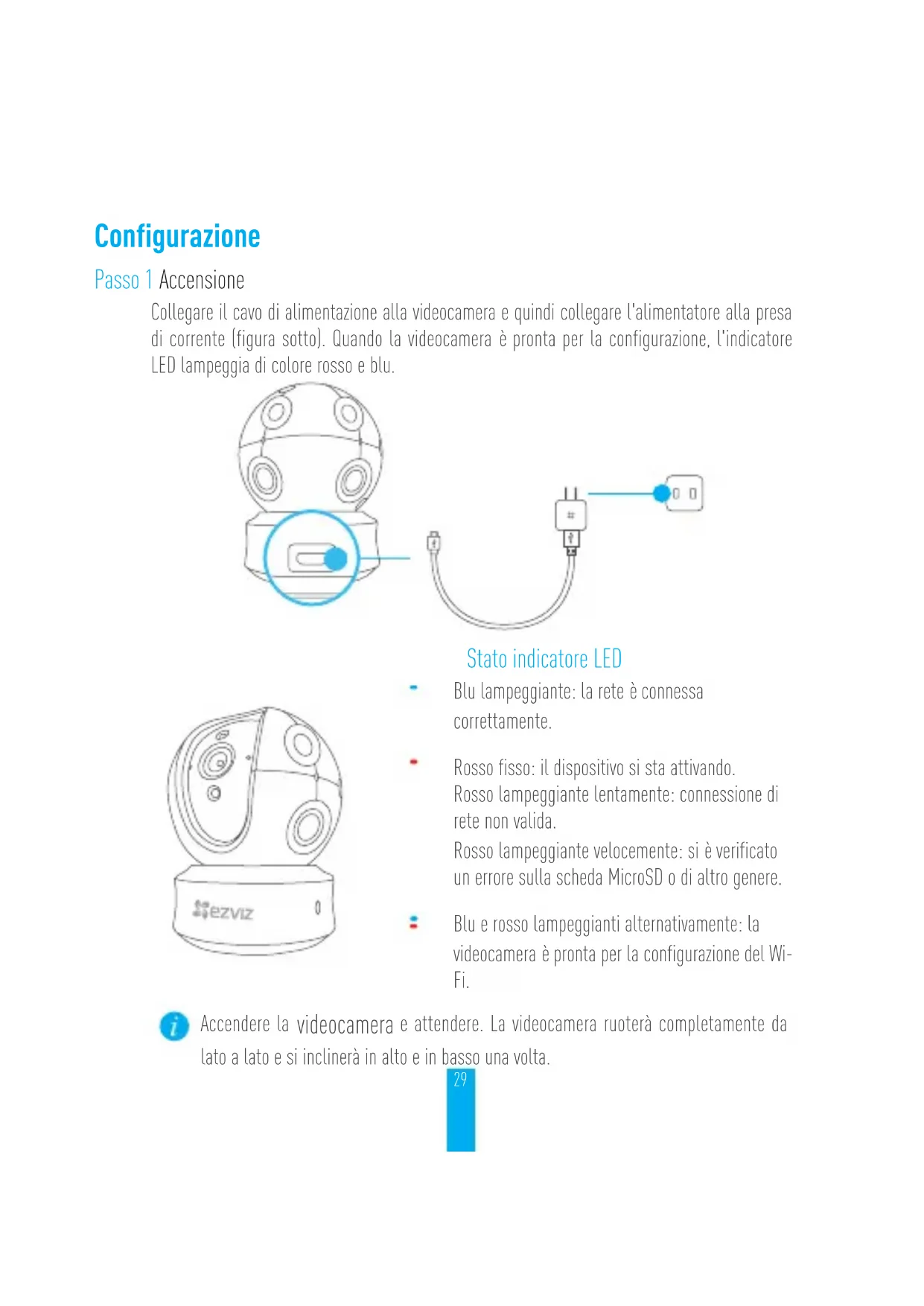 connectée à un réseau Wi-Fi, elle se reconnectera automatiquement au même réseau Wi-Fi.27 Annexe Contenu du carton 1 Caméra 1base 1câble d’alimentation 1gabarit de perçage 1kit de visserie 1adaptateur d’alimentation 1guide de démarrage rapide28 Type A Type B Type Indicateur LED Haut-parleur Interface d’alimentation Indicateur LED Haut-parleur Interface d’alimentation Interface de réseau local (LAN)29 Configurazione Passo 1 Accensione Collegare il cavo di alimentazione alla videocamera e quindi collegare l'alimentatore alla presa di corrente (figura sotto). Quando la videocamera è pronta per la configurazione, l'indicatore LED lampeggia di colore rosso e blu. Stato indicatore LED Blu lampeggiante: la rete è connessa correttamente. Rosso fisso: il dispositivo si sta attivando. Rosso lampeggiante lentamente: connessione di rete non valida. Rosso lampeggiante velocemente: si è verificato un errore sulla scheda MicroSD o di altro genere. Blu e rosso lampeggianti alternativamente: la videocamera è pronta per la configurazione del Wi- Fi. Accendere la videocamera e attendere. La videocamera ruoterà completamente da lato a lato e si inclinerà in alto e in basso una volta.30 Passo 2 Configurazione della videocamera
