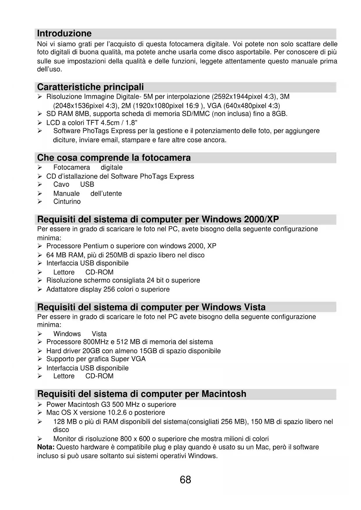 - Appendice: Specificazioni Introduzione Noi vi siamo grati per l’acquisto di questa fotocamera digitale. Voi potete non solo scattare delle foto digitali di buona qualità, ma potete anche usarla come disco asportabile. Per conoscere di più sulle sue impostazioni della qualità e delle funzioni, leggete attentamente questo manuale prima dell’uso. Caratteristiche principali ¾ Risoluzione Immagine Digitale- 5M per interpolazione (2592x1944pixel 4:3), 3M (2048x1536pixel 4:3), 2M (1920x1080pixel 16:9 ), VGA (640x480pixel 4:3) ¾ SD RAM 8MB, supporta scheda di memoria SD/MMC (non inclusa) fino a 8GB. ¾ LCD a colori TFT 4.5cm / 1.8” ¾ Software PhoTags Express per la gestione e il potenziamento delle foto, per aggiungere diciture, inviare email, stampare e fare altre cose ancora. Che cosa comprende la fotocamera ¾ Fotocamera digitale ¾ CD d’istallazione del Software PhoTags Express ¾ Cavo USB ¾ Manuale dell’utente ¾ Cinturino Requisiti del sistema di computer per Windows 2000/XP Per essere in grado di scaricare le foto nel PC, avete bisogno della seguente configurazione minima: ¾ Processore Pentium o superiore con windows 2000, XP ¾ 64 MB RAM, più di 250MB di spazio libero nel disco ¾ Interfaccia USB disponibile ¾ Lettore CD-ROM ¾ Risoluzione schermo consigliata 24 bit o superiore ¾ Adattatore display 256 colori o superiore Requisiti del sistema di computer per Windows Vista Per essere in grado di scaricare le foto nel PC avete bisogno della seguente configurazione minima: ¾ Windows Vista ¾ Processore 800MHz e 512 MB di memoria del sistema ¾ Hard driver 20GB con almeno 15GB di spazio disponibile ¾ Supporto per grafica Super VGA ¾ Interfaccia USB disponibile ¾ Lettore CD-ROM Requisiti del sistema di computer per Macintosh ¾ Power Macintosh G3 500 MHz o superiore ¾ Mac OS X versione 10.2.6 o posteriore ¾ 128 MB o più di RAM disponibili del sistema(consigliati 256 MB), 150 MB di spazio libero nel disco ¾ Monitor di risoluzione 800 x 600 o superiore che mostra milioni di colori Nota: Questo hardware è compatibile plug e play quando è usato su un Mac, però il software incluso si può usare soltanto sui sistemi operativi Windows.69 Un’occhiata veloce alla fotocamera p. 7968