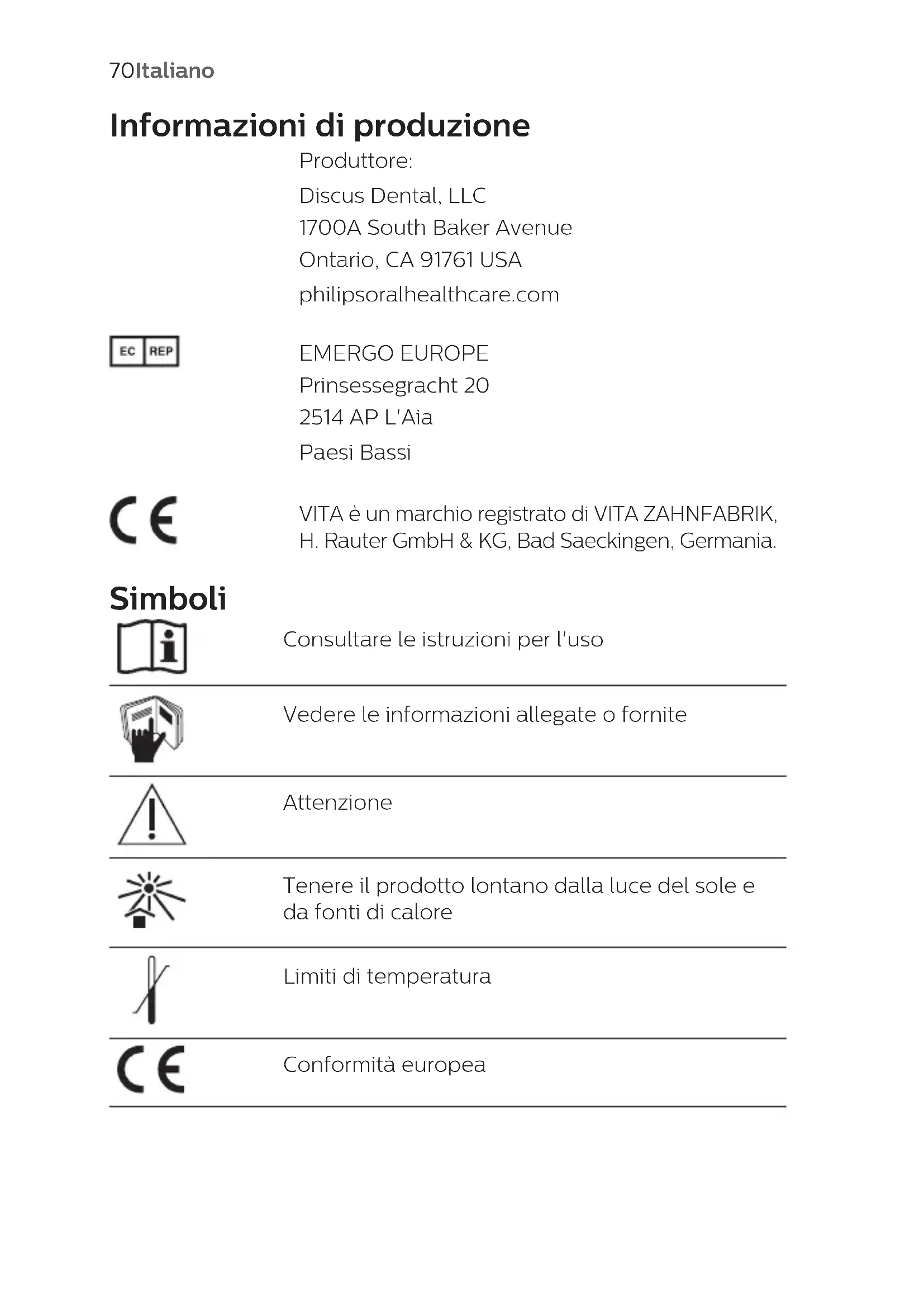 Controllate i materiali isolanti per accertarvi che "nessun tessuto rosa" sia visibile. Se necessario sostituite o aggiungete materiale isolante. 24 Seguite le stesse istruzioni sopra riportate per le sessioni rimanenti. 25 Al termine di tutte le sessioni su una guida luce, sul display viene visualizzato "Sessions Complete" (Sessioni completate) per tre secondi, seguito da "Guide Status – Replace Guide" (Stato guida - Sostituisci guida). Staccate la guida luce dal divaricatore IsoPrep e allontanate l'acceleratore a LED dal paziente. Nota: Per i pazienti sensibili, riducete l'intensità dell'acceleratore a LED. Tenete presente, tuttavia, che questo potrebbe comportare una quarta sessione di 15 minuti. Suggerimento: Se il paziente riscontra sensibilità ai denti, applicate il gel Relief ACP (contenuto nel kit di strumenti o nel kit di post-trattamento e manutenzione del paziente) sulla supercie della lingua per la durata delle sessioni rimanenti. Al termine dell'ultima sessione, staccate la guida luce dal divaricatore e allontanate l'acceleratore a LED dal paziente. 84 ItalianoAspirate o rimuovete il gel sbiancante dai denti. Inumidite la garza e i rotolini di cotone, quindi rimuovete i materiali isolanti. Rimuovete eventuali residui di materiale protettivo dagli spazi interprossimali utilizzando il lo interdentale. 26 Reinserite il divaricatore e scattate una foto della situazione "dopo" il trattamento, usando il campione di colore più chiaro. Misurate la variazione di tonalità facendo riferimento alla guida alla tonalità. Ottimizzazione dei risultati Ricordate al paziente di non consumare caè, tè, vino rosso e tabacco per almeno due ore dopo il trattamento sbiancante, no a quando la pellicola salivare non si riforma sui denti. Lo sbiancamento dei denti richiede manutenzione. Il paziente può scegliere di sottoporsi nuovamente al trattamento sbiancante o di utilizzare un prodotto di manutenzione 1-3 notti ogni 4-6 mesi, a seconda delle proprie abitudini. Cura e mantenimento post-trattamento a casa Riduzione della sensibilità È stato dimostrato che il gel Philips Relief ACP per la cura orale riduce la sensibilità dei denti. Ponete il gel Relief ACP per la cura orale in vassoi per uso domestico e somministrate al paziente. Il normale tempo di posa è di 10-30 minuti una volta al giorno. Se non è disponibile un vassoio, il prodotto va spazzolato sui denti. Il paziente non deve sputare per circa 3 minuti. per ottenere i risultati migliori, non bisogna bere né mangiare per 30 minuti dopo l'applicazione. Per informazioni dettagliate, consultate le Istruzioni per l'uso del gel per la cura orale Relief ACP. 85ItalianoManutenzione dello sbiancamento a casa 24 ore dopo il trattamento sbiancante, il paziente può utilizzare il gel sbiancante NiteWhite o DayWhite per mantenere o migliorare ulteriormente i risultati. Per informazioni dettagliate, consultate le istruzioni per l'uso del gel sbiancante Zoom! NiteWhite/ DayWhite per il paziente. Istruzioni per la conservazione Il gel sbiancante deve essere conservato a una temperatura compresa tra 2 °C e 10 °C. La conservazione ad una temperatura superiore a 10 °C può causare una riduzione della durata del prodotto. 86 ItalianoInformaţii despre producţie Fabricant: Discus Dental, LLC 1700A South Baker Avenue Ontario, CA 91761 USA philipsoralhealthcare.com EMERGO EUROPE Prinsessegracht 20 2514 AP The Hague Olanda VITA este o marcă comercială înregistrată a VITA ZAHNFABRIK, H. Rauter GmbH & KG, Bad Saeckingen, Germania. Simboluri Consultaţi instrucţiunile de utilizare Trimitere la informaţii incluse sau atașate Atenţie Păstraţi acest produs ferit de lumină solară directă sau de căldură Limite de temperatură Conformitate europeană 87RomânăFabricant A se utiliza până la data de Cod lot Număr de catalog Autorizat în Comunitatea Europeană A nu se reutiliza. Acest produs este destinat utilizării pe un singur pacient în timpul unei singure proceduri. A se păstra la rece Informaţii importante Citiţi și înţelegeţi informaţiile din aceste instrucţiuni de utilizare și din instrucţiunile de utilizare furnizate împreună cu gelul pentru albirea accelerată de lumină a dinţilor WhiteSpeed Philips Zoom! (gelul de albire), înainte de a începe tratamentul de albire. Gelul de albire trebuie scos de la refrigerare și încălzit la temperatura camerei pentru a se îngroșa, înainte de a aplicat pe dinţii pacientului. Fie: - scoateţi seringa de la refrigerare cu cel puţin 6 ore înainte de utilizare (de preferat cu o noapte înainte), e, - dacă este scoasă chiar înainte de utilizare, introduceţi seringa într-o cană cu apă caldă (49 °C) timp de 10 minute. Îndepărtaţi seringa din apă și așteptaţi 5 minute înainte de a scoate gelul.