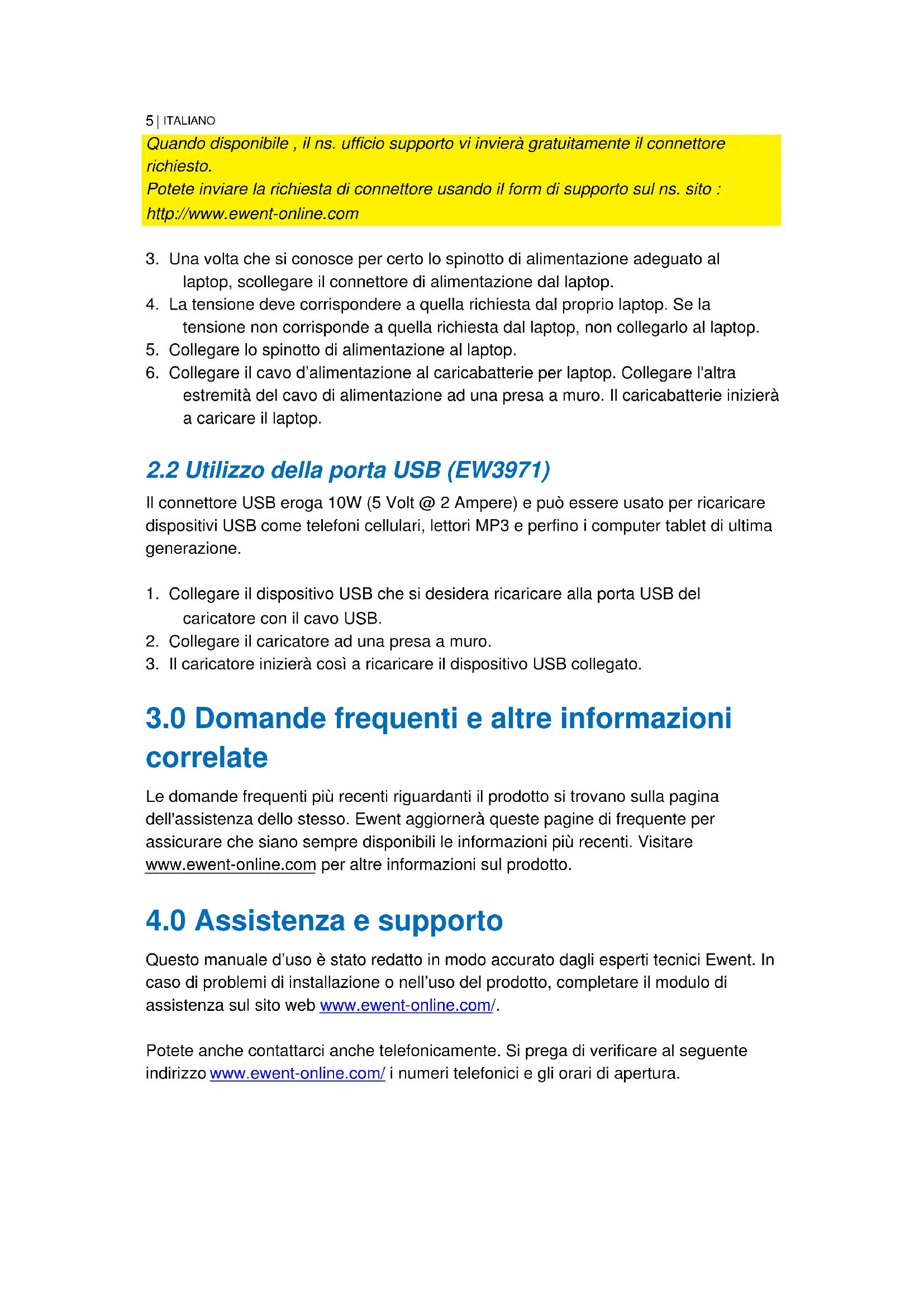 Se il vs. LAPTOP/NOTEBOOK necessita di altri connettori oltre a quelli forniti all'interno della confezione, potete inviare una richiesta per il connettore del quale avete necessità ad Ewent (previo consulto della lista connettori all'interno di questo manuale).