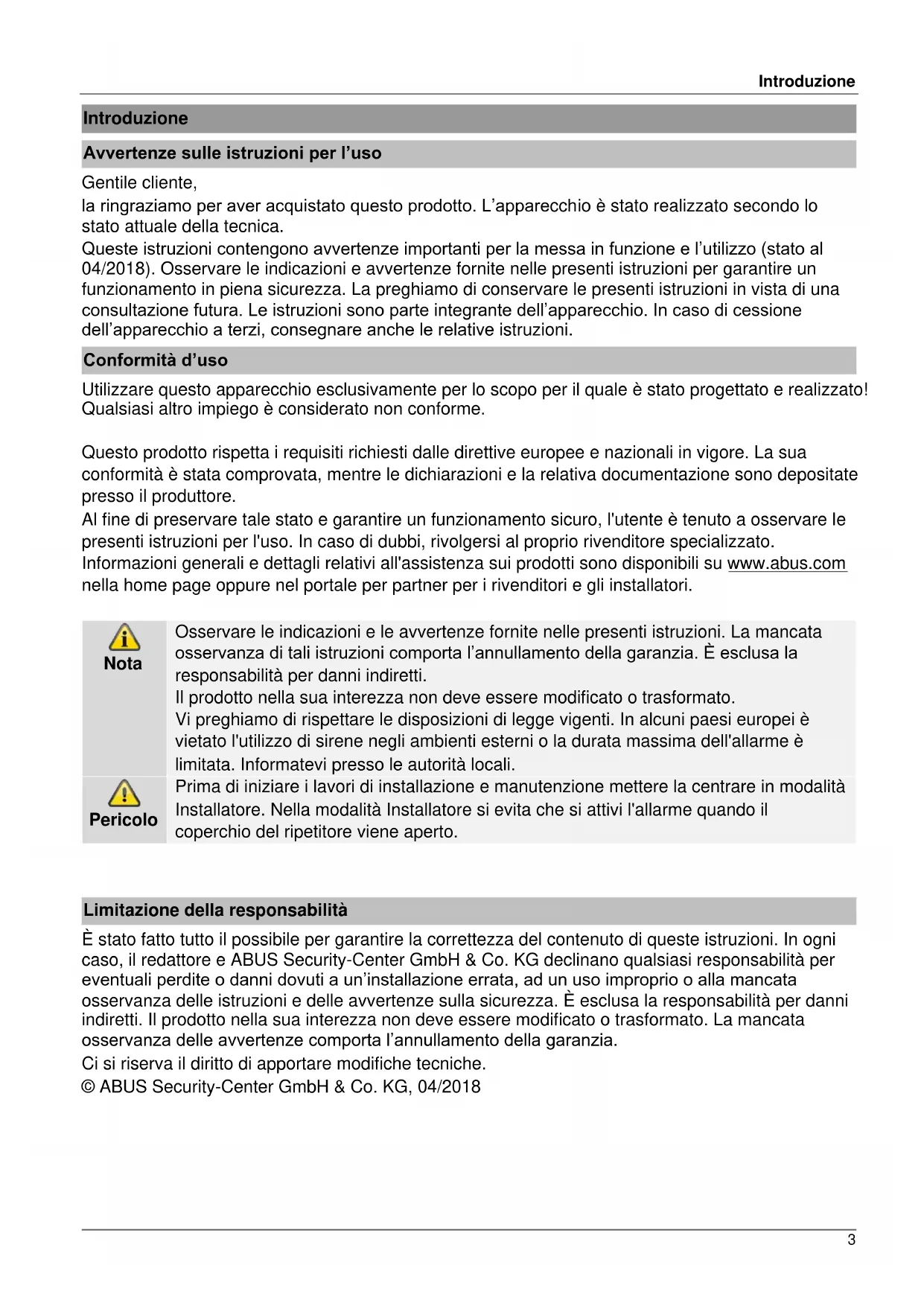 Limitazione della responsabilità È stato fatto tutto il possibile per garantire la correttezza del contenuto di queste istruzioni. In ogni caso, il redattore e ABUS Security-Center GmbH & Co. KG declinano qualsiasi responsabilità per eventuali perdite o danni dovuti a un’installazione errata, ad un uso improprio o alla mancata osservanza delle istruzioni e delle avvertenze sulla sicurezza. È esclusa la responsabilità per danni indiretti. Il prodotto nella sua interezza non deve essere modificato o trasformato. La mancata osservanza delle avvertenze comporta l’annullamento della garanzia. Ci si riserva il diritto di apportare modifiche tecniche. © ABUS Security-Center GmbH & Co. KG, 04/2018Avvertenze di sicurezza