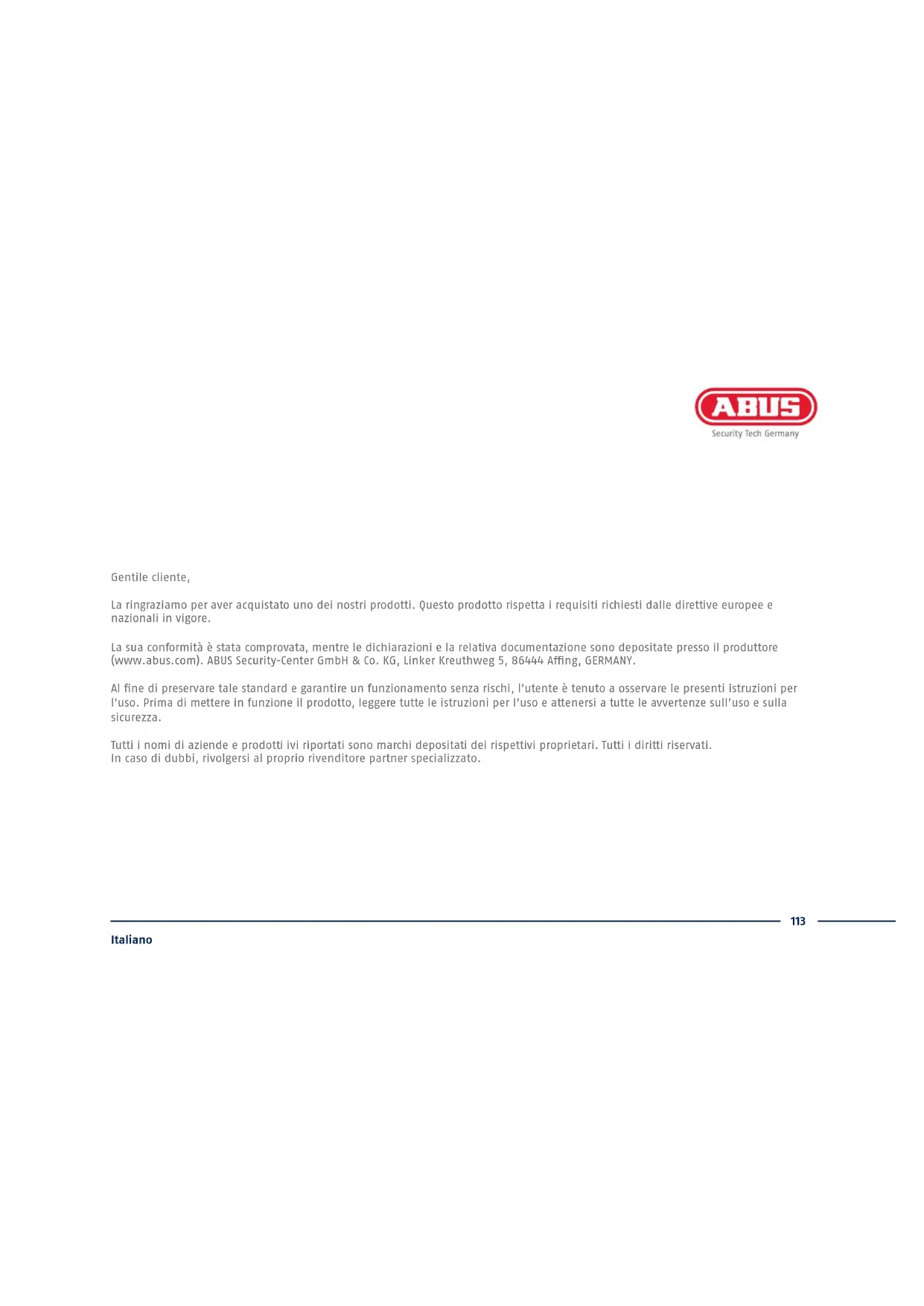 REGISTRATORE IP La presente guida rapida descrive i primi passaggi per eseguire la congurazione del registratore IP. Informazioni dettagliate sono disponibili nelle istruzioni per l'uso.113 Italiano Gentile cliente, La ringraziamo per aver acquistato uno dei nostri prodotti. Questo prodotto rispetta i requisiti richiesti dalle direttive europee e nazionali in vigore. La sua conformità è stata comprovata, mentre le dichiarazioni e la relativa documentazione sono depositate presso il produttore (www.abus.com). ABUS Security-Center GmbH & Co. KG, Linker Kreuthweg 5, 86444 Ang, GERMANY. Al ne di preservare tale standard e garantire un funzionamento senza rischi, l'utente è tenuto a osservare le presenti istruzioni per l'uso. Prima di mettere in funzione il prodotto, leggere tutte le istruzioni per l’uso e attenersi a tutte le avvertenze sull’uso e sulla sicurezza. Tutti i nomi di aziende e prodotti ivi riportati sono marchi depositati dei rispettivi proprietari. Tutti i diritti riservati. In caso di dubbi, rivolgersi al proprio rivenditore partner specializzato.114 Italiano DOTAZIONE TVVR36300: