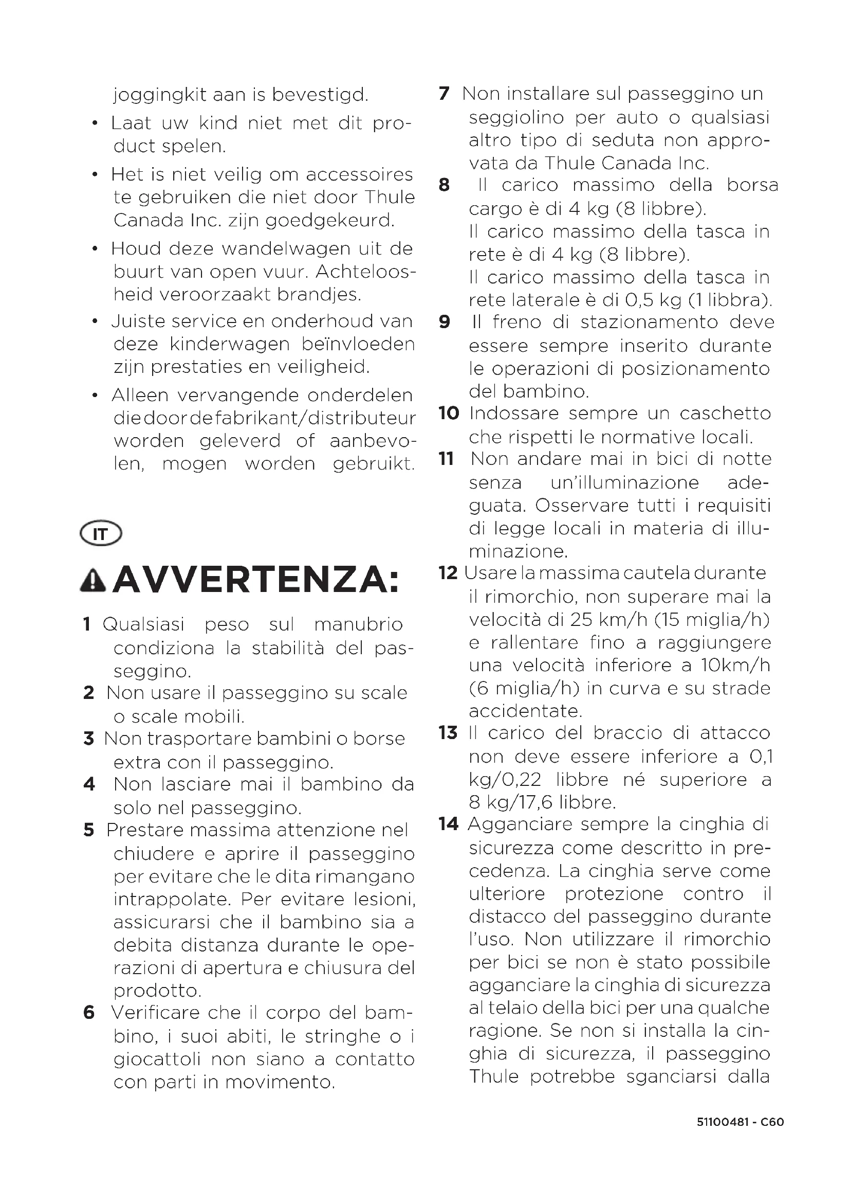 AVVERTENZA: 1 Qualsiasi peso sul manubrio condiziona la stabilità del pas- seggino. 2 Non usare il passeggino su scale o scale mobili. 3 Non trasportare bambini o borse extra con il passeggino. 4 Non lasciare mai il bambino da solo nel passeggino. 5 Prestare massima attenzione nel chiudere e aprire il passeggino per evitare che le dita rimangano intrappolate. Per evitare lesioni, assicurarsi che il bambino sia a debita distanza durante le ope- razioni di apertura e chiusura del prodotto. 6 Verificare che il corpo del bam- bino, i suoi abiti, le stringhe o i giocattoli non siano a contatto con parti in movimento. 7 Non installare sul passeggino un seggiolino per auto o qualsiasi altro tipo di seduta non appro- vata da Thule Canada Inc. 8 Il carico massimo della borsa cargo è di 4 kg (8 libbre). Il carico massimo della tasca in rete è di 4 kg (8 libbre). Il carico massimo della tasca in rete laterale èdi 0,5 kg (1 libbra). 9 Il freno di stazionamento deve essere sempre inserito durante le operazioni di posizionamento del bambino. 10 Indossare sempre un caschetto che rispetti le normative locali. 11 Non andare mai in bici di notte senza un’illuminazione ade- guata. Osservare tutti i requisiti di legge locali in materia di illu- minazione. 12 Usare la massima cautela durante il rimorchio, non superare mai la velocità di 25 km/h (15miglia/h) e rallentare fino a raggiungere una velocità inferiore a 10km/h (6 miglia/h) in curva e su strade accidentate. 13 Il carico del braccio di attacco non deve essere inferiore a 0,1 kg/0,22 libbre né superiore a 8kg/17,6 libbre. 14 Agganciare sempre la cinghia di sicurezza come descritto in pre- cedenza. La cinghia serve come ulteriore protezione contro il distacco del passeggino durante l’uso. Non utilizzare il rimorchio per bici se non è stato possibile agganciare la cinghia di sicurezza al telaio della bici per una qualche ragione. Se non si installa la cin- ghia di sicurezza, il passeggino Thule potrebbe sganciarsi dalla51100481 - C 61 bici. Un meccanico specializzato qualificato dovrebbe eettuare un controllo di sicurezza della bici prima di collegarla al rimor- chio. 15 Il passeggino diventa instabile se si supera il limite di peso sta- bilito dal produttore. Non usare il passeggino per bambini di peso superiore a quello indicato. 16 Assicurarsi che tutti i dispositivi di blocco siano inseriti prima dell’utilizzo. 17 Prima di ogni spostamento, verificare che entrambe le ruote siano ben fissate nell’assale del passeggino. 18 Questo rimorchio non è adatto ai bambini al di sotto dei 6 mesi se non utilizzato con un accessorio Thule approvato per neonati. a. I bambini devono avere almeno 6 mesi ed essere in grado di stare seduti in posizione eretta senza la supervisione di un adulto. b. Il bambino deve avere un’età suciente a indossare un casco e a stare seduto in posizione eretta senza la supervisione di un adulto. Se il bambino ha meno di un anno, consultare un pediatra. 19 Evitare di procurare lesioni gravi al bambino se cade o scivola fuori usando sempre le cinture di sicurezza. 20 Se si usa il passeggino con un solo bambino, il bambino deve essere seduto a destra. 21 L’utilizzatore del passeggino Thule deve essere consapevole dei rischi legati all’esposizione all’aria fredda, al colpo di calore o all’esposizione prolungata dei bambini meno attivi a tempera- ture fredde o calde, senza una adeguata ventilazione o idrata- zione. 22 Quando questo passeggino per bambini viene usato come rimorchio per la bicicletta, la copertura anti-intemperie deve essere chiusa per evitare l’in- gresso di detriti. 23 Un elemento catarifrangente conforme alle normative locali deve essere visibile sulla parte posteriore del passeggino se usato con la bicicletta. 24 Prima di ogni spostamento, assicurarsi che il passeggino agganciato non interferisca con i freni, i pedali o lo sterzo della bicicletta. 25 L’uso del rimorchio cambia la stabilità, irequisiti dei freni e le caratteristiche di pedalata della bicicletta. 26 Quando si svolta a destra, l’an- golo formato dalla bici trainante e dal passeggino Thule non deve essere superiore a 45°. 27 Quando si svolta a sinistra, quest’angolo non deve essere superiore a 90°. 28 Utilizzare sempre la bandierina di segnalazione. 29 Il pomello di sgancio rapido deve essere stretto completamente sul meccanismo di sgancio rapido, con almeno due filetti della vite visibili alla sua estre- mità per garantire che la ruota posteriore della bicicletta non si allenti. Accertarsi sempre che il meccanismo di sgancio rapido sia fissato correttamente. Se la51100481 - C62 tensione del meccanismo non è corretta, la ruota posteriore si potrebbe allentare accidental- mente. 30 Serrare il dado dell’assale posteriore facendogli compiere almeno 5 giri completi per garantire una stretta adeguata. Su alcuni assali è possibile rimuovere la rondella originale per consentire l’installazione del sistema ezHitch. Per sicurezza, consultare il venditore della bici. A seconda del tipo di mozzo, la rondella già in sede che ne assicura la coppia deve essere presente sul telaio. Attenersi alle istruzioni di montaggio del mozzo e alle specifiche del produttore relative alla coppia quando si serra il dado dell’as- sale.