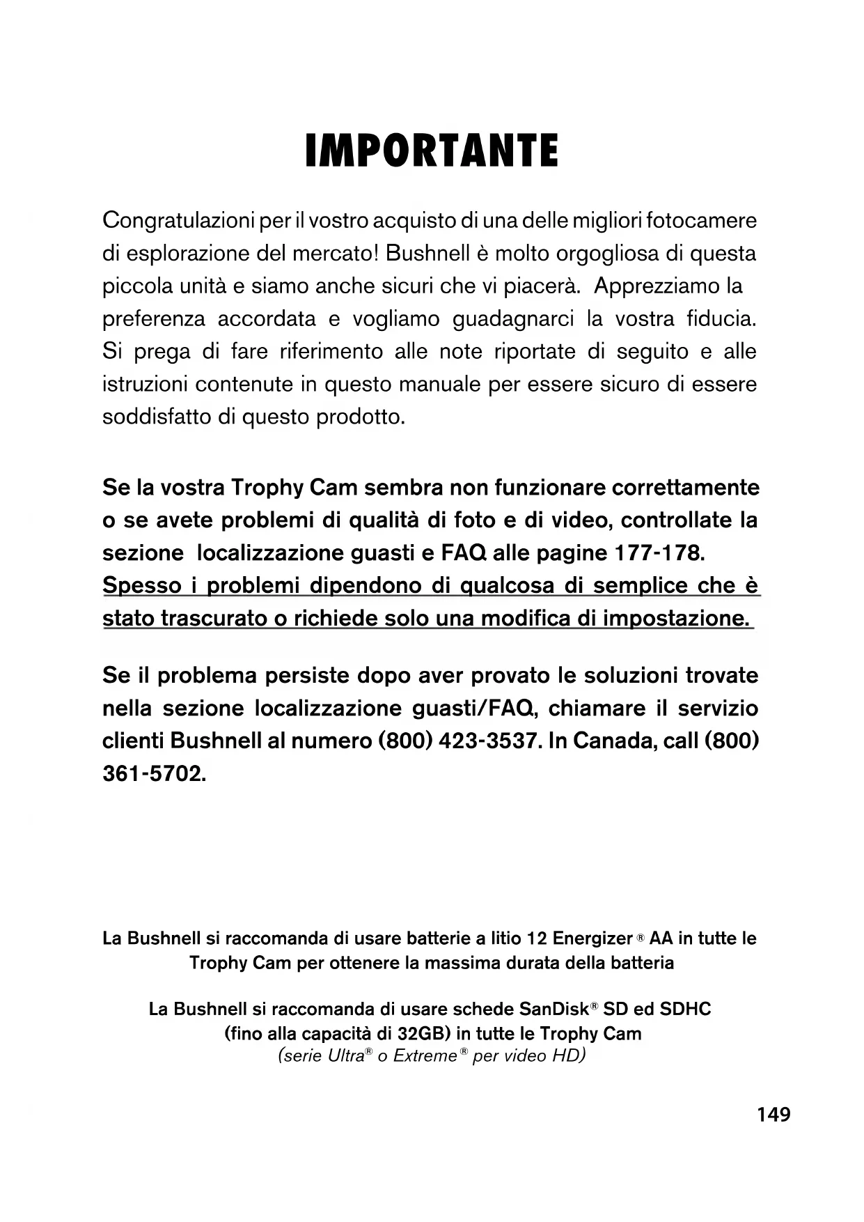 No modelli: 119466 / 119467 LitNo-98-2019 / 4-11 ITALIANO VIDEO149 IMPORTANTE Congratulazioni per il vostro acquisto di una delle migliori fotocamere di esplorazione del mercato! Bushnell è molto orgogliosa di questa piccola unità e siamo anche sicuri che vi piacerà. Apprezziamo la preferenza accordata e vogliamo guadagnarci la vostra fiducia. Si prega di fare riferimento alle note riportate di seguito e alle istruzioni contenute in questo manuale per essere sicuro di essere soddisfatto di questo prodotto. Se la vostra Trophy Cam sembra non funzionare correttamente o se avete problemi di qualità di foto e di video, controllate la sezione localizzazione guasti e FAQ alle pagine 177-178. Spesso i problemi dipendono di qualcosa di semplice che è stato trascurato o richiede solo una modifica di impostazione. Se il problema persiste dopo aver provato le soluzioni trovate nella sezione localizzazione guasti/FAQ, chiamare il servizio clienti Bushnell al numero (800) 423-3537. In Canada, call (800) 361-5702. La Bushnell si raccomanda di usare batterie a litio 12 Energizer
