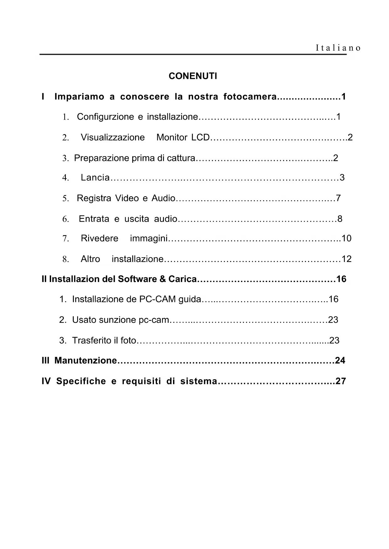 III Manutenzione……………………………………………………….……24 IV Specifiche e requisiti di sistema……………………………....27Italiano
