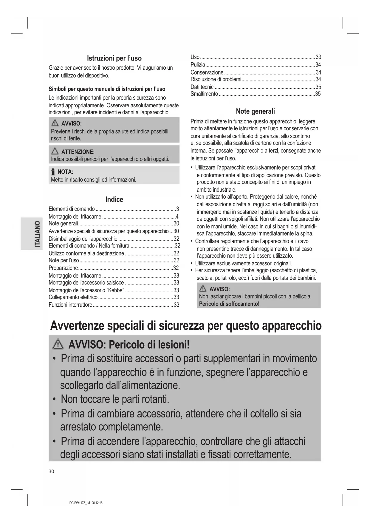 - Usare questa macchina esclusivamente per la lavorazione degli alimenti. L’abuso per altre finalità può causare lesioni.PC-FW1173_IM 20.12.18