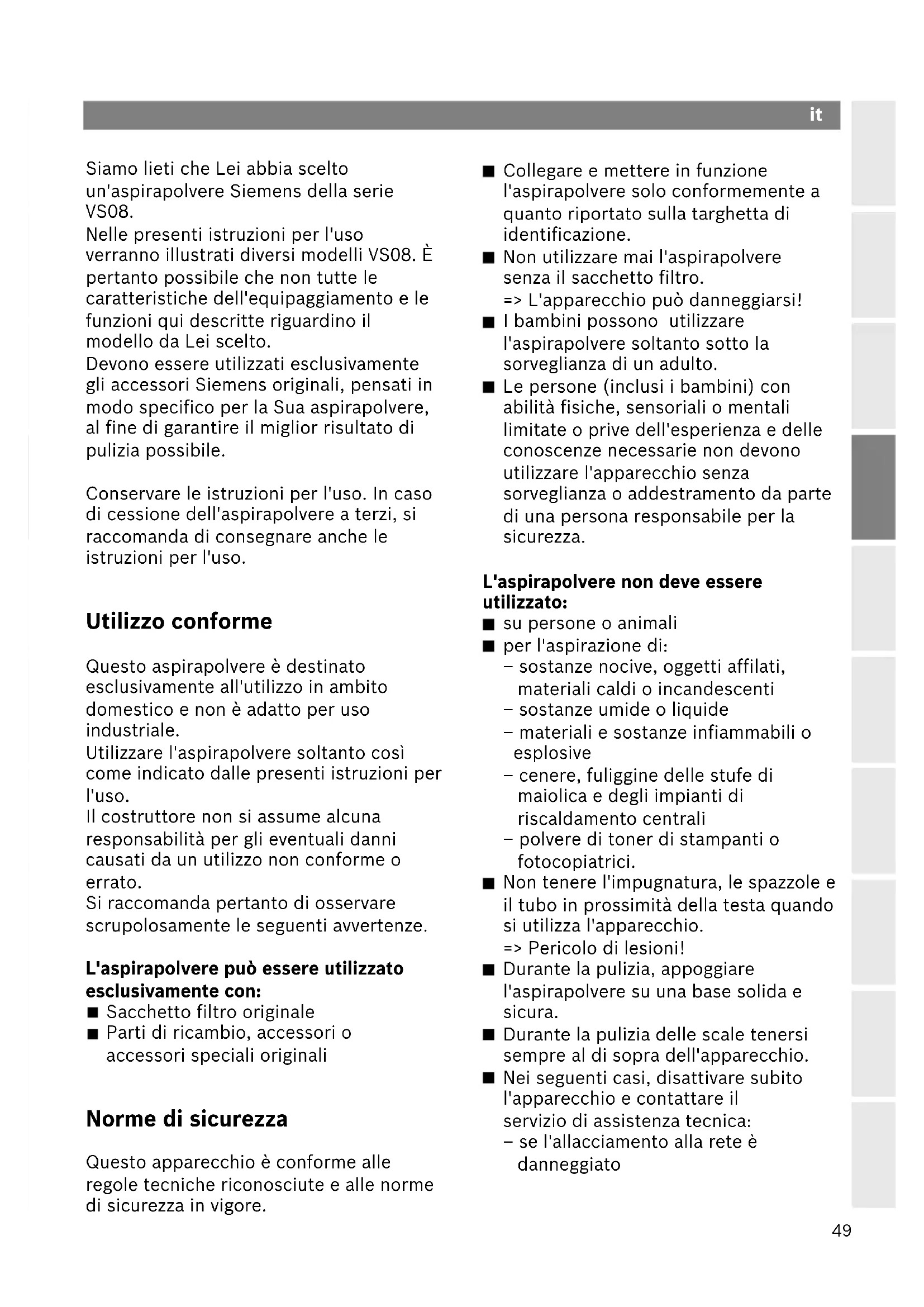 Siamo lieti che Lei abbia scelto un'aspirapolvere Siemens della serie VS08. Nelle presenti istruzioni per l'uso verranno illustrati diversi modelli VS08. È pertanto possibile che non tutte le caratteristiche dell'equipaggiamento e le funzioni qui descritte riguardino il modello da Lei scelto. Devono essere utilizzati esclusivamente gli accessori Siemens originali, pensati in modo specifico per la Sua aspirapolvere, al fine di garantire il miglior risultato di pulizia possibile. Conservare le istruzioni per l'uso. In caso di cessione dell'aspirapolvere a terzi, si raccomanda di consegnare anche le istruzioni per l'uso. Utilizzo conforme Questo aspirapolvere è destinato esclusivamente all'utilizzo in ambito domestico e non è adatto per uso industriale. Utilizzare l'aspirapolvere soltanto così come indicato dalle presenti istruzioni per l'uso. Il costruttore non si assume alcuna responsabilità per gli eventuali danni causati da un utilizzo non conforme o errato. Si raccomanda pertanto di osservare scrupolosamente le seguenti avvertenze. L'aspirapolvere può essere utilizzato esclusivamente con: Sacchetto filtro originale Parti di ricambio, accessori o accessori speciali originali Norme di sicurezza Questo apparecchio è conforme alle regole tecniche riconosciute e alle norme di sicurezza in vigore. Collegare e mettere in funzione l'aspirapolvere solo conformemente a quanto riportato sulla targhetta di identificazione. Non utilizzare mai l'aspirapolvere senza il sacchetto filtro. => L'apparecchio può danneggiarsi! I bambini possono utilizzare l'aspirapolvere soltanto sotto la sorveglianza di un adulto. Le persone (inclusi i bambini) con abilità fisiche, sensoriali o mentali limitate o prive dell'esperienza e delle conoscenze necessarie non devono utilizzare l'apparecchio senza sorveglianza o addestramento da parte di una persona responsabile per la sicurezza. L'aspirapolvere non deve essere utilizzato: su persone o animali per l'aspirazione di: – sostanze nocive, oggetti affilati, materiali caldi o incandescenti – sostanze umide o liquide – materiali e sostanze infiammabili o esplosive – cenere, fuliggine delle stufe di maiolica e degli impianti di riscaldamento centrali – polvere di toner di stampanti o fotocopiatrici. Non tenere l'impugnatura, le spazzole e il tubo in prossimità della testa quando si utilizza l'apparecchio. => Pericolo di lesioni! Durante la pulizia, appoggiare l'aspirapolvere su una base solida e sicura. Durante la pulizia delle scale tenersi sempre al di sopra dell'apparecchio. Nei seguenti casi, disattivare subito l'apparecchio e contattare il servizio di assistenza tecnica: – se l'allacciamento alla rete è danneggiato it50 – se è stato inavvertitamente aspirato del liquido o se all'interno dell'apparecchio è presente del liquido – se l'apparecchio è caduto. Non utilizzare il cavo di allacciamento alla rete per tirare/trasportare l'aspirapolvere. In caso di uso prolungato, estrarre completamente il cavo di collegamento alla rete elettrica. Per staccare l'apparecchio dalla rete, afferrare la spina senza tirare il cavo di collegamento alla rete elettrica. Non far passare il cavo di collegamento alla rete elettrica su bordi affilati e non schiacciarlo. Staccare la spina dalla rete elettrica prima di effettuare lavori sull'aspirapolvere o sugli accessori. Non mettere in funzione l'apparecchio se danneggiato. In caso di anomalia, staccare la spina dalla rete elettrica. Per evitare pericoli, le riparazioni e le sostituzioni delle parti di ricambio dell’aspirapolvere devono essere effettuate esclusivamente dal servizio di assistenza tecnica autorizzato. Proteggere l'aspirapolvere dal maltempo, dall'umidità e dalle fonti di calore. L'aspirapolvere non è adatto all'uso nei cantieri. => L'aspirazione di macerie può causare il danneggiamento dell'apparecchio. Disattivare l'apparecchio quando non lo si usa. Gli apparecchi dismessi devono essere resi immediatamente inutilizzabili, per essere poi smaltiti in conformità alle normative vigenti in materia. Tenere fuori dalla portata dei bambini i sacchetti di plastica e le pellicole di imballaggio e smaltirli correttamente (pericolo di soffocamento). non versare sostanze infiammabili o contenenti alcool sui filtri (sacchetto filtro, filtro di protezione motore, filtro aria, ecc.). Avvertenze per lo smaltimento Imballaggio L'imballaggio protegge l'aspirapolvere da eventuali danni durante il trasporto. È costituito da materiali non inquinanti e può pertanto essere riciclato. Provvedere allo smaltimento dei materiali di imballaggio non più necessari rivolgendosi ai centri di raccolta per il sistema di riciclaggio "Punto verde". Apparecchio dismesso Gli apparecchi dismessi contengono ancora molteplici materiali preziosi. Si consiglia pertanto di restituire l'apparecchio dismesso al proprio rivenditore o presso un centro di riciclaggio. Per informazioni sulle modalità del riciclaggio, rivolgersi al proprio rivenditore o all'amministrazione comunale della propria città. Smaltimento del filtro e del sacchetto filtro Il filtro e il sacchetto filtro sono realizzati con materiali non inquinanti. Poiché sia il filtro che il sacchetto filtro non contengono alcune sostanze nocive è possibile smaltirli con i rifiuti domestici.