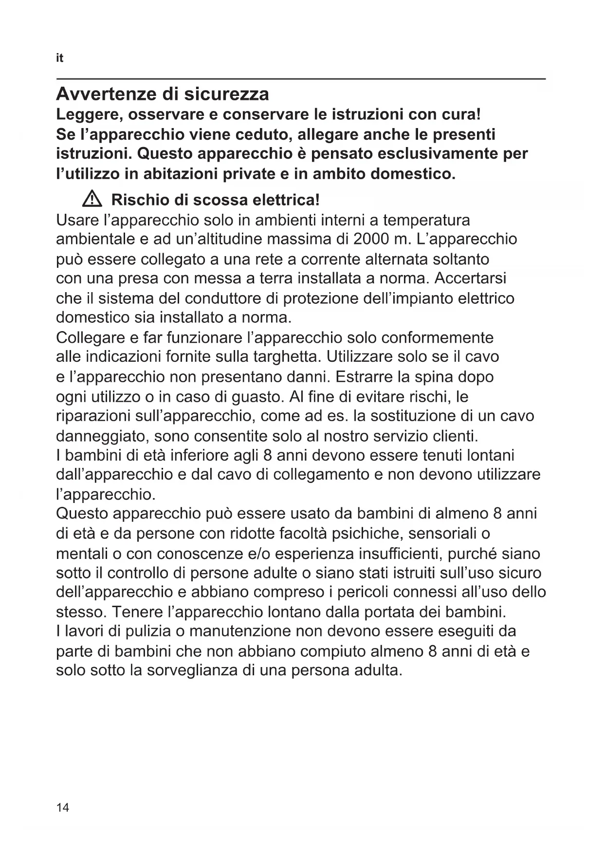 Avvertenze di sicurezza Leggere, osservare e conservare le istruzioni con cura! Se l’apparecchio viene ceduto, allegare anche le presenti istruzioni. Questo apparecchio è pensato esclusivamente per l’utilizzo in abitazioni private e in ambito domestico. W Rischio di scossa elettrica! Usare l’apparecchio solo in ambienti interni a temperatura ambientale e ad un’altitudine massima di 2000 m. L’apparecchio può essere collegato a una rete a corrente alternata soltanto con una presa con messa a terra installata a norma. Accertarsi che il sistema del conduttore di protezione dell’impianto elettrico domestico sia installato a norma. Collegare e far funzionare l’apparecchio solo conformemente alle indicazioni fornite sulla targhetta. Utilizzare solo se il cavo e l’apparecchio non presentano danni. Estrarre la spina dopo ogni utilizzo o in caso di guasto. Al ne di evitare rischi, le riparazioni sull’apparecchio, come ad es. la sostituzione di un cavo danneggiato, sono consentite solo al nostro servizio clienti. I bambini di età inferiore agli 8 anni devono essere tenuti lontani dall’apparecchio e dal cavo di collegamento e non devono utilizzare l’apparecchio. Questo apparecchio può essere usato da bambini di almeno 8 anni di età e da persone con ridotte facoltà psichiche, sensoriali o mentali o con conoscenze e/o esperienza insucienti, purché siano sotto il controllo di persone adulte o siano stati istruiti sull’uso sicuro dell’apparecchio e abbiano compreso i pericoli connessi all’uso dello stesso. Tenere l’apparecchio lontano dalla portata dei bambini. I lavori di pulizia o manutenzione non devono essere eseguiti da parte di bambini che non abbiano compiuto almeno 8 anni di età e solo sotto la sorveglianza di una persona adulta.15