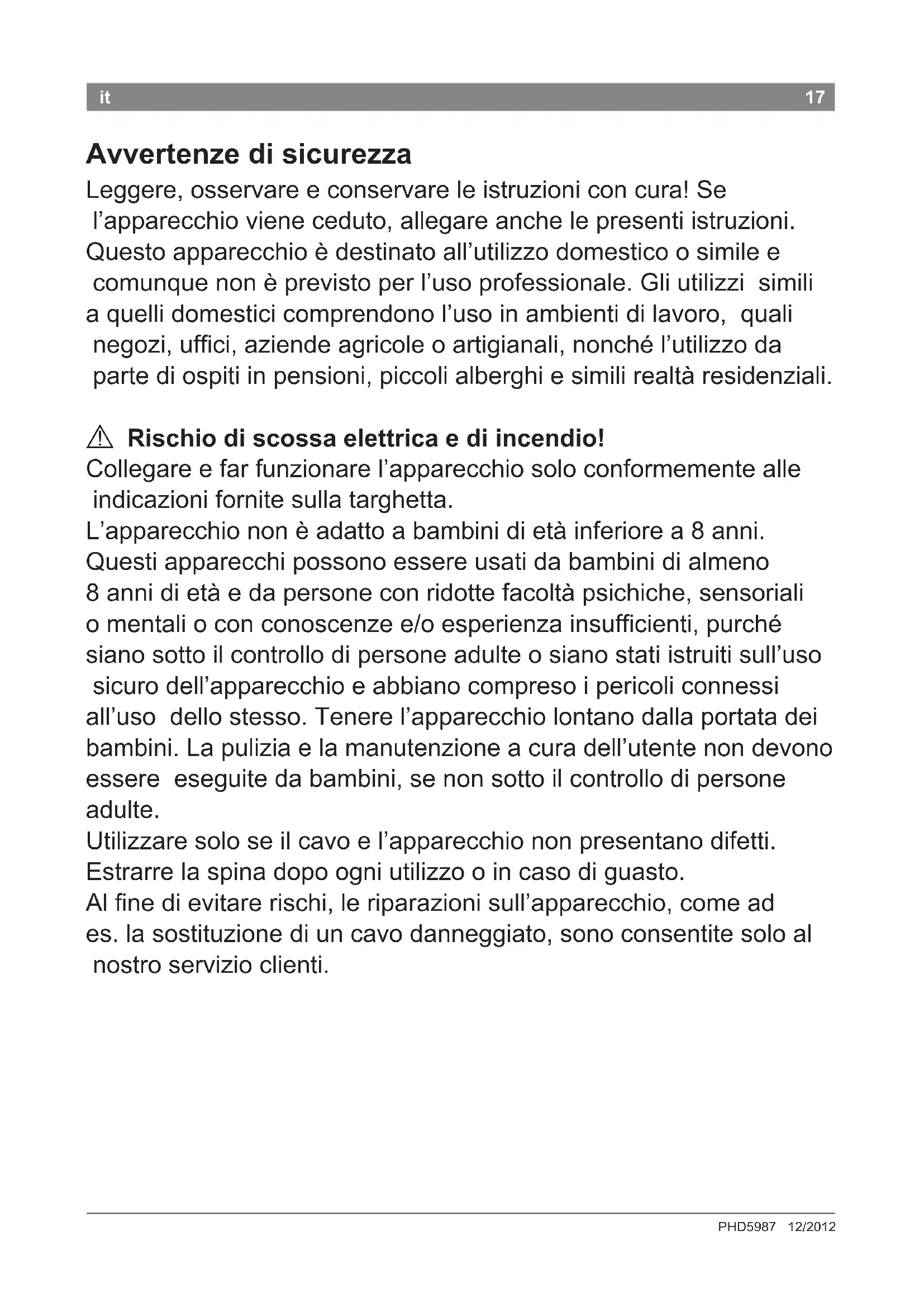 Pericolo di ustione! Il convogliatore del getto d’aria e il diffusore possono diventare molto caldi. Prima di rimuoverli, lasciarli raffreddare.19 PHD5987 12/2012 19it Congratulazioni per l’acquisto di questo apparecchio del nostro marchio Bosch. Avete acquistato un prodotto estremamente valido e ne sarete molto soddisfatti. Le presenti istruzioni per l'uso descrivono un asciugacapelli con accessori. Elementi di comando ed accessori 1 Interruttore bipolare per la temperatura k 2 Interruttore bipolare per la ventola l 3 Tasto / Keratin, illuminato 4 Tasto turbo 5 Tasto getto d’aria fredda 3 6 Indicatore LED Acceso costantemente in rosso per la ionizzazione 7 Griglia ltro aria smontabile 8 Concentratore del getto d ’aria 9 Gancio 10 Diffusore Utilizzo Importante: ● Non coprire mai la ventola o il foro di aspirazione. ● Assicurarsi che il foro di aspirazione resti privo di pelucchi e capelli. ● In caso di surriscaldamento, ad esempio se il foro di aspirazione viene coperto, l’asciugacapelli si spegne automatica- mente e riprende a funzionare dopo pochi minuti. Per la prima asciugatura di capelli tam- ponati solo con asciugamano, scegliere il livello 3 per la temperatura e il livello 2 per la ventola: Interruttore bipolare per la temperatura k : 1 basso 2 medio 3 alto Interruttore bipolare per la ventola l : 0 spento 1 delicato 2 forte Tenere il foro della ventola a circa 10 cm dalla testa.20 Robert Bosch Hausgeräte GmbH 20 it Ionizzazione permanente Questo asciugacapelli è dotato della fun- zione di ionizzazione continua. Gli ioni sono particelle elettricamente cariche presenti in natura, che vengono generati nell’asciuga- capelli mediante un generatore di ioni. In questo modo i capelli diventano più mor- bidi e più facili al pettine e si riduce la carica statica dei capelli, vale a dire lo “svolazzare” dei capelli (= effetto anti-statico). La funzione di ionizzazione non può essere disattivata. L’indicatore LED è costante- mente accesso in rosso. Tasto