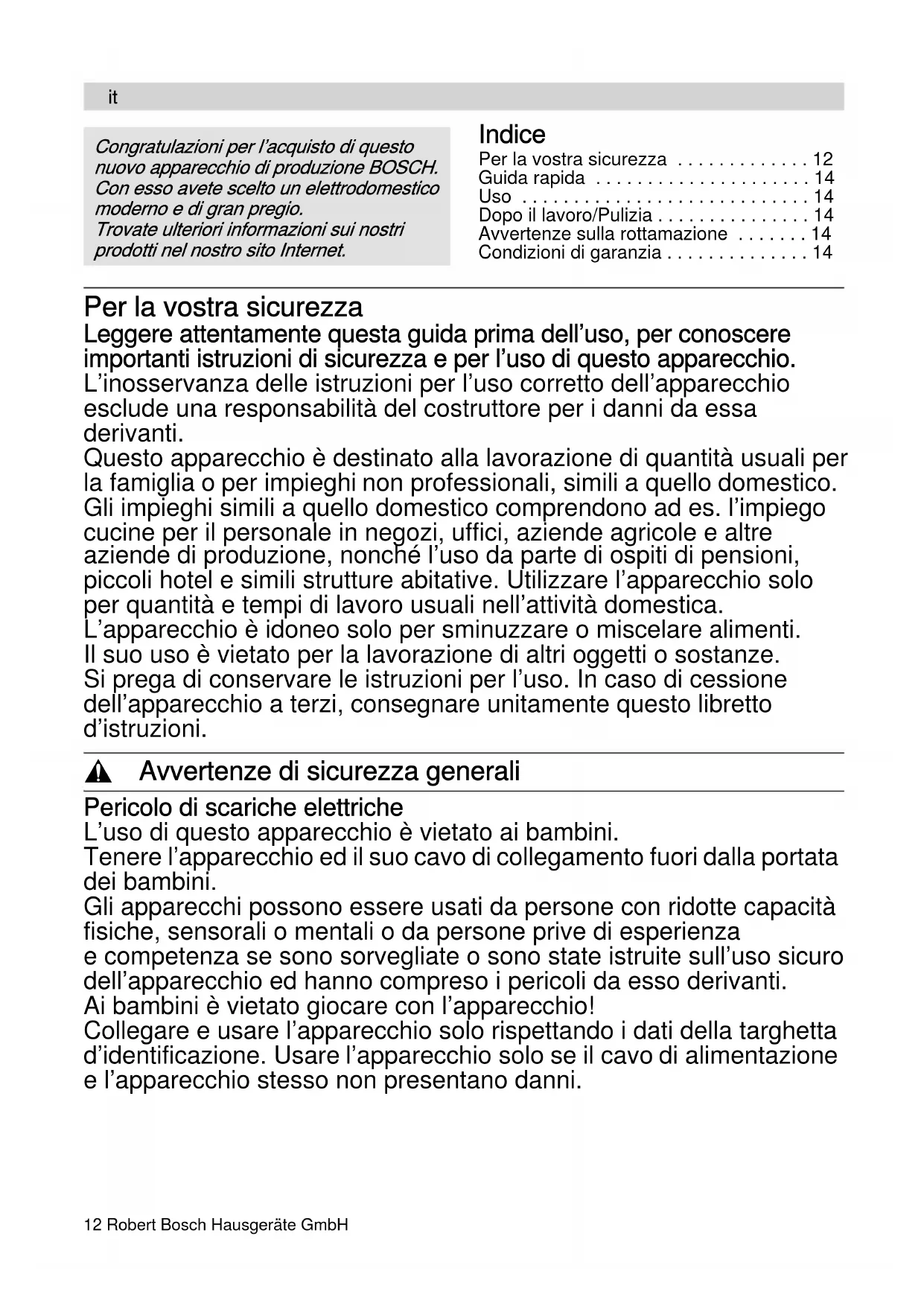 - Sous réserve de modifications.12 Robert Bosch Hausgeräte GmbH Indice Per la vostra sicurezza p. 12