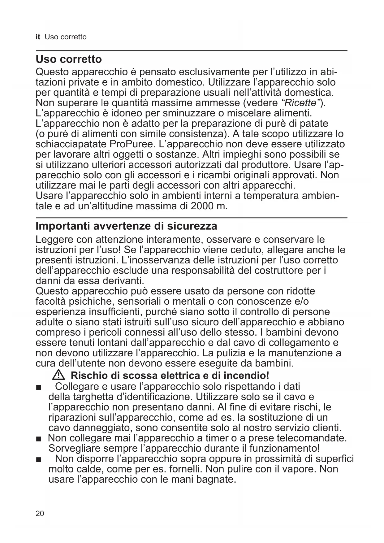 Eliminez l’emballage en respectant l’environnement. Cet appareil est marqué selon la directive européenne 2012/19/UE relative aux appareils électriques et électroniques usagés (waste electrical and electronic equip- ment – WEEE). La directive définit le cadre pour une reprise et une récupération des appareils usagés applicables dans les pays de la CE. S’informer auprès du revendeur sur la procédure actuelle de recyclage. Garantie Les conditions de garantie applicables sont celles publiées par notre distributeur GDQVOHSD\VRDpWpHႇHFWXpO¶DFKDW/H revendeur chez qui vous vous êtes procuré l’appareil fournira les modalités de garantie sur simple demande de votre part. En cas de recours en garantie, veuillez toujours vous munir de la preuve d’achat. 6RXVUpVHUYHGHPRGL¿FDWLRQV20 it Uso corretto Uso corretto Questo apparecchio è pensato esclusivamente per l’utilizzo in abi- tazioni private e in ambito domestico. Utilizzare l’apparecchio solo per quantità e tempi di preparazione usuali nell’attività domestica. Non superare le quantità massime ammesse (vedere “Ricette”). L’apparecchio è idoneo per sminuzzare o miscelare alimenti. L’apparecchio non è adatto per la preparazione di purè di patate (o purè di alimenti con simile consistenza). A tale scopo utilizzare lo schiacciapatate ProPuree. L’apparecchio non deve essere utilizzato per lavorare altri oggetti o sostanze. Altri impieghi sono possibili se si utilizzano ulteriori accessori autorizzati dal produttore. Usare l’ap- parecchio solo con gli accessori e i ricambi originali approvati. Non utilizzare mai le parti degli accessori con altri apparecchi. Usare l’apparecchio solo in ambienti interni a temperatura ambien- tale e ad un’altitudine massima di 2000 m. Importanti avvertenze di sicurezza Leggere con attenzione interamente, osservare e conservare le istruzioni per l’uso! Se l’apparecchio viene ceduto, allegare anche le presenti istruzioni. L’inosservanza delle istruzioni per l’uso corretto dell’apparecchio esclude una responsabilità del costruttore per i danni da essa derivanti. Questo apparecchio può essere usato da persone con ridotte facoltà psichiche, sensoriali o mentali o con conoscenze e/o esperienza insufficienti, purché siano sotto il controllo di persone adulte o siano stati istruiti sull’uso sicuro dell’apparecchio e abbiano compreso i pericoli connessi all’uso dello stesso. I bambini devono essere tenuti lontani dall’apparecchio e dal cavo di collegamento e non devono utilizzare l’apparecchio. La pulizia e la manutenzione a cura dell’utente non devono essere eseguite da bambini. W Rischio di scossa elettrica e di incendio! Ŷ Collegare e usare l’apparecchio solo rispettando i dati della targhetta d’identificazione. Utilizzare solo se il cavo e l’apparecchio non presentano danni. Al fine di evitare rischi, le riparazioni sull’apparecchio, come ad es. la sostituzione di un cavo danneggiato, sono consentite solo al nostro servizio clienti. Ŷ Non collegare mai l’apparecchio a timer o a prese telecomandate. Sorvegliare sempre l’apparecchio durante il funzionamento! Ŷ Non disporre l’apparecchio sopra oppure in prossimità di superfici molto calde, come per es. fornelli. Non pulire con il vapore. Non usare l’apparecchio con le mani bagnate.21 it Importanti avvertenze di sicurezza Ŷ Non immergere mai l’apparecchio base in liquidi, non metterlo mai sotto l’acqua corrente e non lavarlo in lavastoviglie. Non pulire con il vapore. Non usare l’apparecchio con le mani bagnate. Ŷ Se l’apparecchio cade nell’acqua o in un altro liquido, è vietato continuare a utilizzarlo. Ŷ Immergere il piede frullatore nell’alimento al massimo fino alla marcatura Í, altrimenti vi è il pericolo di scossa elettrica! Ŷ L’apparecchio va sempre scollegato dalla rete elettrica dopo ogni utilizzo, se lasciato incostudito, prima del montaggio, dello smontaggio, della pulizia e in caso di guasto. W Pericolo di lesioni! Ŷ L’apparecchio va sempre scollegato dalla corrente elettrica dopo ogni utilizzo, se lasciato incustodito, prima del montaggio, dello smontaggio, della pulizia e in caso di guasti. Ŷ Dopo avere spento l’apparecchio, l’ingranaggio continua breve- mente a girare. Attendere l’arresto completo dell’ingranaggio. Ŷ Non inserire mai le mani nel bicchiere frullatore. Non pulire mai a mani nude la lama del piede frullatore. W Pericolo di ustioni! Fare attenzione durante la lavorazione di alimenti da frullare bollenti. Gli alimenti da frullare bollenti possono schizzare durante la lavorazione. W Pericolo di soffocamento! Non lasciare che i bambini giochino con il materiale di imballaggio. W Attenzione! Ŷ Si consiglia di non lasciare mai l’apparecchio acceso più a lungo di quanto è necessario per la lavorazione dell’alimento. Non fare girare a vuoto l’apparecchio. Ŷ Il bicchiere frullatore non è idoneo per l’uso nel forno a microonde. Ŷ Non deporre mai il piede frullatore su superfici molto calde, né utilizzarlo in alimenti da frullare bollenti. Prima di lavorare alimenti da frullare bollenti, farli raffreddare ad almeno 80 °C. Se si usa il frullatore ad immersione in una pentola, togliere prima la pentola dal fuoco. W Importante! Lavare sempre a fondo l’apparecchio dopo ogni utilizzo o dopo un lungo periodo di inattività. X “Pulizia” ved. pagina 2322 it Indice 8 Bicchiere frullatore Lavorando nel bicchiere frullatore si evitano spruzzi di alimenti frullati. 9 Coperchio Applicare il coperchio sul bicchiere frullatore per conservare gli alimenti lavorati. Accessori * (vedere le istruzioni per l’uso separate) 10 Frusta per montare con ingranaggio