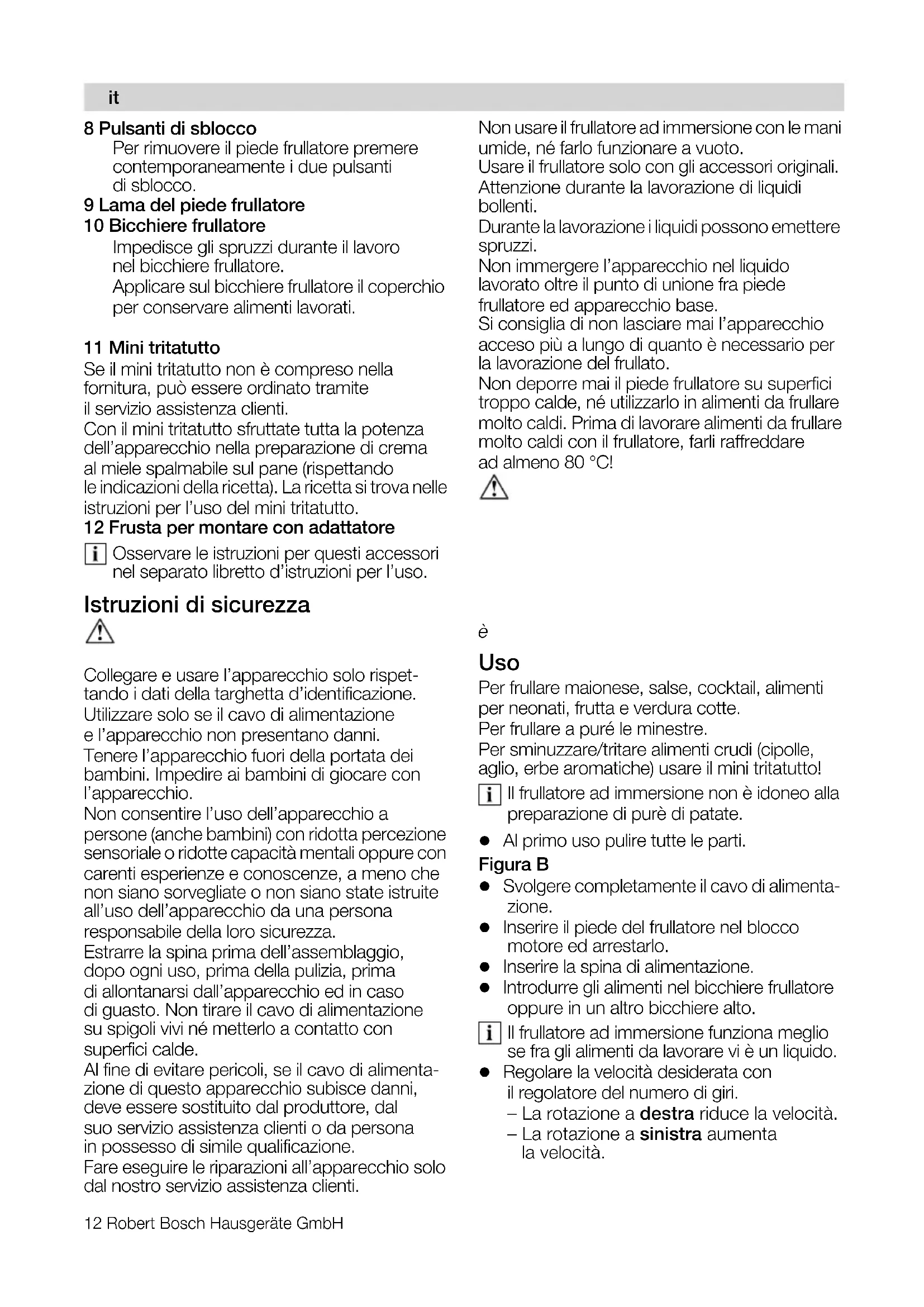 Sous réserve de modifications. `çåÖê~íìä~òáçåá=éÉê=äÛ~Åèìáëíç=Çá=èìÉëíç= åìçîç=~éé~êÉÅÅÜáç=Çá=éêçÇìòáçåÉ=_lp`eK `çå=Éëëç=~îÉíÉ=ëÅÉäíç=ìå=Éä ÉííêçÇçãÉëíáÅç= ãçÇÉêåç=É=Çá=Öê~å=éêÉÖáçK=qêçî~íÉ=ìäíÉêáçêá= áåÑçêã~òáçåá=ëìá=åçëíêá=éêçÇçííá=åÉä=åçëíêç= ëáíç=fåíÉêåÉíK it12 Robert Bosch Hausgeräte GmbH 8 Pulsanti di sblocco Per rimuovere il piede frullatore premere contemporaneamente i due pulsanti di sblocco. 9 Lama del piede frullatore 10 Bicchiere frullatore Impedisce gli spruzzi durante il lavoro nel bicchiere frullatore. Applicare sul bicchiere frullatore il coperchio per conservare alimenti lavorati. få=~äÅìåá=ãçÇÉääáW 11 Mini tritatutto Se il mini tritatutto non è compreso nella fornitura, può essere ordinato tramite il servizio assistenza clienti. Con il mini tritatutto sfruttate tutta la potenza dell’apparecchio nella preparazione di crema al miele spalmabile sul pane (rispettando le indicazioni della ricetta). La ricetta si trova nelle istruzioni per l’uso del mini tritatutto. 12 Frusta per montare con adattatore Osservare le istruzioni per questi accessori nel separato libretto d’istruzioni per l’uso. Istruzioni di sicurezza mÉêáÅçäç=ÑÉêáíÉ mÉêáÅçäç=Çá=ëÅ~êáÅÜÉ=ÉäÉííêáÅÜÉ Collegare e usare l’apparecchio solo rispet- tando i dati della targhetta d’identificazione. Utilizzare solo se il cavo di alimentazione e l’apparecchio non presentano danni. Tenere l’apparecchio fuori della portata dei bambini. Impedire ai bambini di giocare con l’apparecchio. Non consentire l’uso dell’apparecchio a persone (anche bambini) con ridotta percezione sensoriale o ridotte capacità mentali oppure con carenti esperienze e conoscenze, a meno che non siano sorvegliate o non siano state istruite all’uso dell’apparecchio da una persona responsabile della loro sicurezza. Estrarre la spina prima dell’assemblaggio, dopo ogni uso, prima della pulizia, prima di allontanarsi dall’apparecchio ed in caso di guasto. Non tirare il cavo di alimentazione su spigoli vivi né metterlo a contatto con superfici calde. Al fine di evitare pericoli, se il cavo di alimenta- zione di questo apparecchio subisce danni, deve essere sostituito dal produttore, dal suo servizio assistenza clienti o da persona in possesso di simile qualificazione. Fare eseguire le riparazioni all’apparecchio solo dal nostro servizio assistenza clienti. Non usare il frullatore ad immersione con le mani umide, né farlo funzionare a vuoto. Usare il frullatore solo con gli accessori originali. Attenzione durante la lavorazione di liquidi bollenti. Durante la lavorazione i liquidi possono emettere spruzzi. Non immergere l’apparecchio nel liquido lavorato oltre il punto di unione fra piede frullatore ed apparecchio base. Si consiglia di non lasciare mai l’apparecchio acceso più a lungo di quanto è necessario per la lavorazione del frullato. Non deporre mai il piede frullatore su superfici troppo calde, né utilizzarlo in alimenti da frullare molto caldi. Prima di lavorare alimenti da frullare molto caldi con il frullatore, farli raffreddare ad almeno 80 °C! mÉêáÅçäç=Çá=ÑÉêáíÉ=Ç~=ä~ãÉ=í~ÖäáÉåíáL áåÖê~å~ÖÖáç=áå=êçí~òáçåÉ kçå=íçÅÅ~êÉ=ã~á=ä~=ä~ã~=~ä=éáÉÇÉ=ÇÉä=Ñêìää~íçêÉK= kçå=éìäáêÉ=ã~á=~=ã~åá=åìÇÉ=ä~=ä~ã~=ÇÉä=éáÉÇÉ= Ñêìää~íçêÉK=rë~êÉ=ìå~=ëé~òòçä~K fãéçêí~åíÉ> ^ééäáÅ~êÉ=É=êáãìçîÉêÉ=áä=éáÉÇÉ=ÇÉä=Ñêìää~íçêÉ= ëçäç=èì~åÇç=äÛ~éé~êÉÅÅÜáç=≠=ÑÉêãçK Uso Per frullare maionese, salse, cocktail, alimenti per neonati, frutta e verdura cotte. Per frullare a puré le minestre. Per sminuzzare/tritare alimenti crudi (cipolle, aglio, erbe aromatiche) usare il mini tritatutto! Il frullatore ad immersione non è idoneo alla preparazione di purè di patate. Al primo uso pulire tutte le parti. Figura B Svolgere completamente il cavo di alimenta- zione. Inserire il piede del frullatore nel blocco motore ed arrestarlo. Inserire la spina di alimentazione. Introdurre gli alimenti nel bicchiere frullatore oppure in un altro bicchiere alto. Il frullatore ad immersione funziona meglio se fra gli alimenti da lavorare vi è un liquido. Regolare la velocità desiderata con il regolatore del numero di giri. – La rotazione a destra riduce la velocità. – La rotazione a sinistra aumenta la velocità. itRobert Bosch Hausgeräte GmbH 13 In generale per la lavorazione di alimenti si consiglia la velocità turbo. Per liquidi, alimenti molto caldi e per incorporare (ad es. müsli in yogurt) si consiglia, di utilizzare la velocità regolata. In alcuni modelli: La velocità regolata nell’azionamento del pulsante di accensione è indicata dall’indi- catore di velocità. Quanti più segmenti si accendono tanto maggiore è la velocità regolata. Mantenere ben fermi frullatore ad immersione e bicchiere. Accendere il frullatore ad immersione pre- mendo il pulsante di accensione desiderato. Il frullatore ad immersione è acceso finché si mantiene premuto il pulsante d’accensione. Per evitare spruzzi di prodotto frullato, premere il pulsante d’accensione solo dopo avere immerso il piede frullatore nell’alimento da frullare. Spegnere il frullatore ad immersione sempre prima di estrarlo dall’alimento frullato. Terminata la lavorazione, rilasciare il pulsante di accensione. Estrarre la spina di alimentazione. Premere i pulsanti di sblocco e staccare il piede frullatore dall’apparecchio principale. Pulizia ^ííÉåòáçåÉ> kçå=áããÉêÖÉêÉ=ã~á=äÛ~éé~êÉ ÅÅÜáç=Ä~ëÉ= áå ~Åèì~I=å¨=ä~î~êäç=áå=ä~î~ëíçîáÖäáÉK kçå=éìäáêÉ=Åçå=~éé~êÉÅÅÜá=~=î~éçêÉ> mçëëáÄáäá=Ç~ååá=~