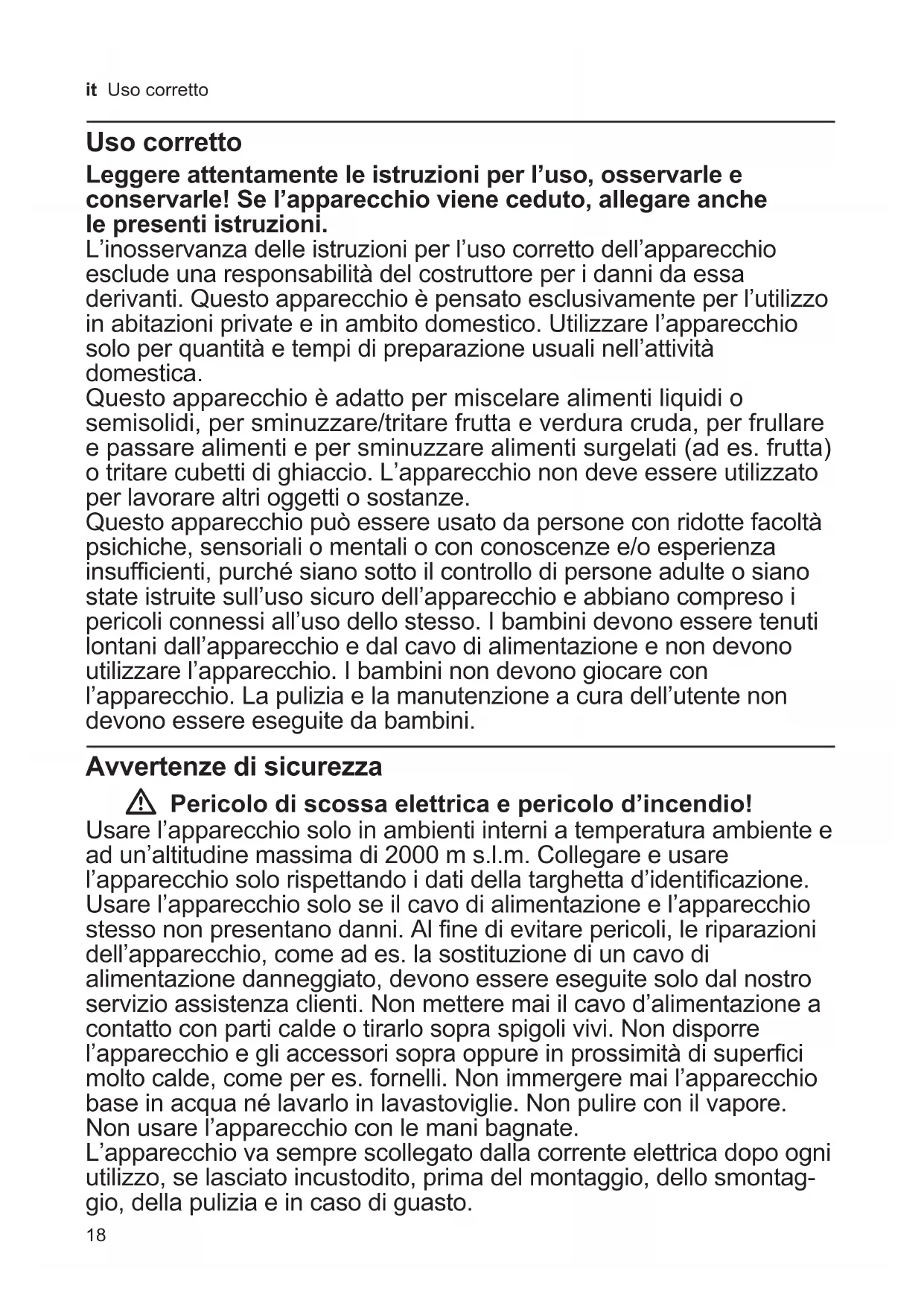 Eliminez l’emballage en respectant l’environnement. Cet appareil est marqué selon la directive européenne 2012/19/UE relative aux appareils électriques et électroniques usagés (waste electrical and electronic equip- ment – WEEE). La directive définit le cadre pour une reprise et une récupération des appareils usagés applicables dans les pays de la CE. S’informer auprès du revendeur sur la procédure actuelle de recyclage. Garantie Les conditions de garantie applicables sont celles publiées par notre distributeur danslepaysoùaétéeffectuél’achat.Le revendeur chez qui vous vous êtes procuré l’appareil fournira les modalités de garantie sur simple demande de votre part. En cas de recours en garantie, veuillez toujours vous munir de la preuve d’achat. Sousréservedemodifications.18 it Uso corretto Uso corretto Leggere attentamente le istruzioni per l’uso, osservarle e conservarle! Se l’apparecchio viene ceduto, allegare anche le presenti istruzioni. L’inosservanza delle istruzioni per l’uso corretto dell’apparecchio esclude una responsabilità del costruttore per i danni da essa derivanti. Questo apparecchio è pensato esclusivamente per l’utilizzo in abitazioni private e in ambito domestico. Utilizzare l’apparecchio solo per quantità e tempi di preparazione usuali nell’attività domestica. Questo apparecchio è adatto per miscelare alimenti liquidi o semisolidi, per sminuzzare/tritare frutta e verdura cruda, per frullare e passare alimenti e per sminuzzare alimenti surgelati (ad es. frutta) o tritare cubetti di ghiaccio. L’apparecchio non deve essere utilizzato per lavorare altri oggetti o sostanze. Questo apparecchio può essere usato da persone con ridotte facoltà psichiche, sensoriali o mentali o con conoscenze e/o esperienza insufficienti, purché siano sotto il controllo di persone adulte o siano state istruite sull’uso sicuro dell’apparecchio e abbiano compreso i pericoli connessi all’uso dello stesso. I bambini devono essere tenuti lontani dall’apparecchio e dal cavo di alimentazione e non devono utilizzare l’apparecchio. I bambini non devono giocare con l’apparecchio. La pulizia e la manutenzione a cura dell’utente non devono essere eseguite da bambini. Avvertenze di sicurezza W Pericolo di scossa elettrica e pericolo d’incendio! Usare l’apparecchio solo in ambienti interni a temperatura ambiente e ad un’altitudine massima di 2000 m s.l.m. Collegare e usare l’apparecchio solo rispettando i dati della targhetta d’identificazione. Usare l’apparecchio solo se il cavo di alimentazione e l’apparecchio stesso non presentano danni. Al fine di evitare pericoli, le riparazioni dell’apparecchio, come ad es. la sostituzione di un cavo di alimentazione danneggiato, devono essere eseguite solo dal nostro servizio assistenza clienti. Non mettere mai il cavo d’alimentazione a contatto con parti calde o tirarlo sopra spigoli vivi. Non disporre l’apparecchio e gli accessori sopra oppure in prossimità di superfici molto calde, come per es. fornelli. Non immergere mai l’apparecchio base in acqua né lavarlo in lavastoviglie. Non pulire con il vapore. Non usare l’apparecchio con le mani bagnate. L’apparecchio va sempre scollegato dalla corrente elettrica dopo ogni utilizzo, se lasciato incustodito, prima del montaggio, dello smontag- gio, della pulizia e in caso di guasto.19