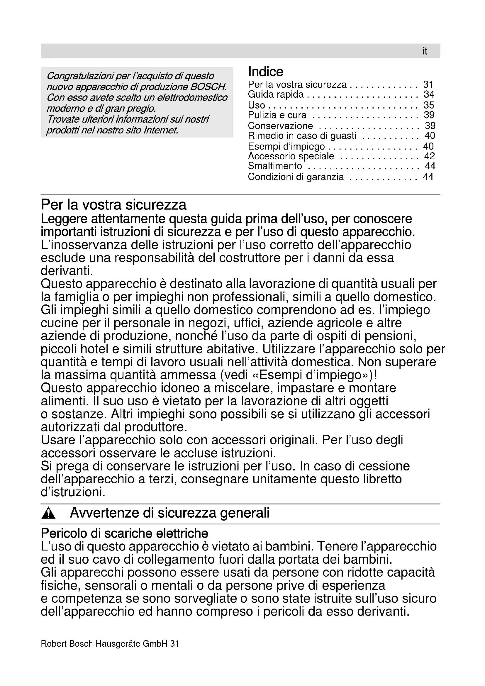 - Sous réserve de modifications.Robert Bosch Hausgeräte GmbH 31 Indice Per la vostra sicurezza p. 31