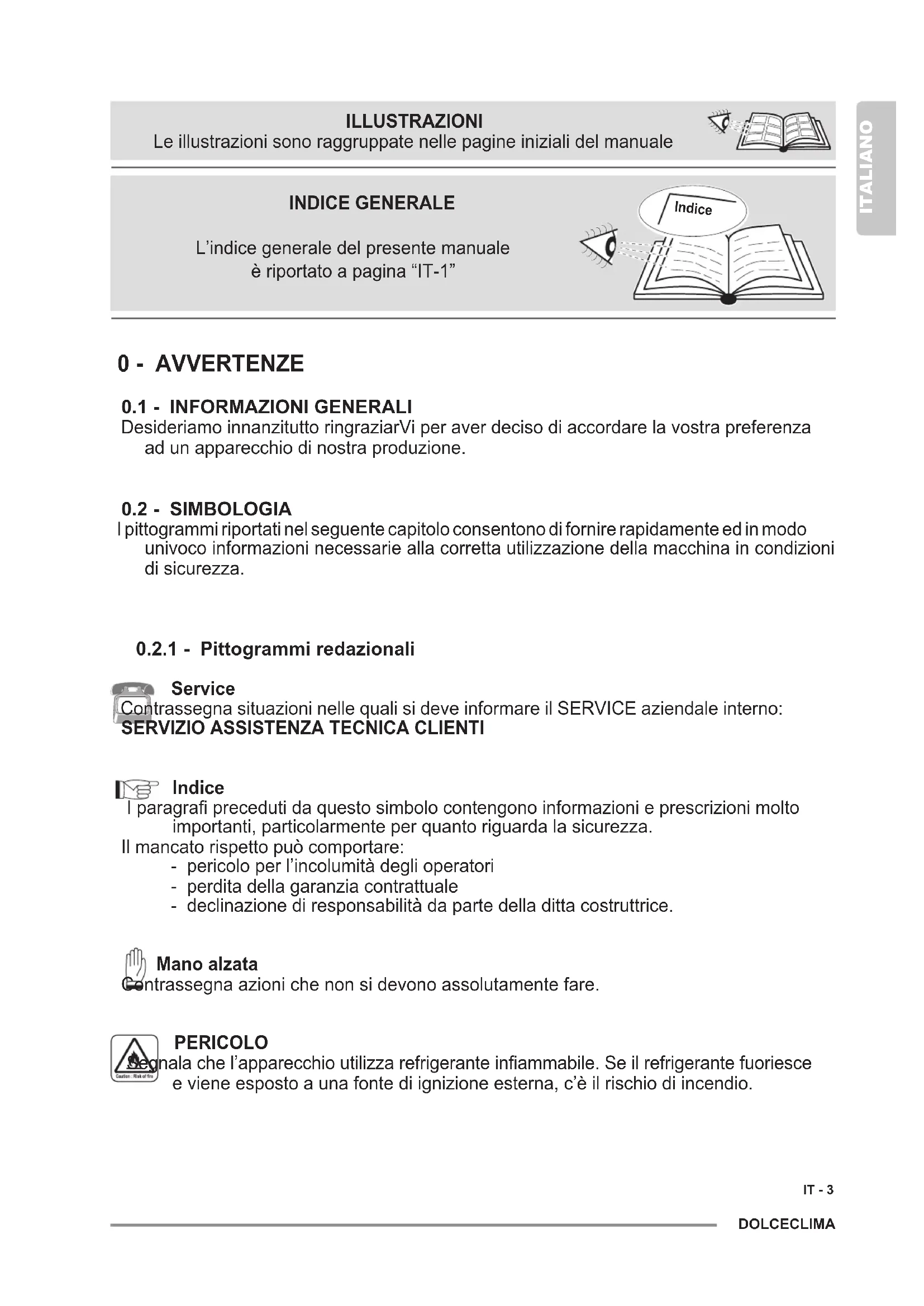 Indice Iparagraprecedutidaquestosimbolocontengonoinformazionieprescrizionimolto importanti,particolarmenteperquantoriguardalasicurezza. Il mancato rispetto può comportare: - pericolo per l’incolumità degli operatori - perdita della garanzia contrattuale - declinazione di responsabilità da parte della ditta costruttrice. Mano alzata Contrassegna azioni che non si devono assolutamente fare. PERICOLO Segnalachel’apparecchioutilizzarefrigeranteinammabile.Seilrefrigerantefuoriesce evieneespostoaunafontediignizioneesterna,c’èilrischiodiincendio. Indice INDICE GENERALE L’indice generale del presente manuale èriportatoapagina“IT-1” ILLUSTRAZIONI Le illustrazioni sono raggruppate nelle pagine iniziali del manualeIT - 4 ITALIANO